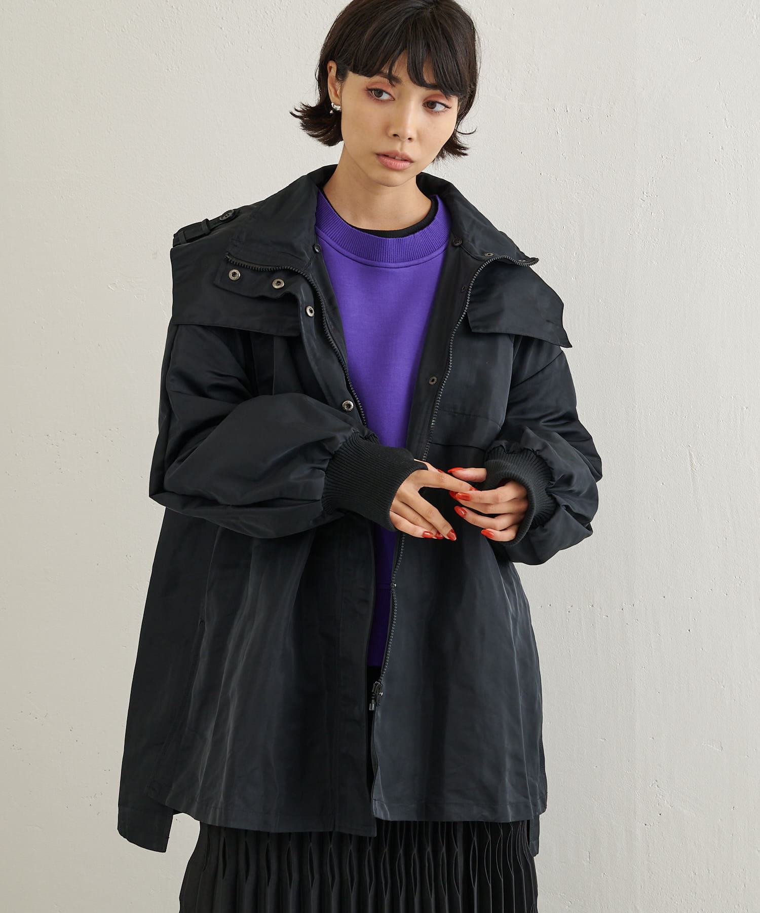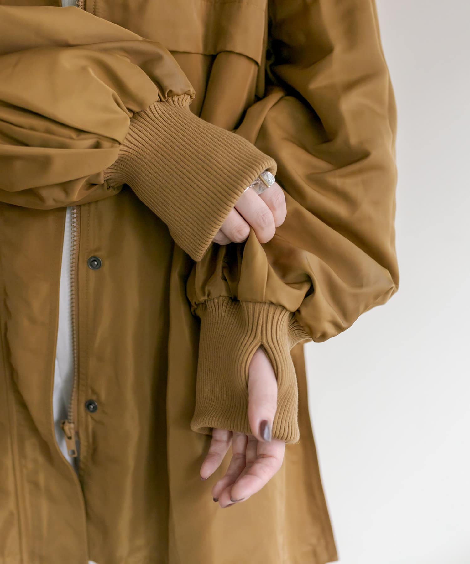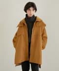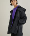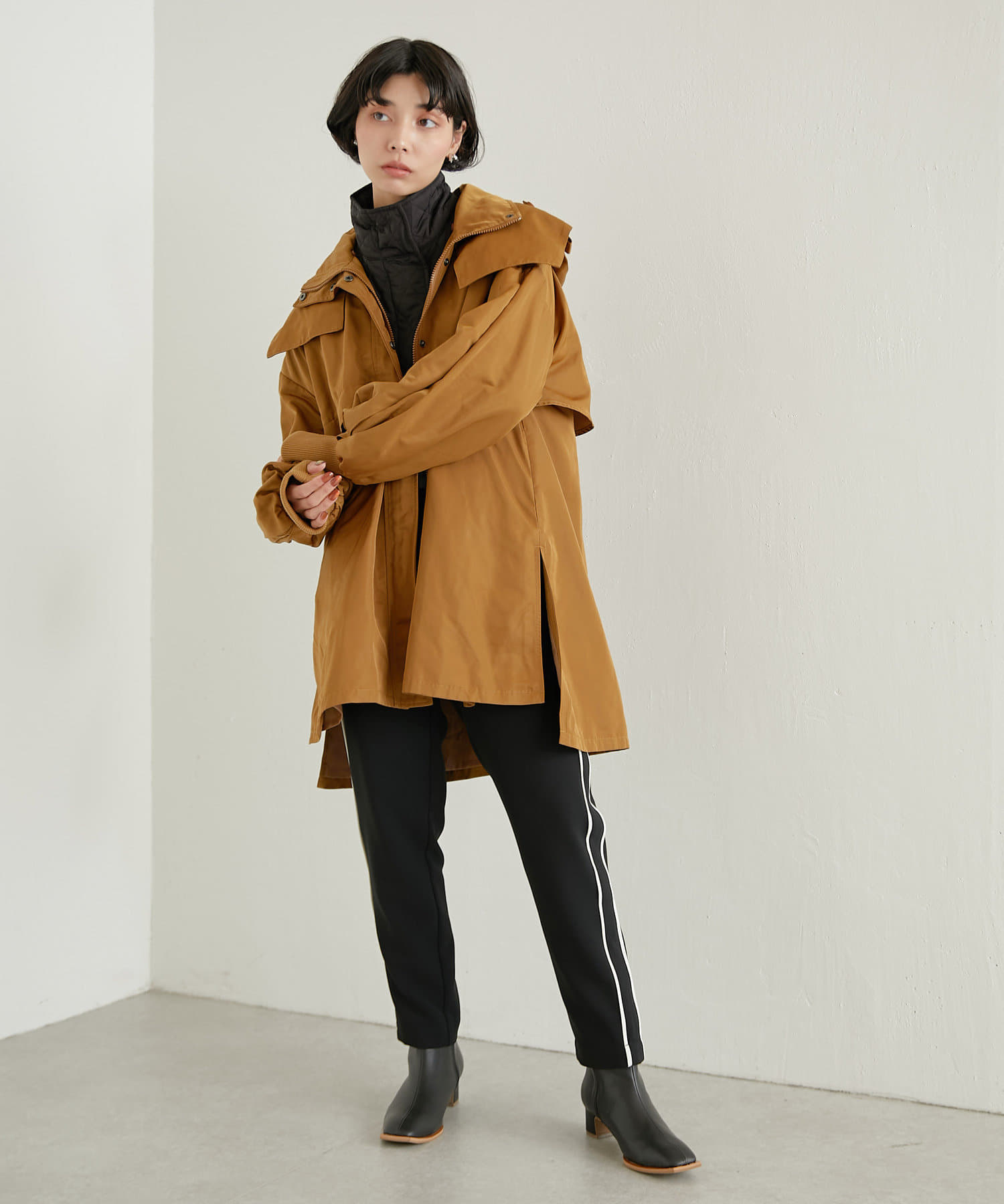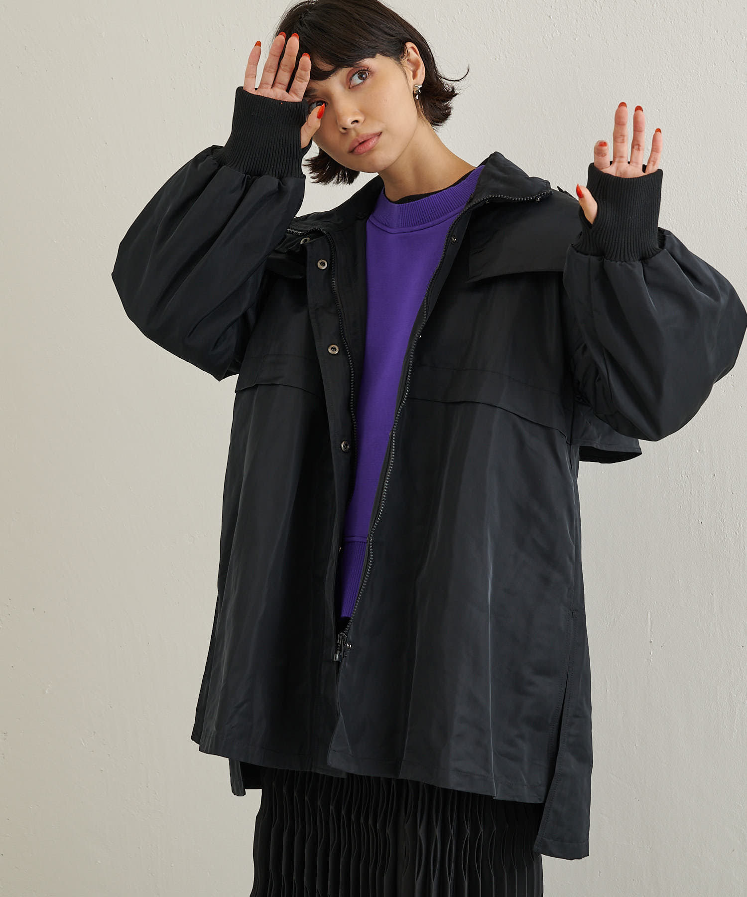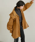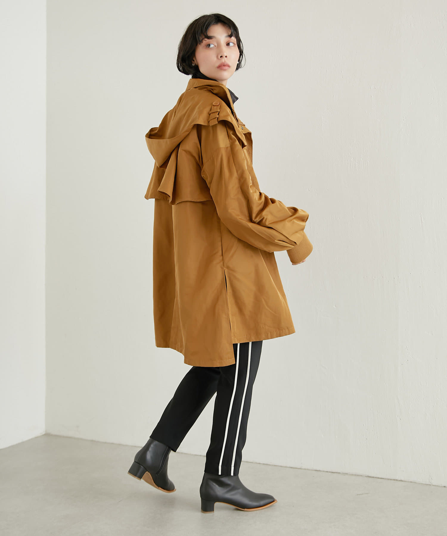 サムホール付きのリブ袖や取り外せるビッグフードなどディテールにこだわった1着。