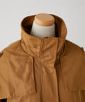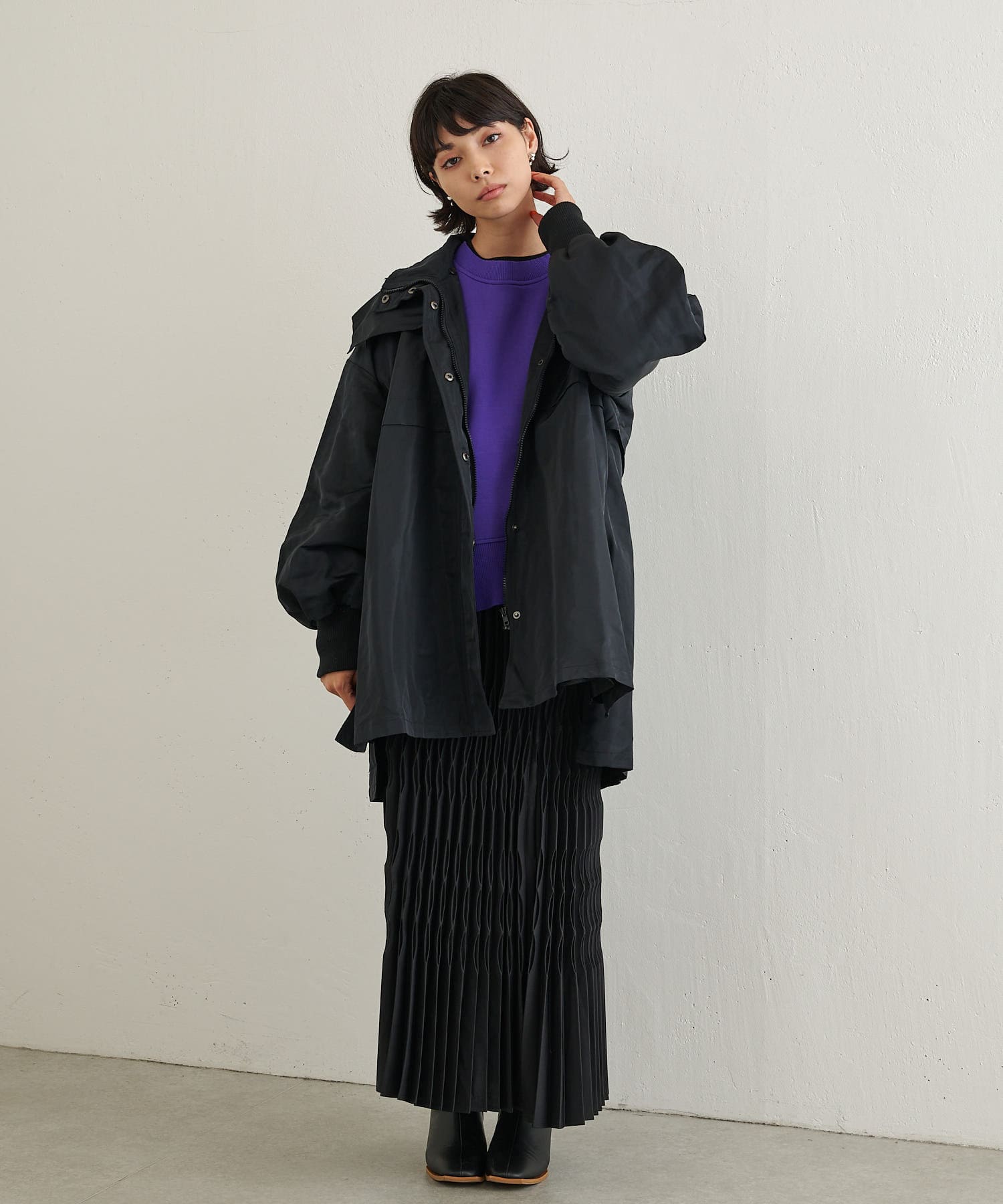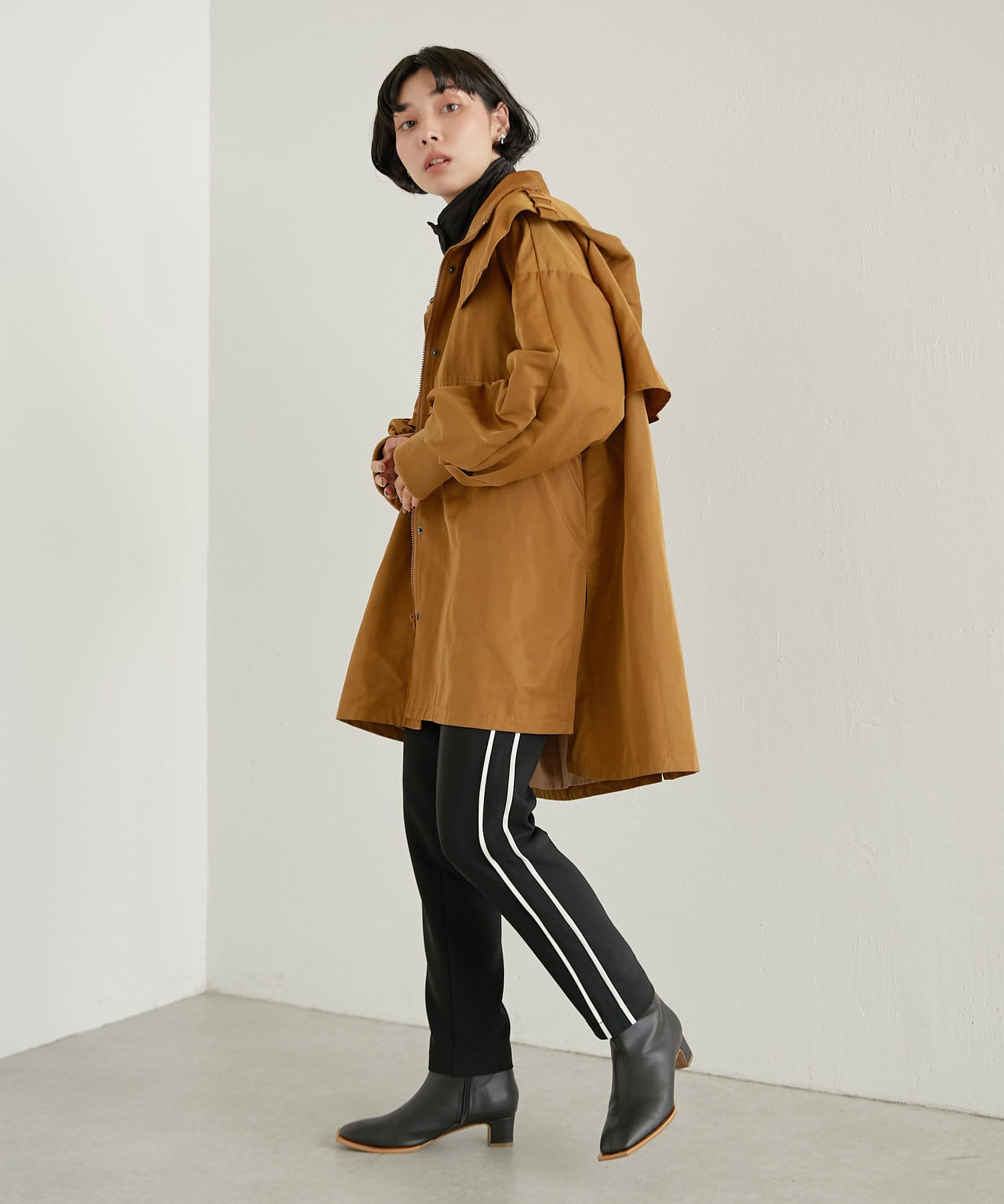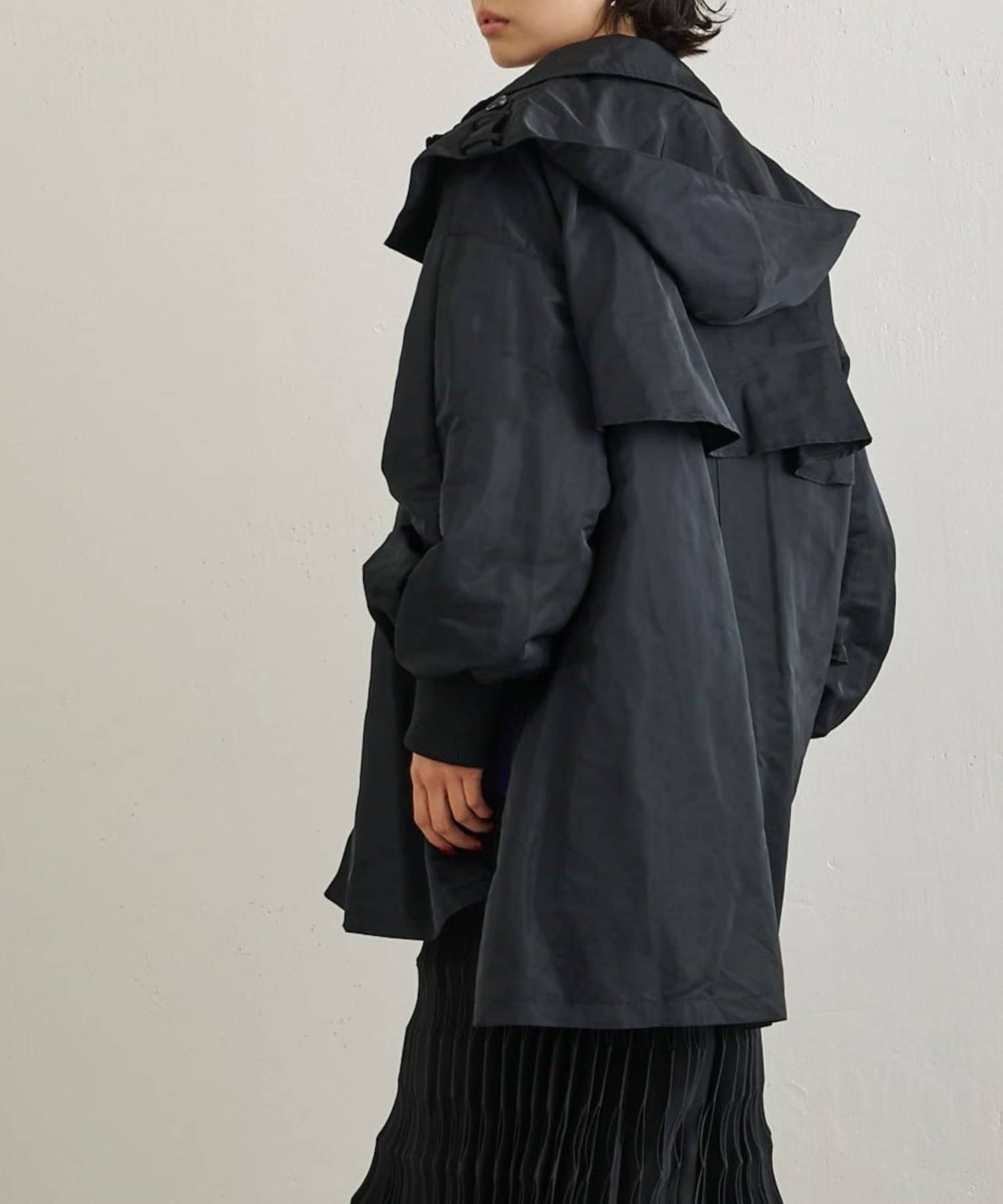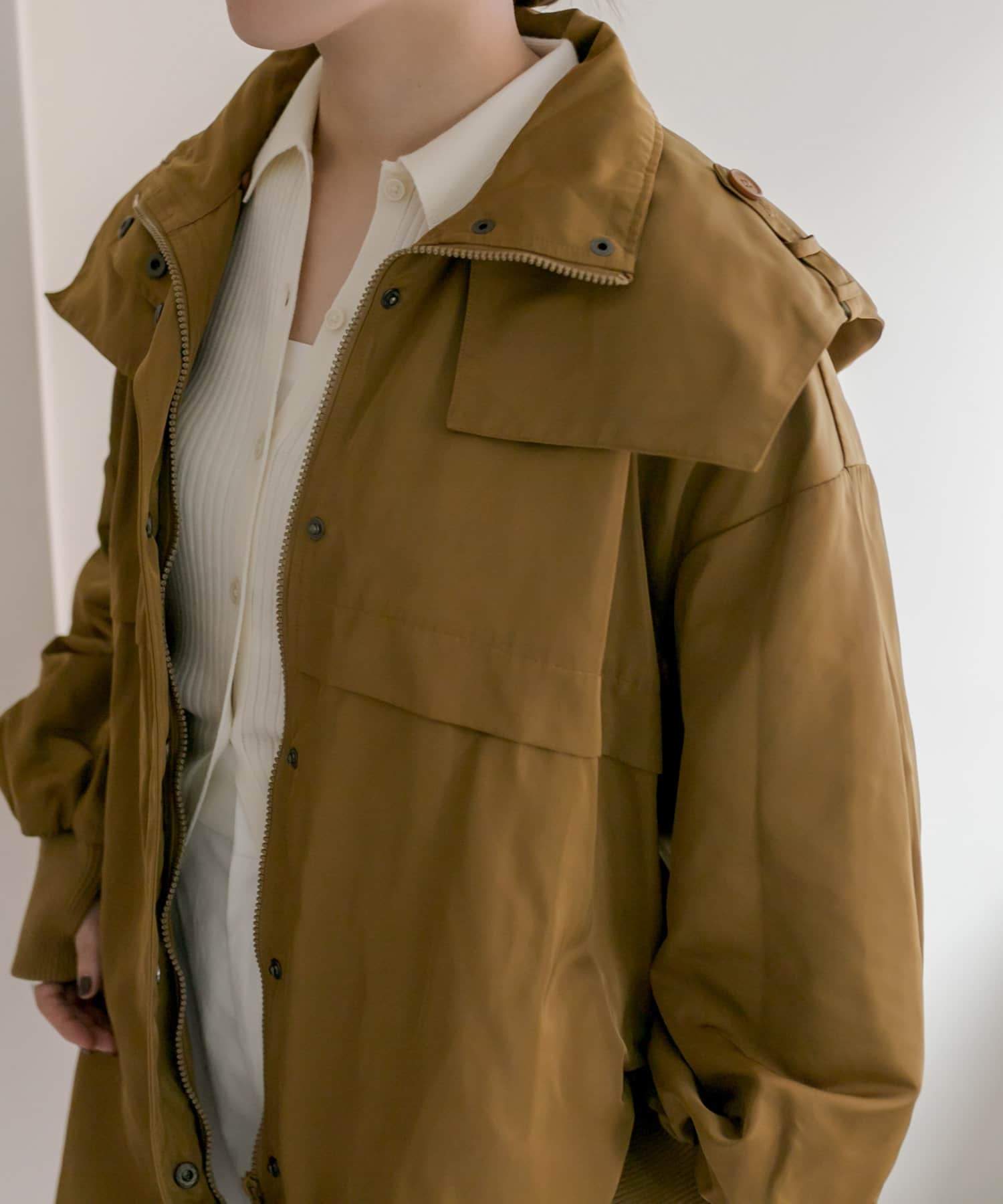 サムホール付きのリブ袖や取り外せるビッグフードなどディテールにこだわった1着。