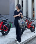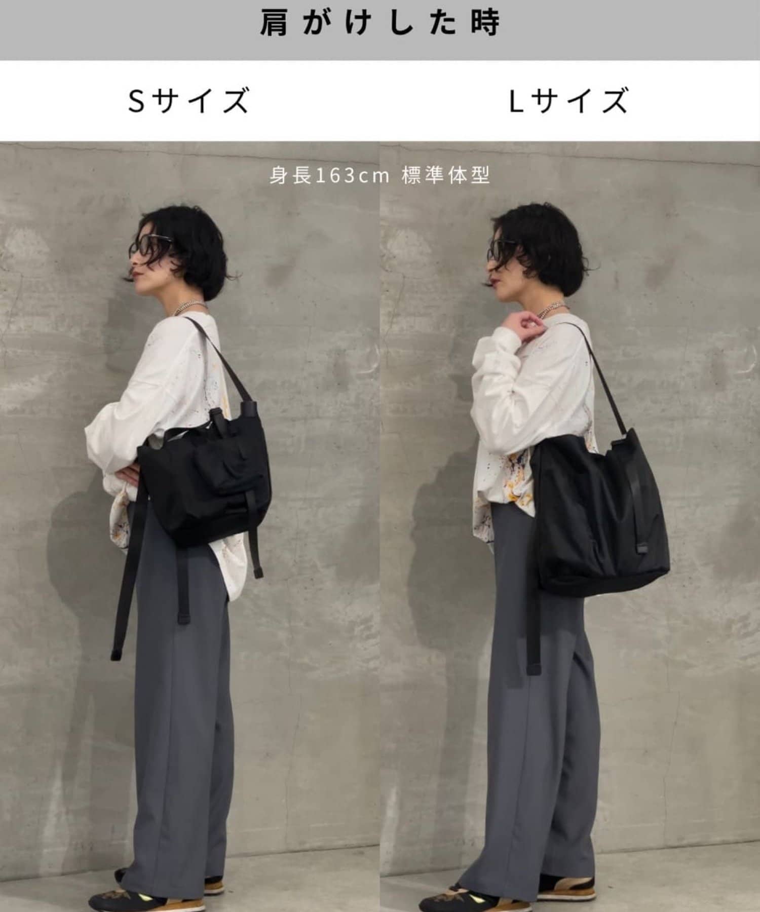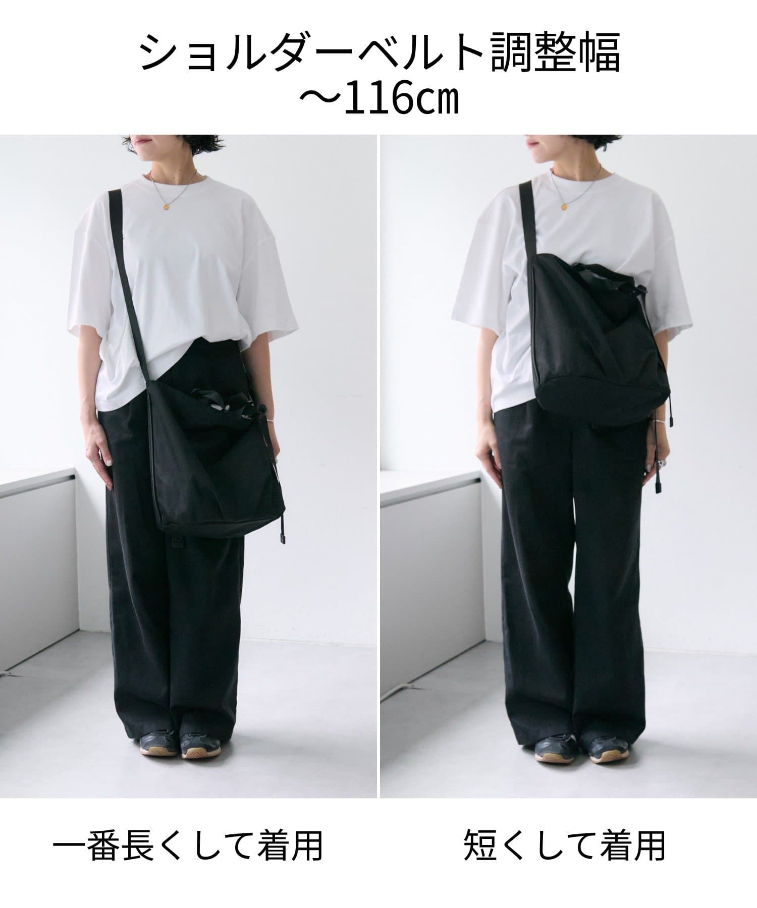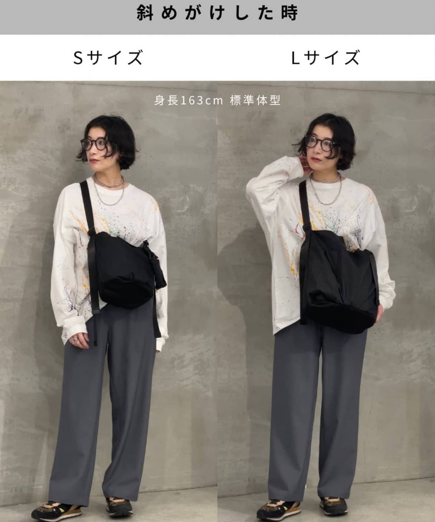 ブラック/身長163cmスタッフが斜め掛けしたときの最長・最短の着用イメージ ブラック/身長163cmスタッフが斜め掛けしたときの最長・最短の着用イメージ