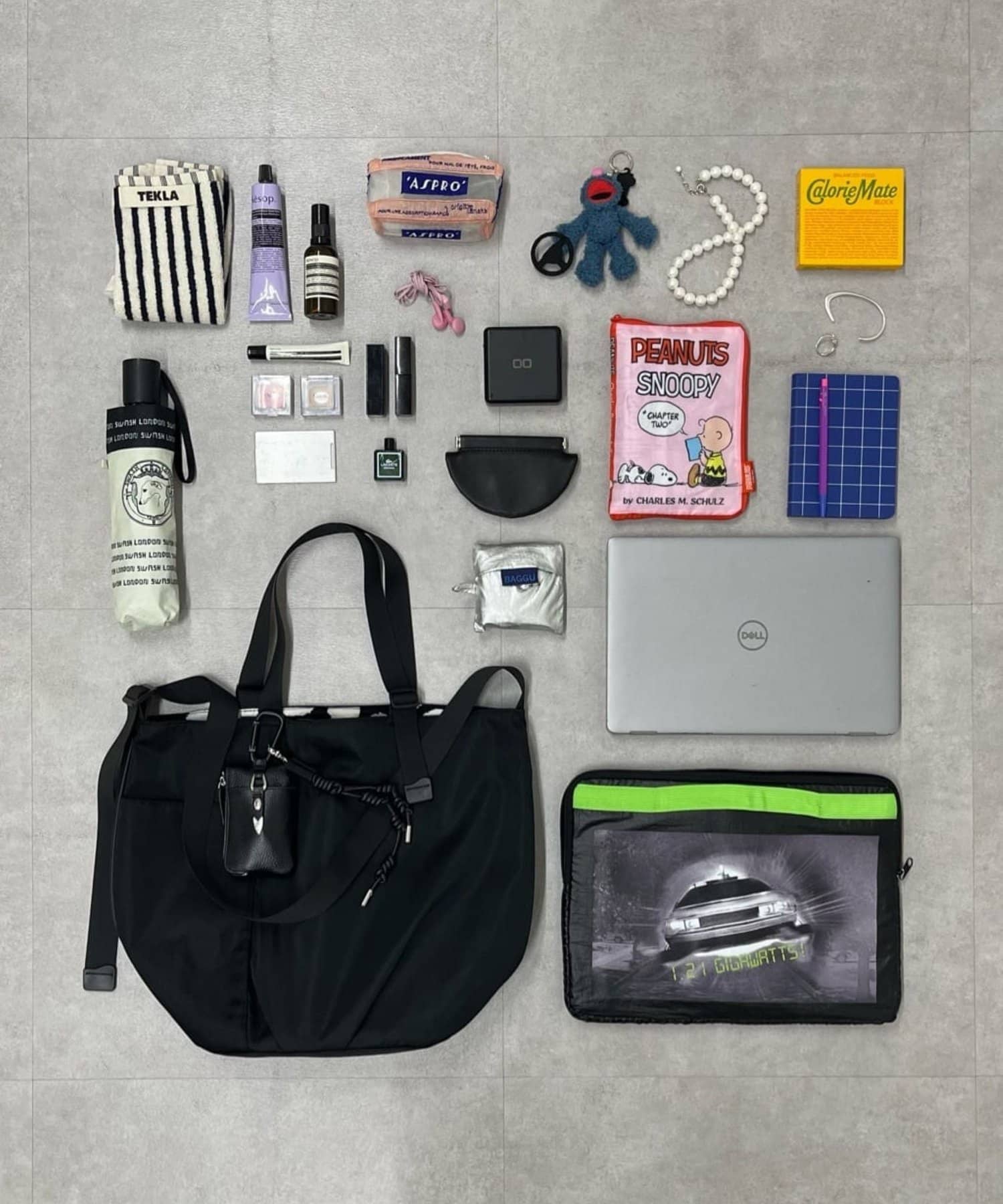 ポケットが多いのでそれぞれに身だしなみグッズ(タオルハンカチ、ティッシュ、鏡、クシなど)、エコバッグやイヤホン、メインには仕事で使うグッズ(エプロン)、化粧ポーチ、モバイルバッテリー、ペンケースなど。外ポケットにはPiTaPaと鍵を入れてるパスケースを入れてます。