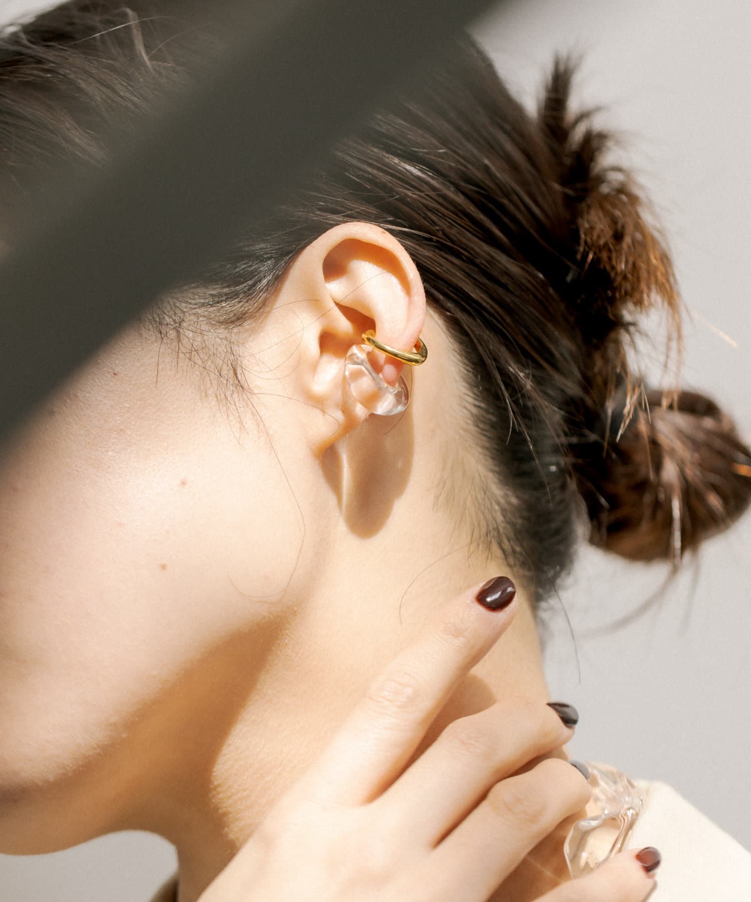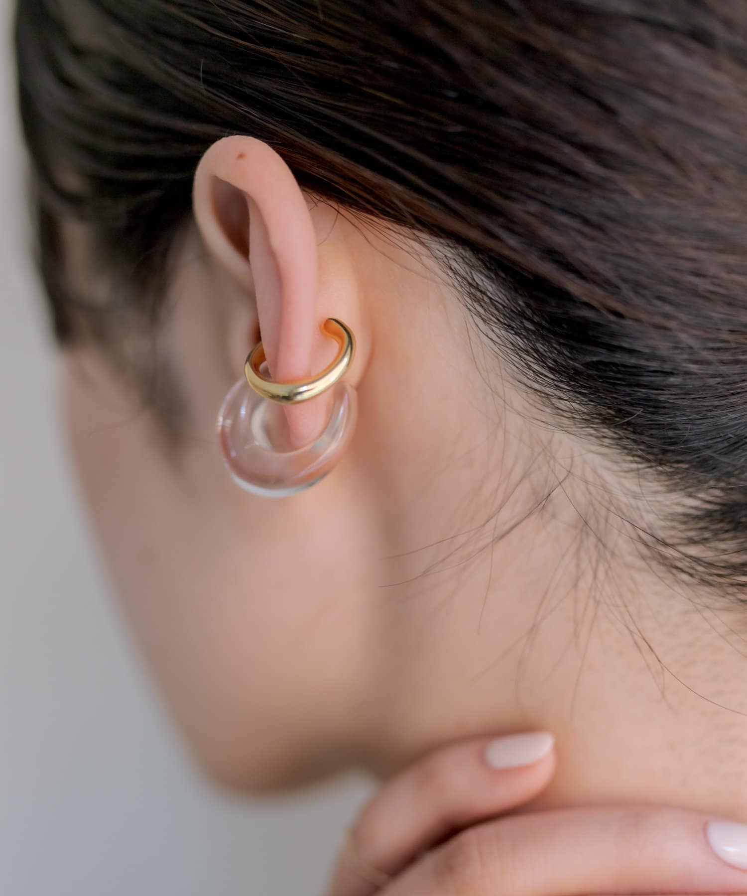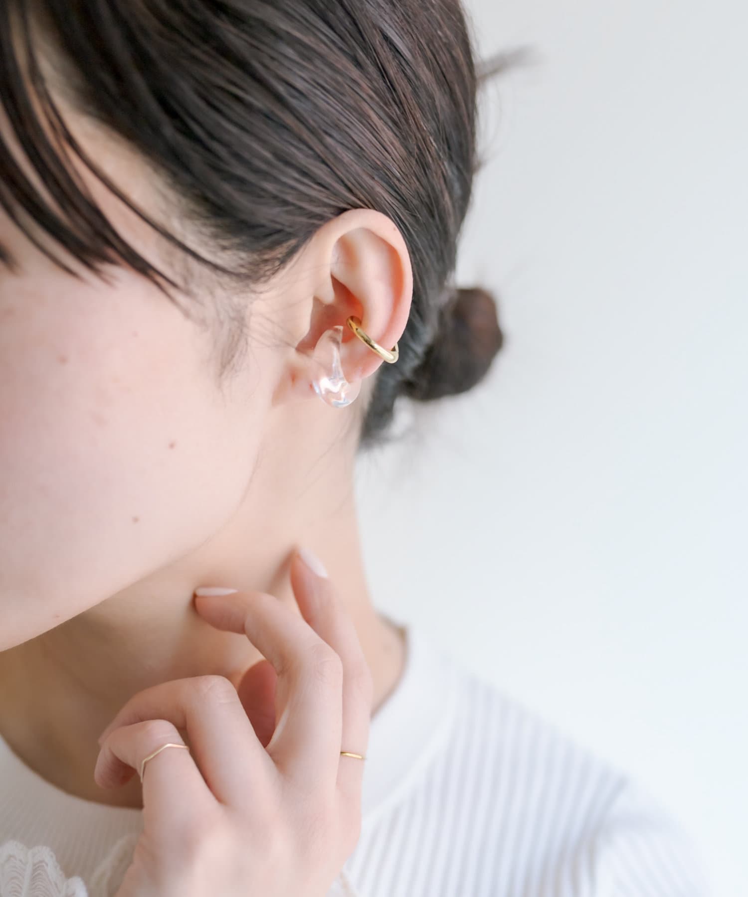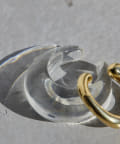 クリアカラーのアイテムはこれからの季節にぴったりな軽やかな雰囲気で、そこにゴールドが加わることで全体の印象を引き締め、バランスの取れた耳元に。