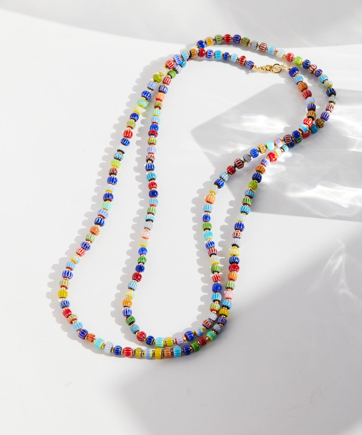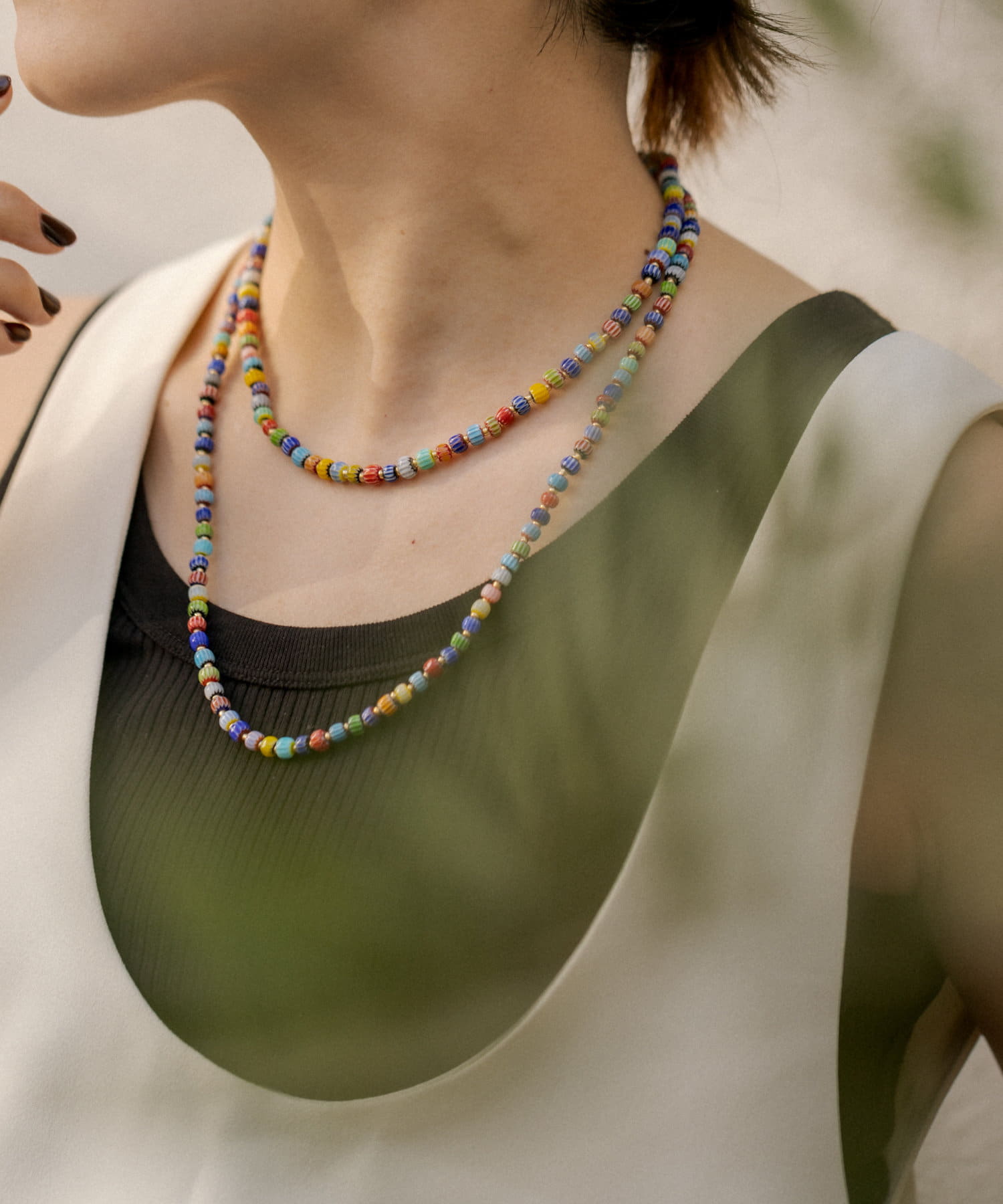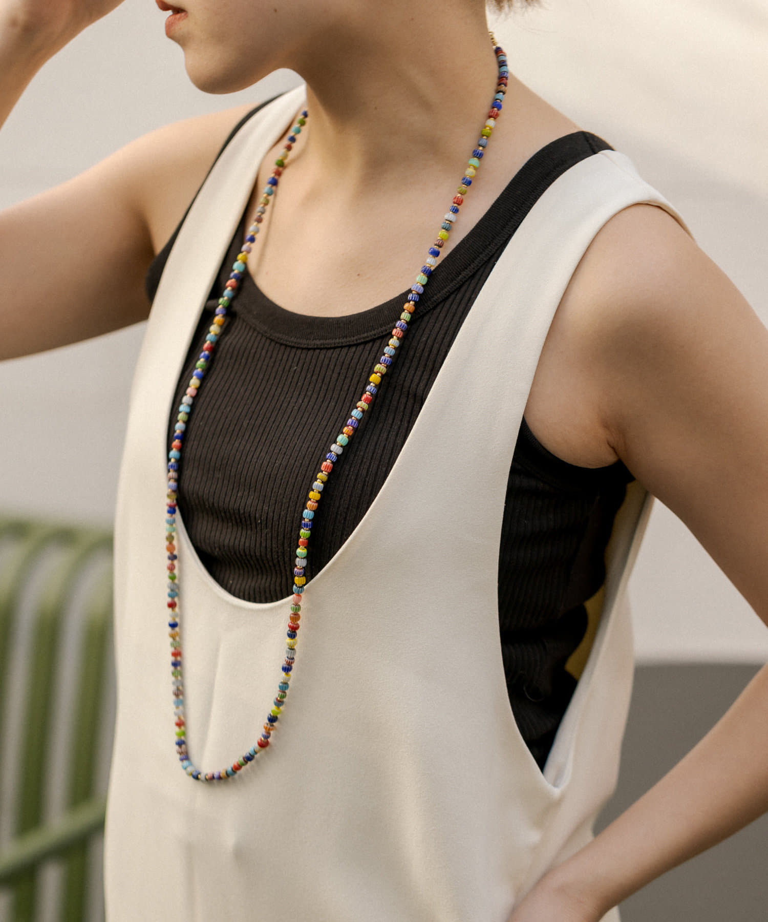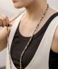 ミルフィリオのカラフルビーズを連ねたロングネックレスはシンプルコーデのアクセントにぴったり。