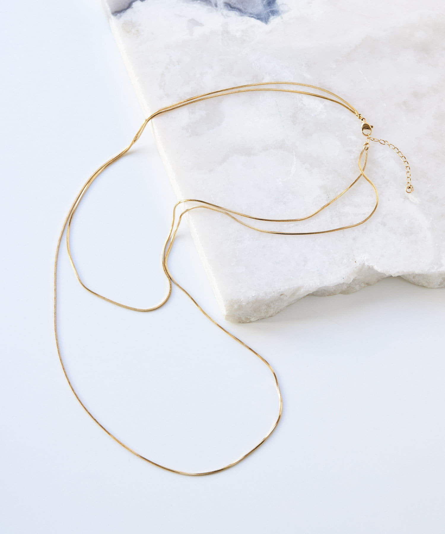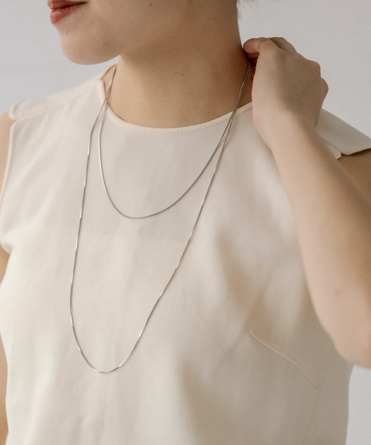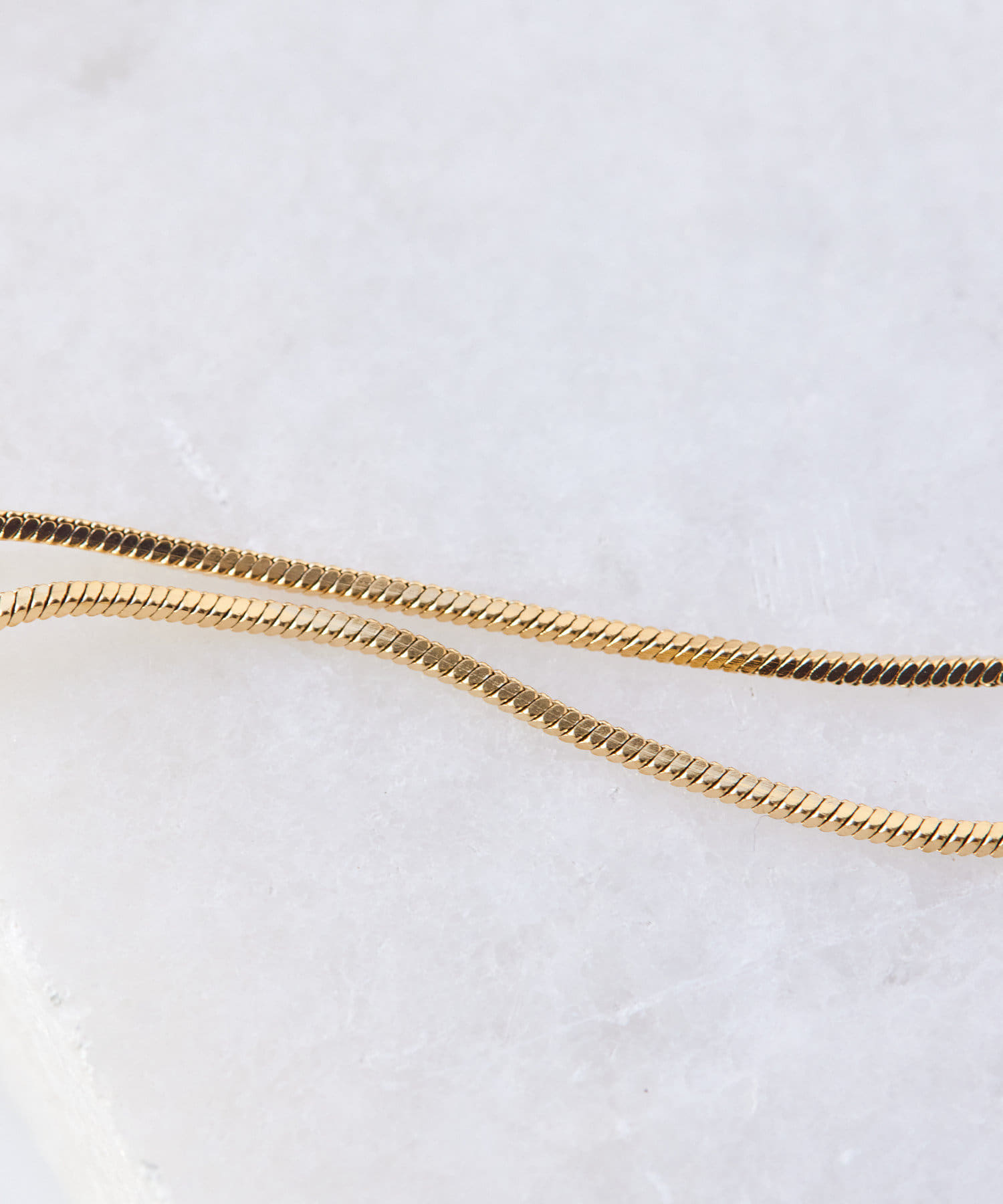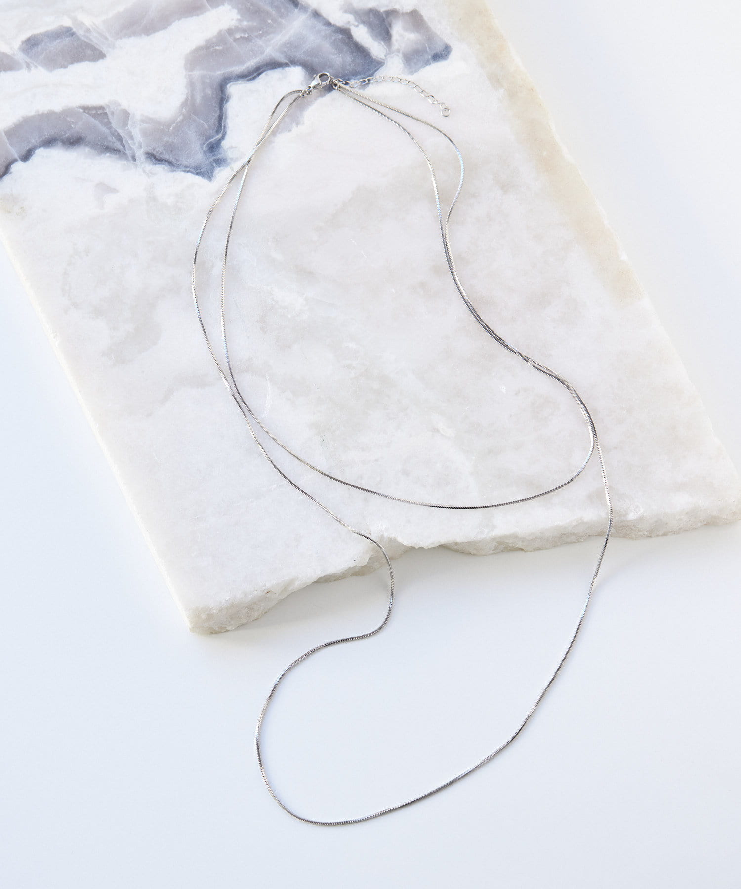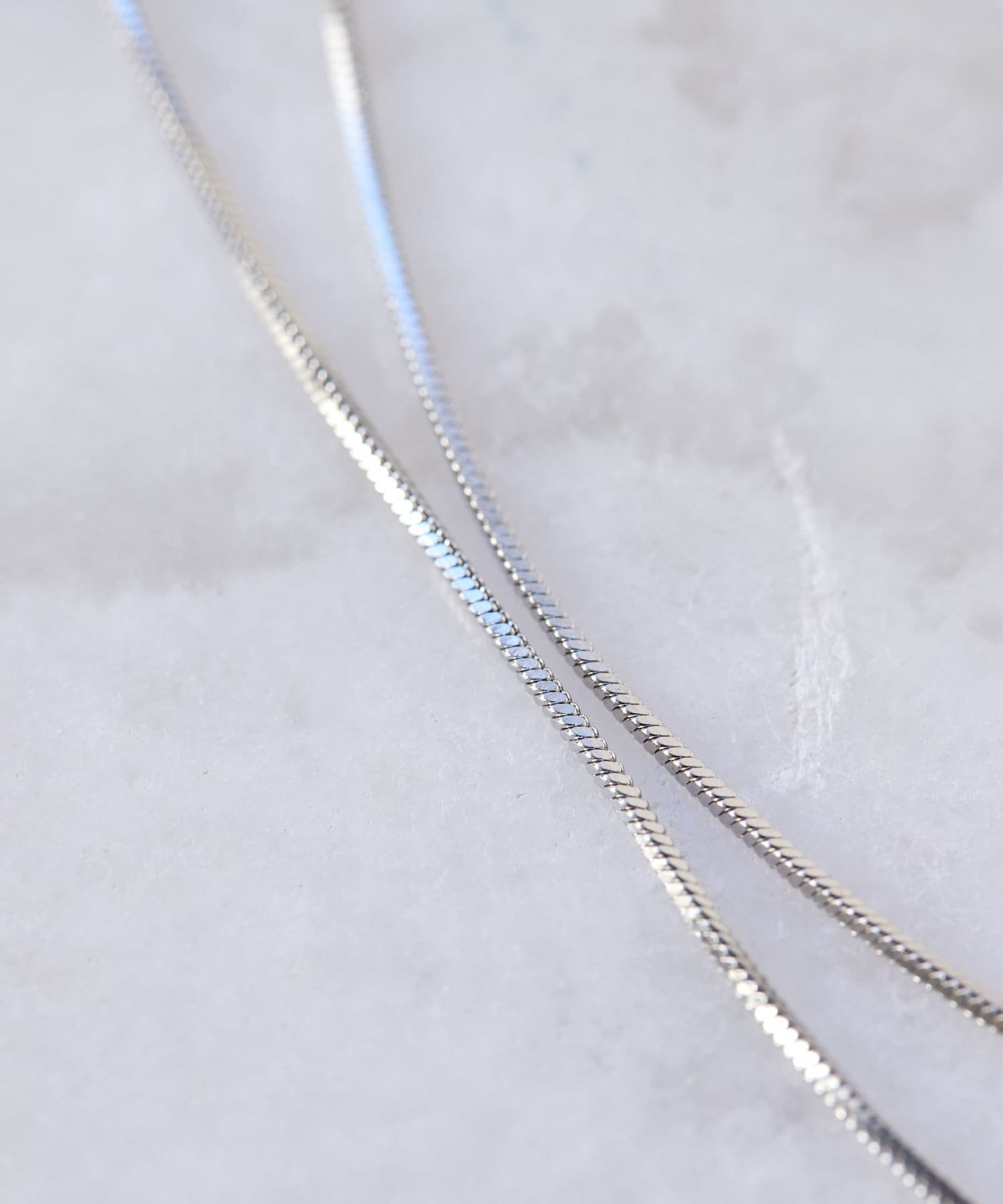 滑らかで上品な輝きをみせるスネークチェーンが長さ違いで2連になったデザイン。