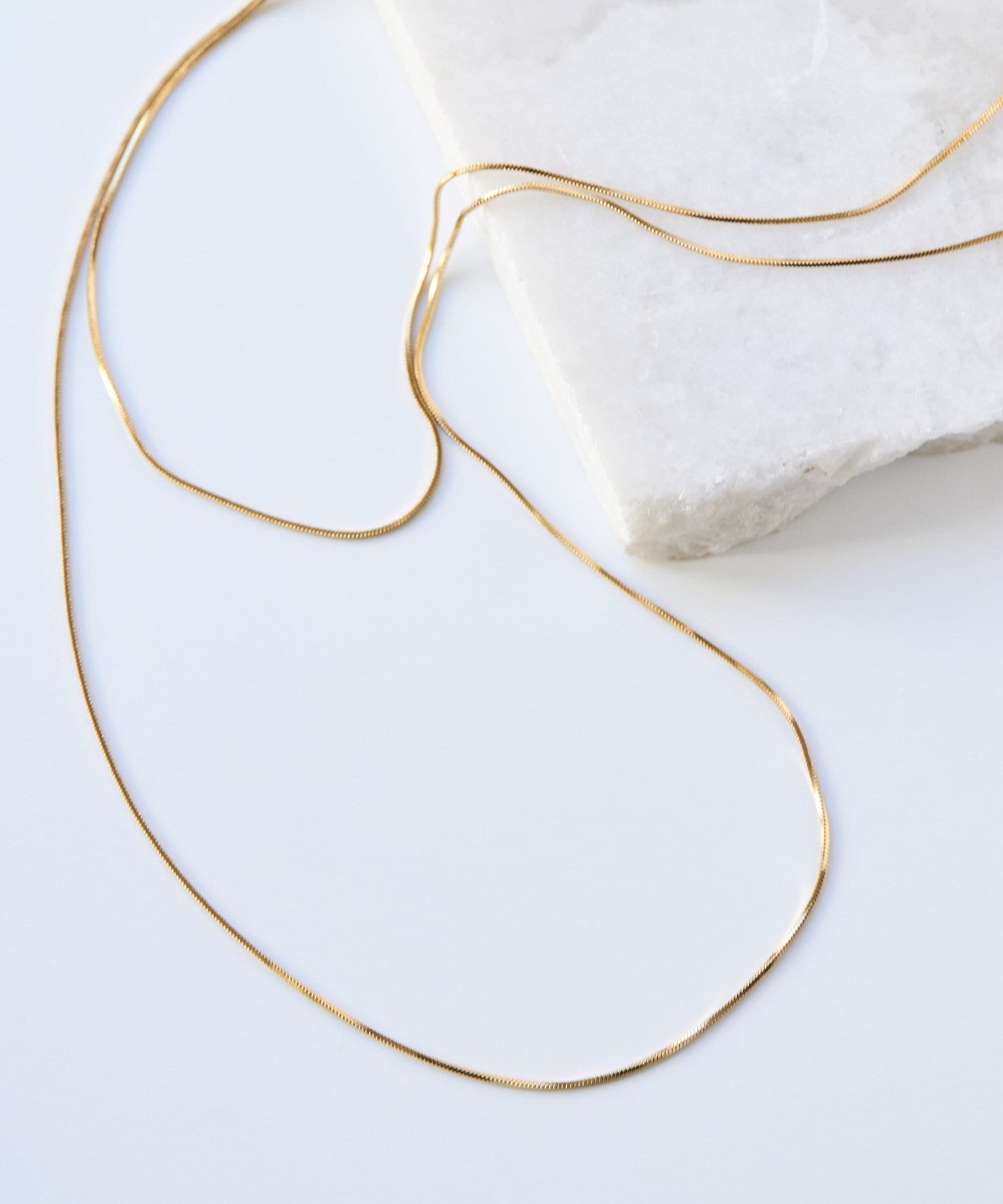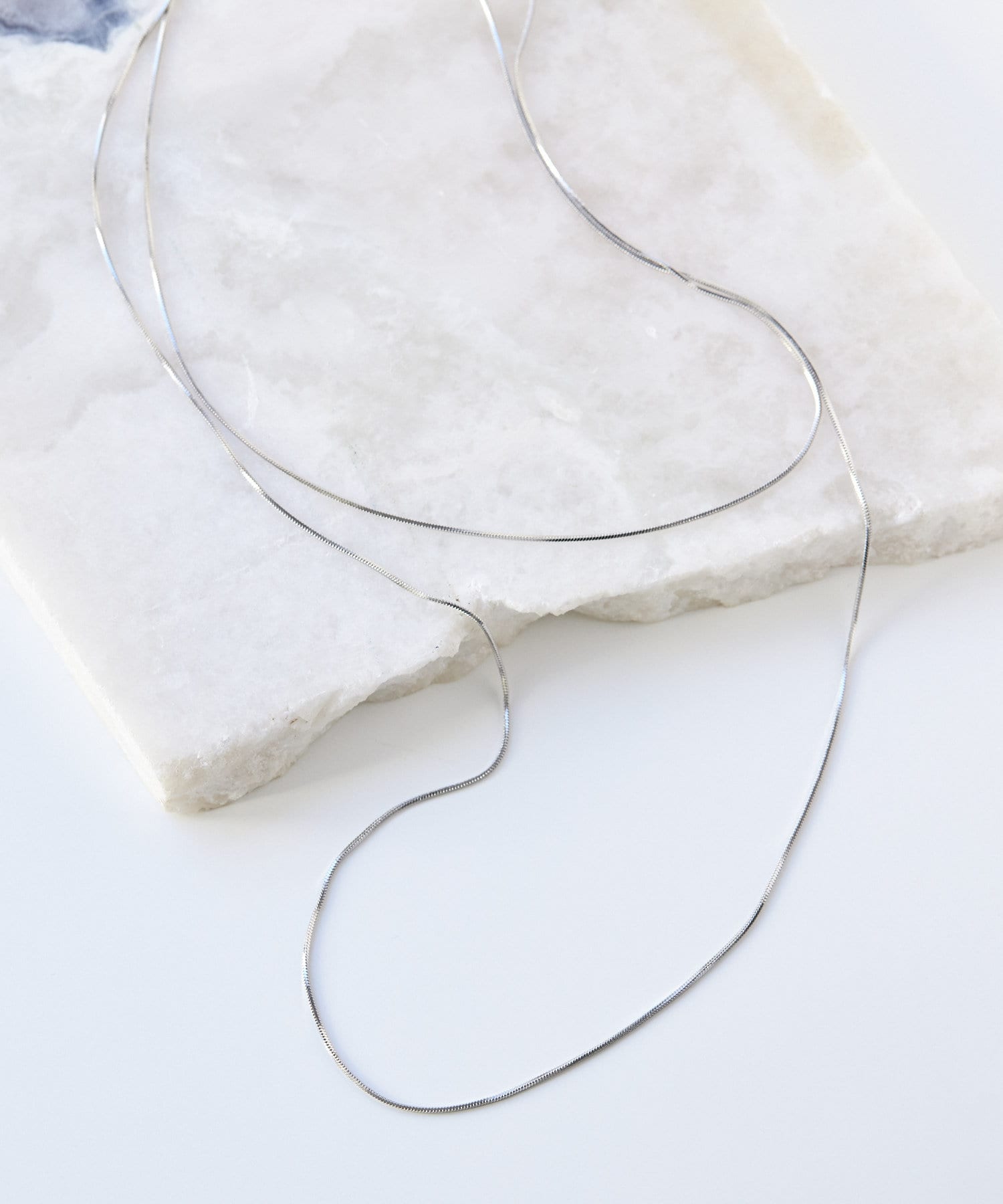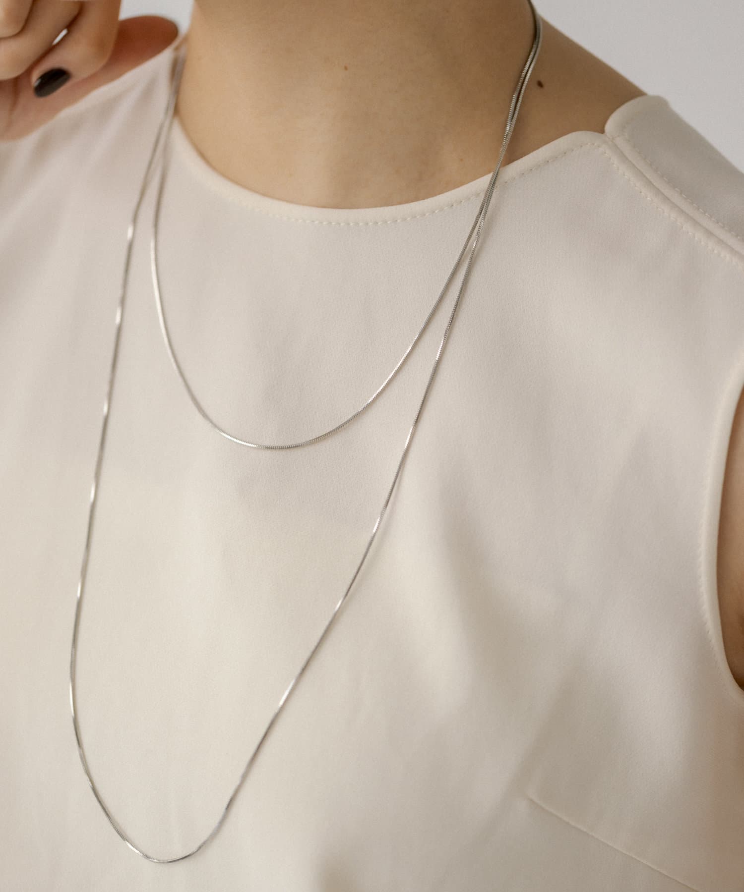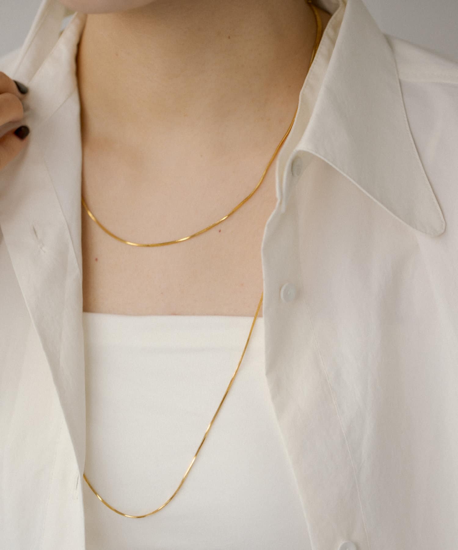滑らかで上品な輝きをみせるスネークチェーンが長さ違いで2連になったデザイン。