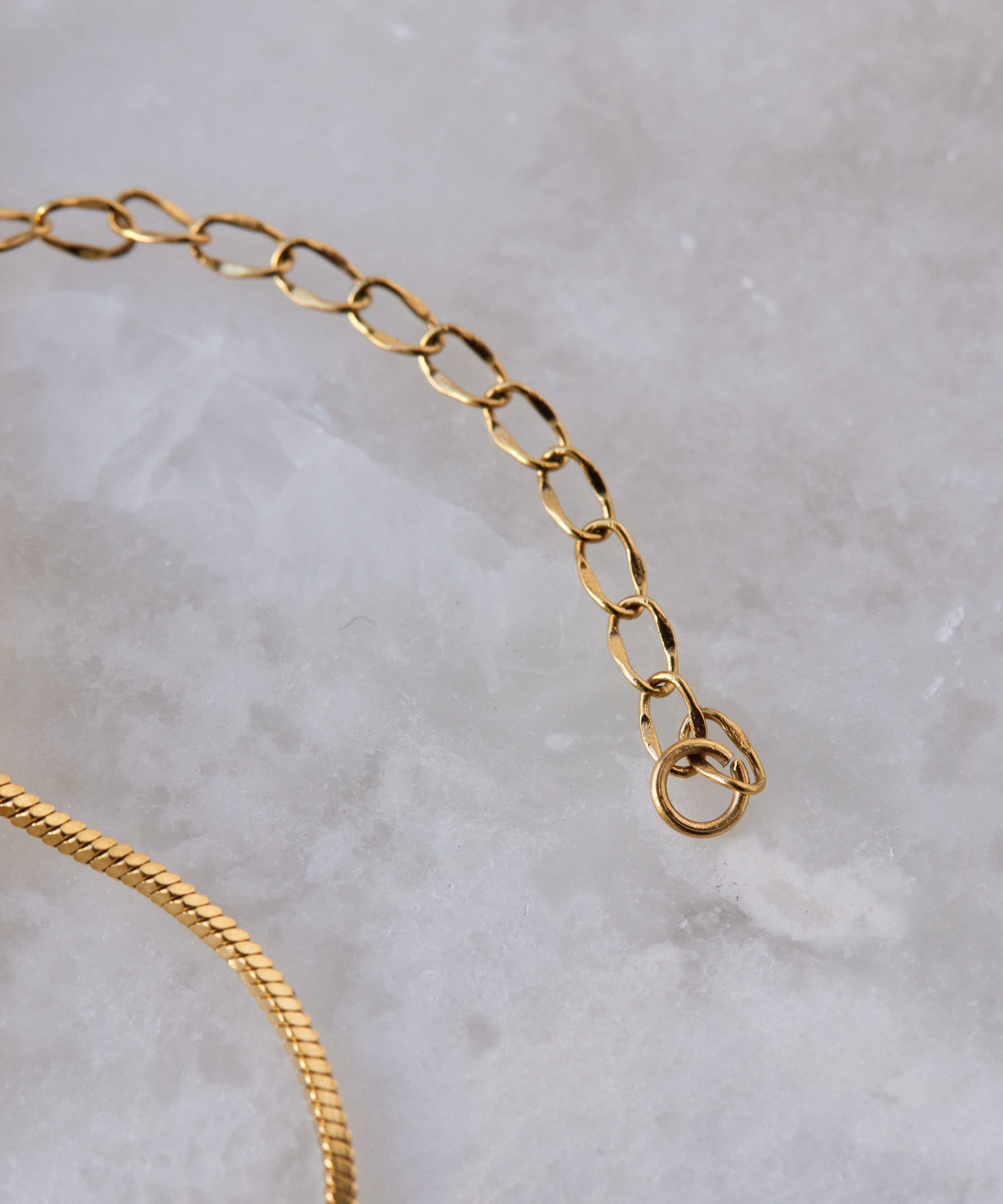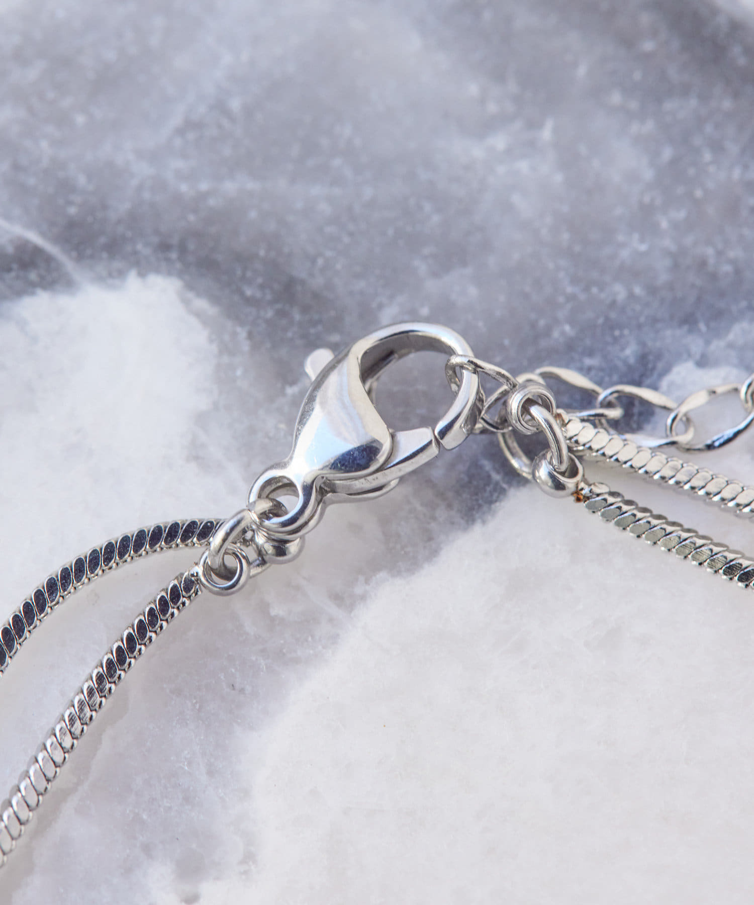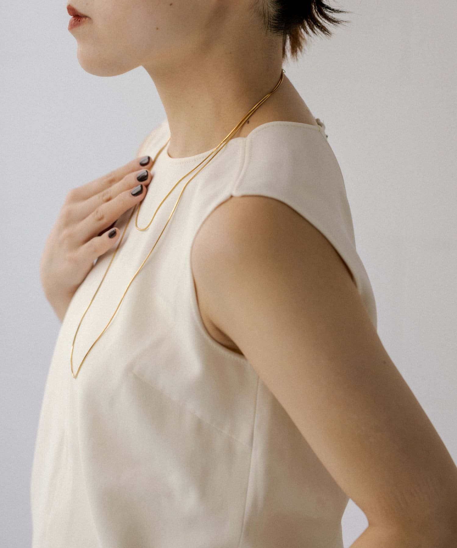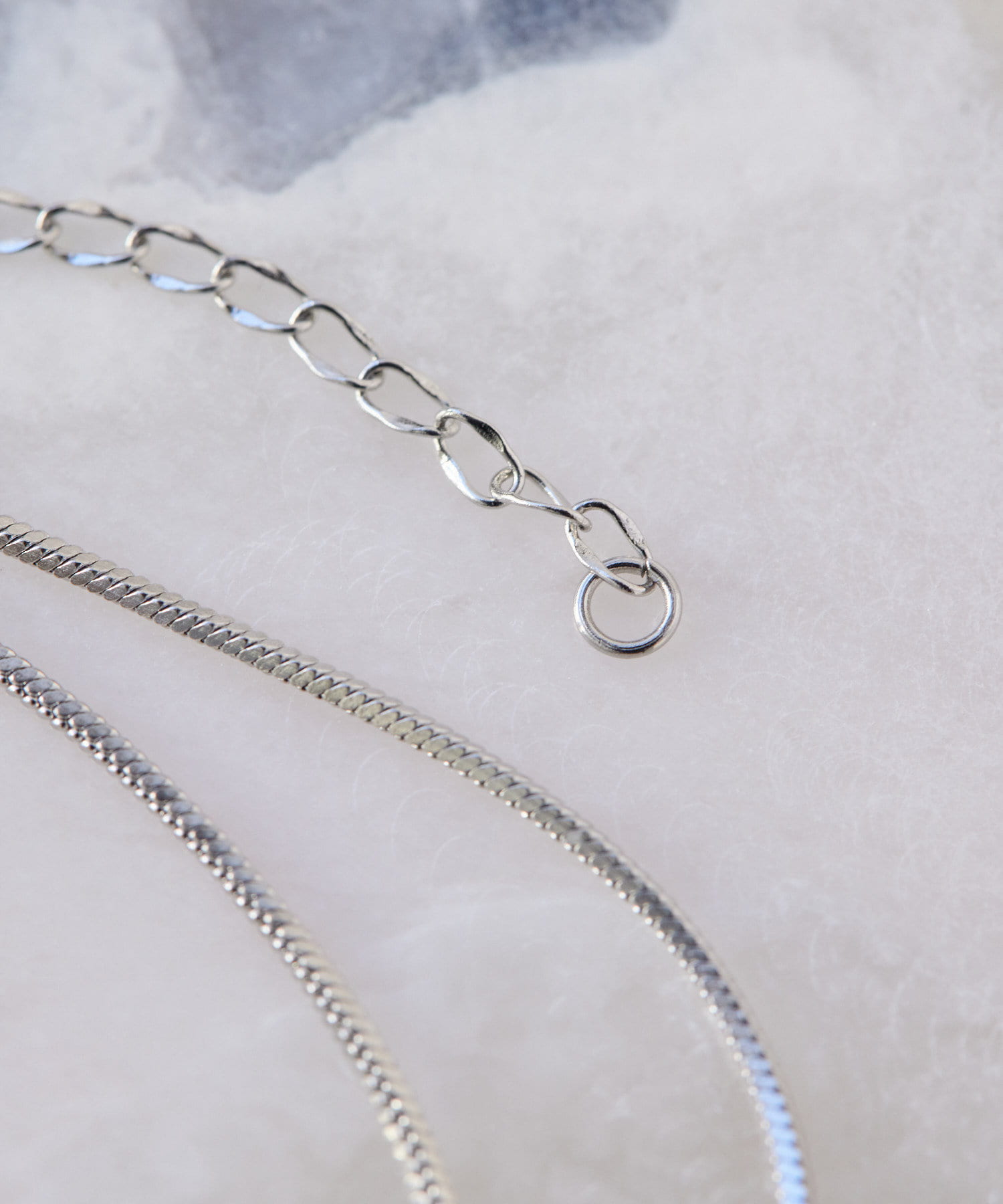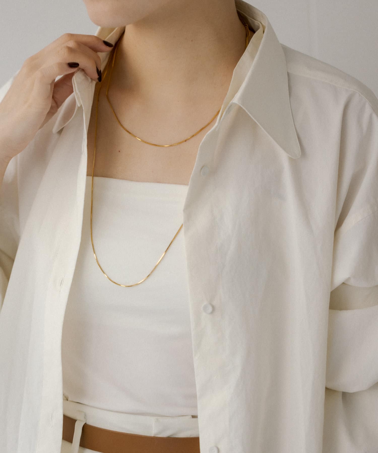 滑らかで上品な輝きをみせるスネークチェーンが長さ違いで2連になったデザイン。