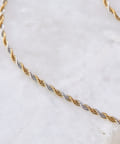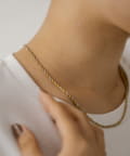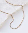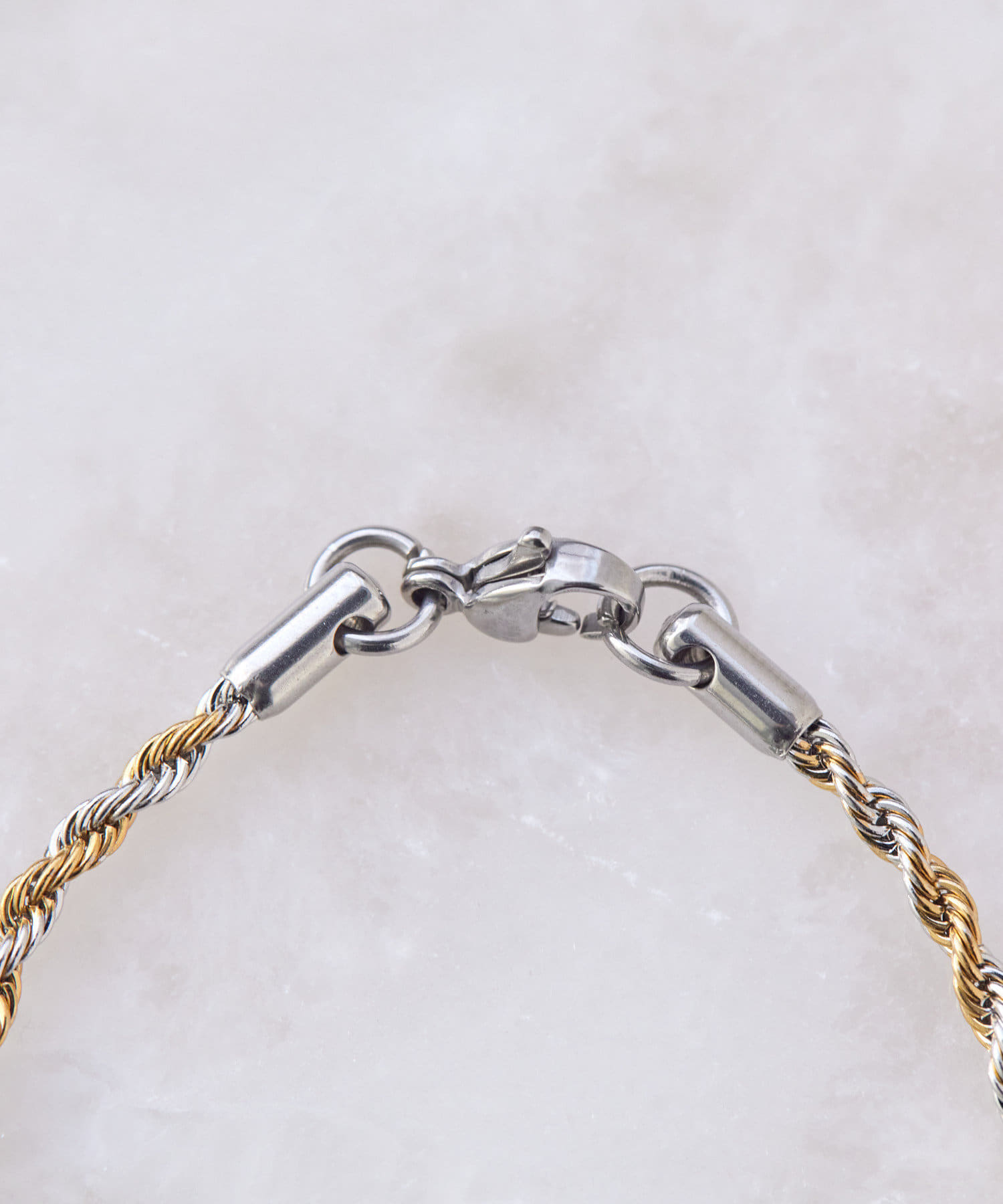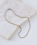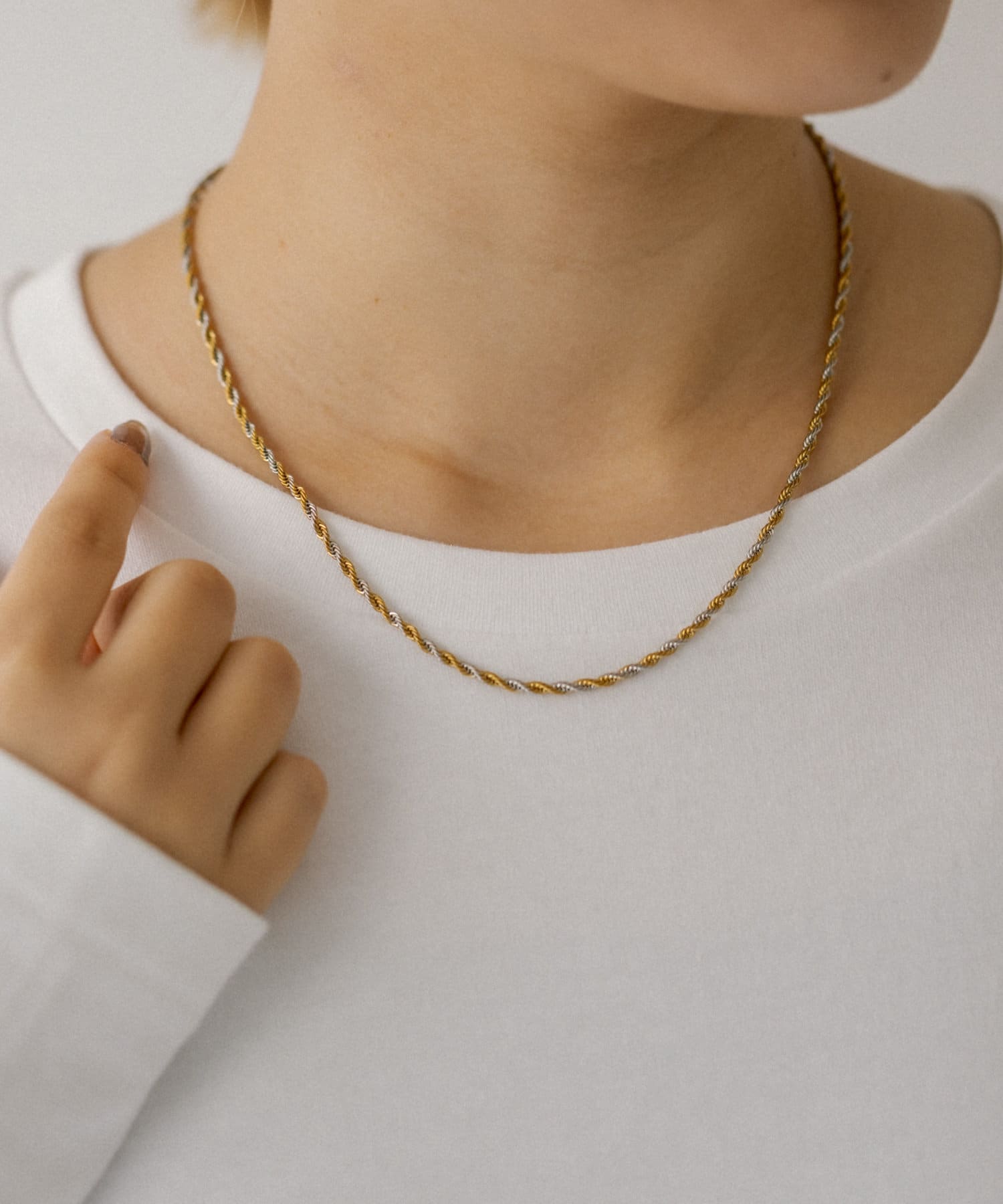 2色のチェーンを合わせてツイストさせたバイカラーデザインで、お手持ちのペンダントなどとの重ね付けも気軽に楽しめます。
