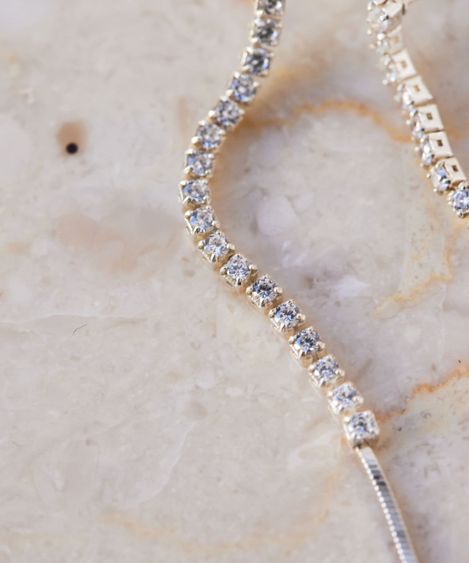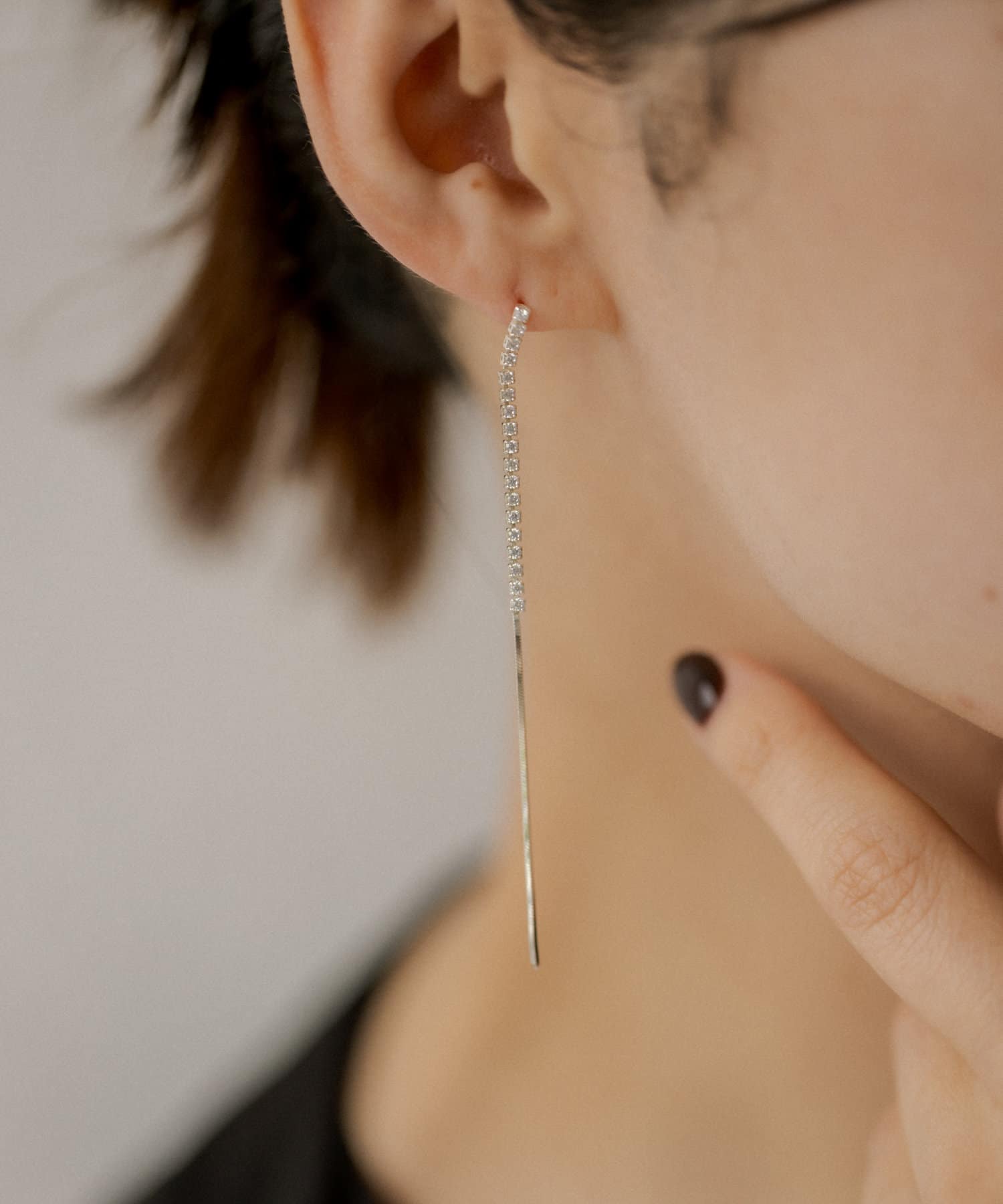 クリスタルとスネークチェーンの一直線デザインが横顔をスマートかつ、上品に。