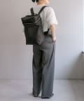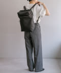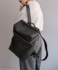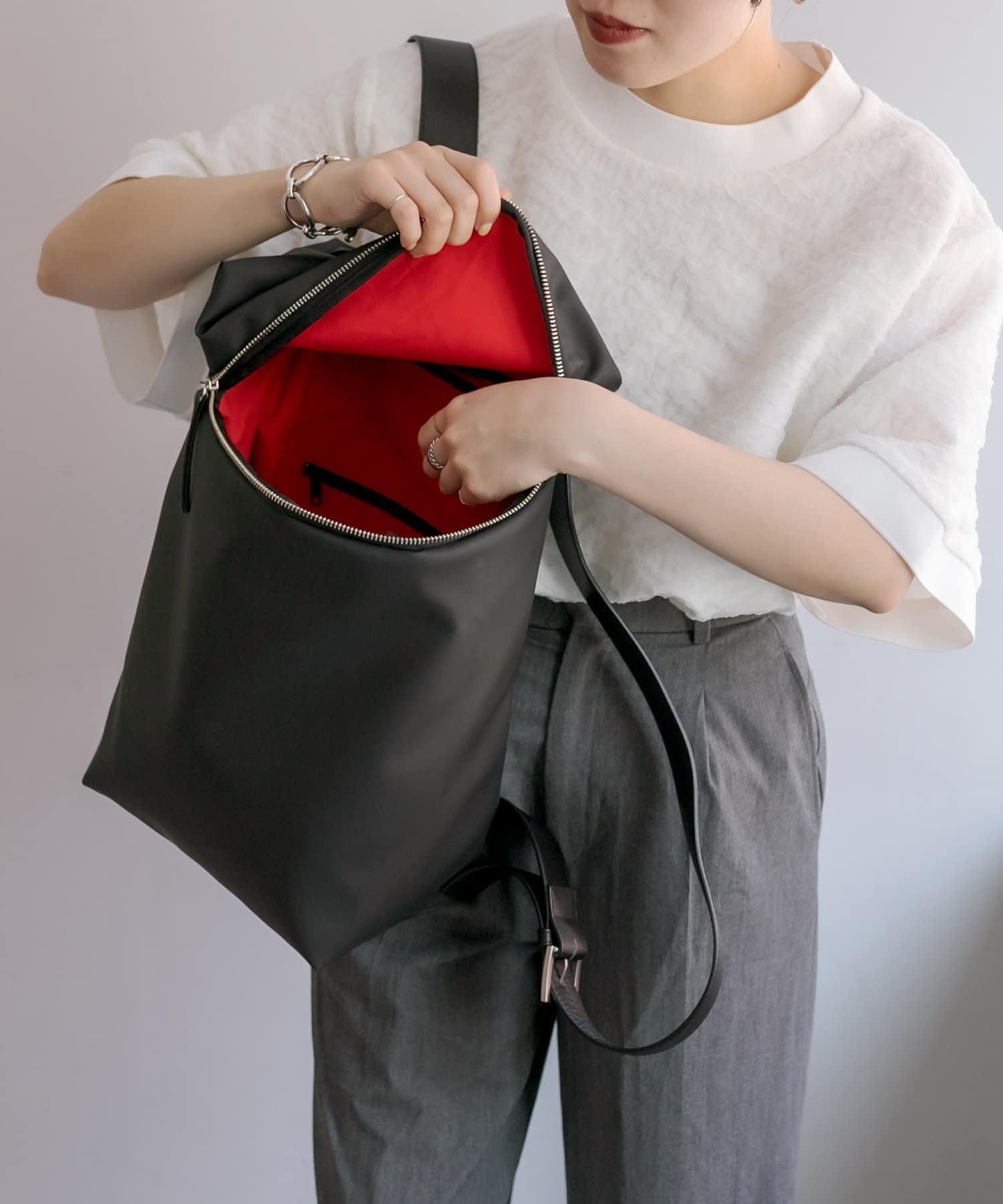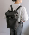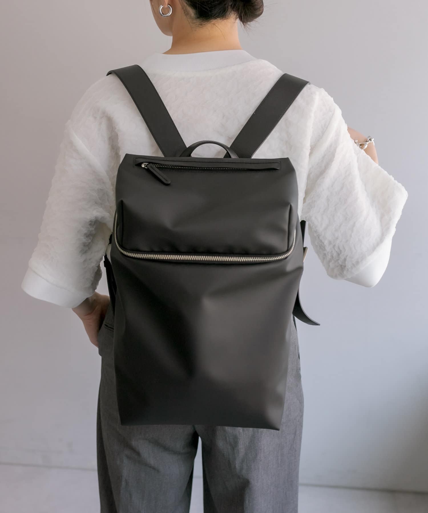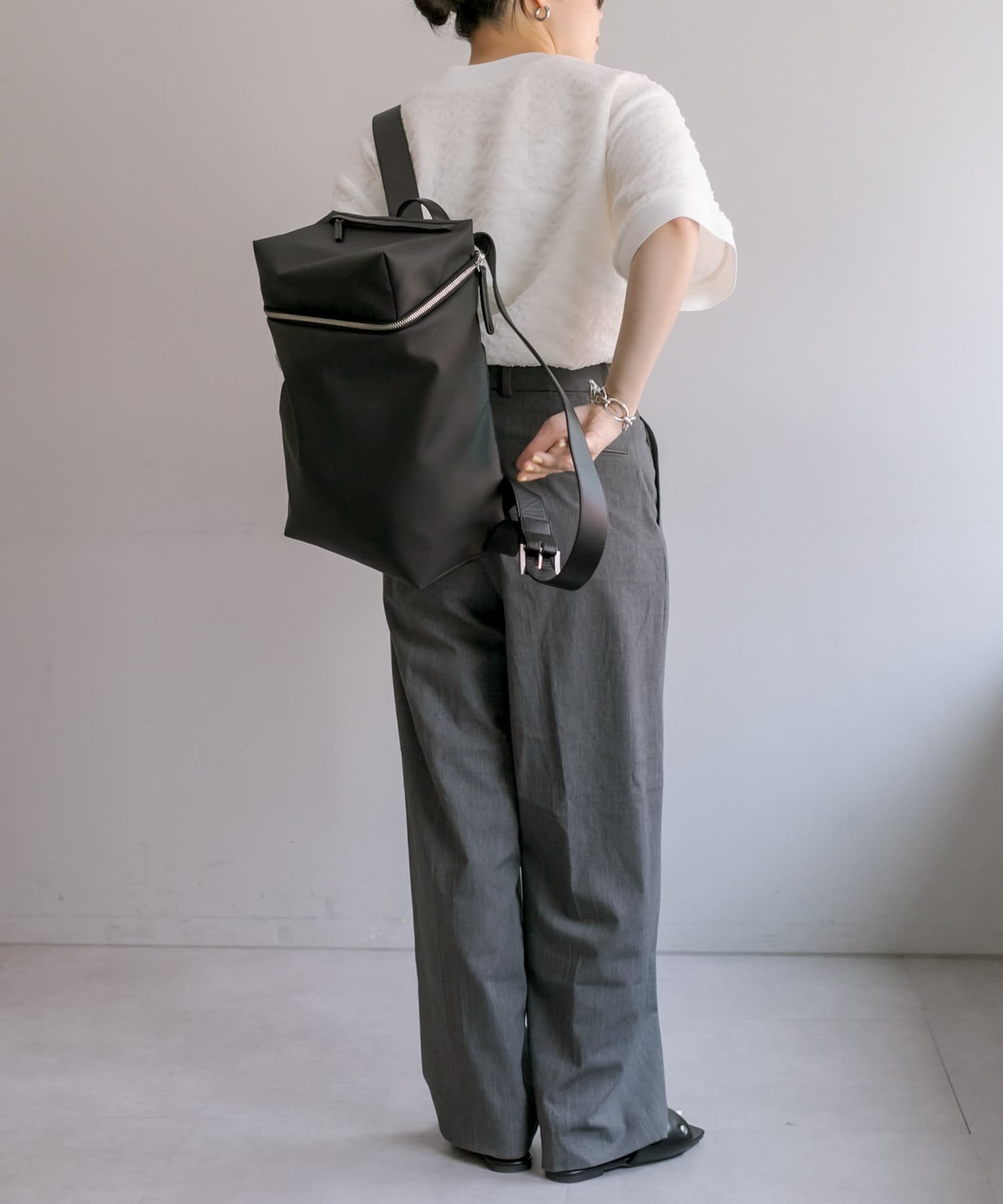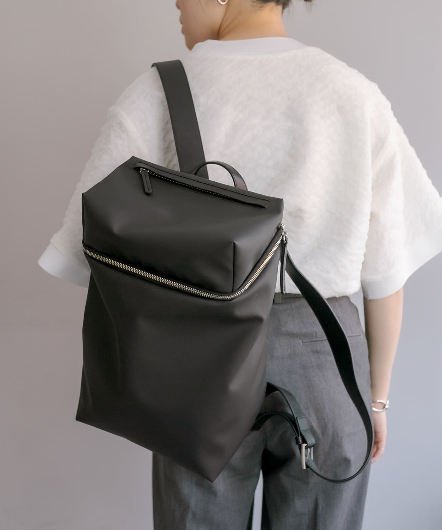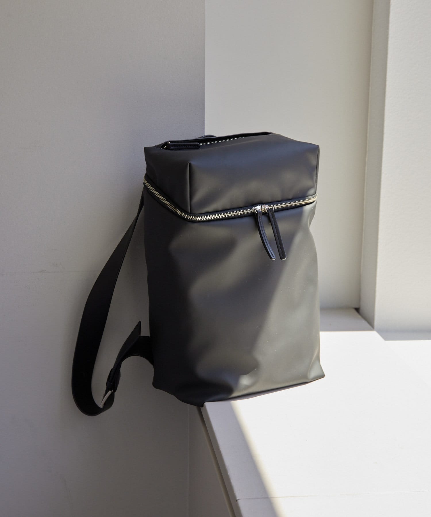 シルバーのファスナーを効かせたボックス型のリュックは、