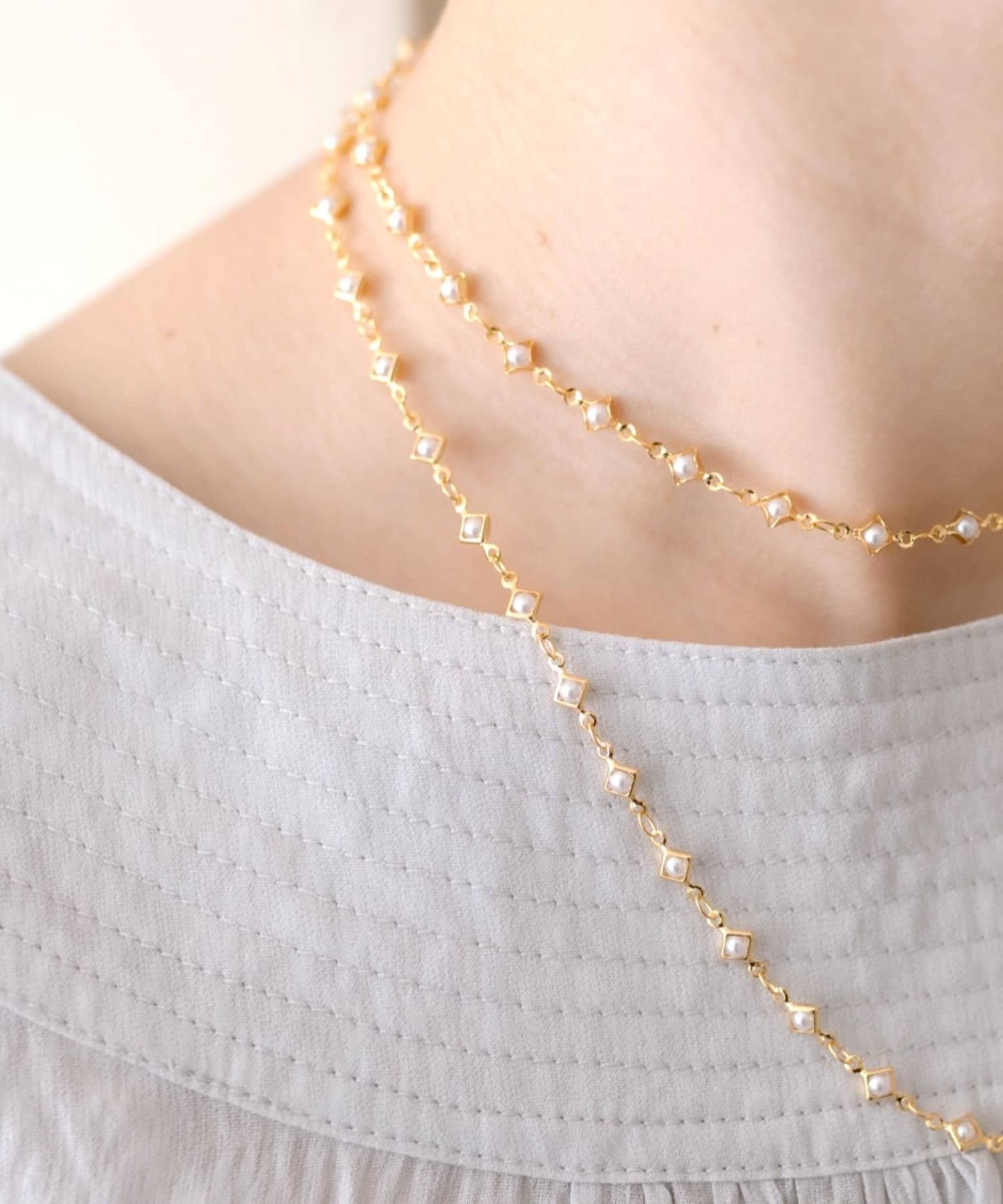 《2連&Y字でも着用可能/金属アレルギー対応/ステンレス》枠付きパールロングネックレス