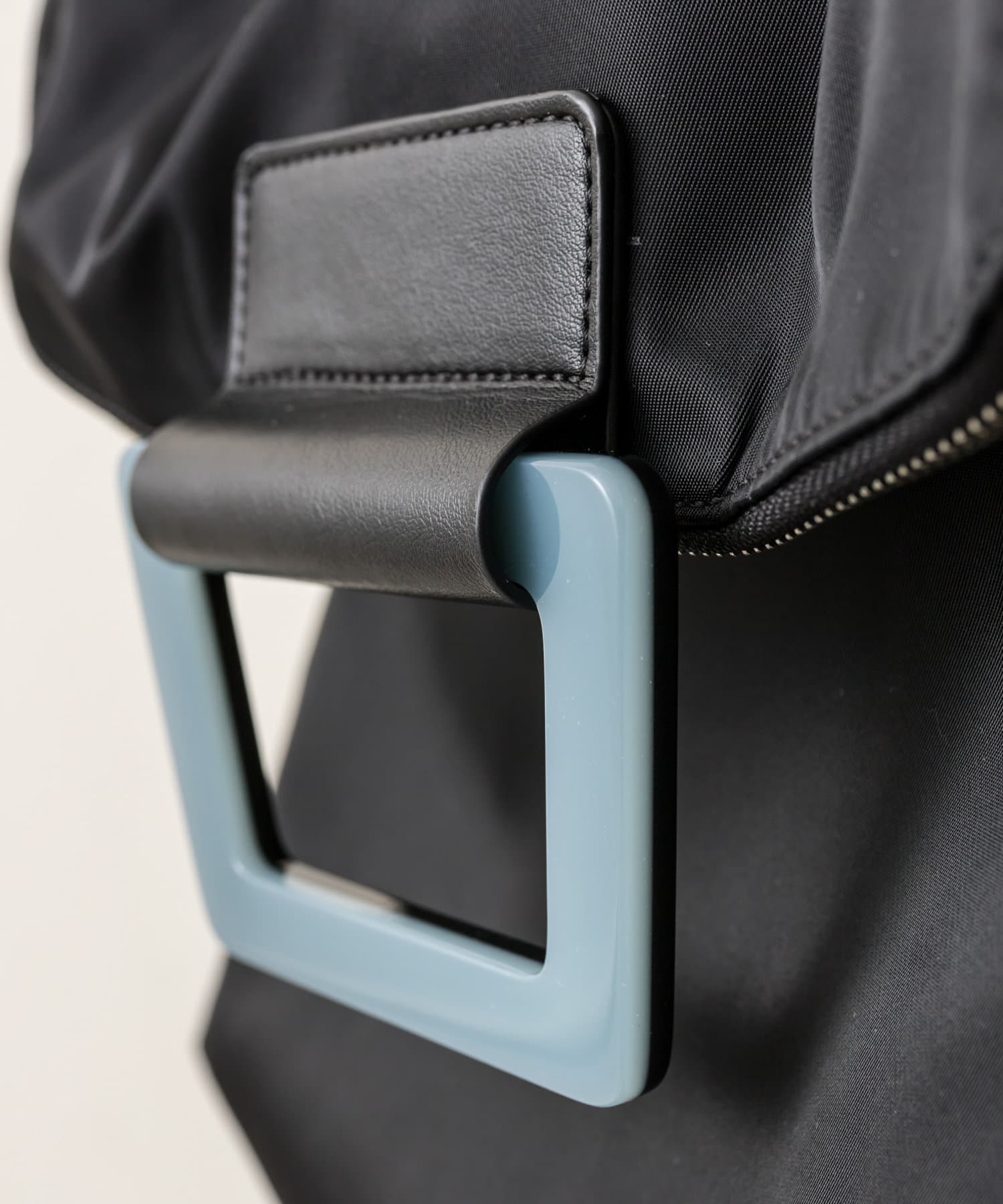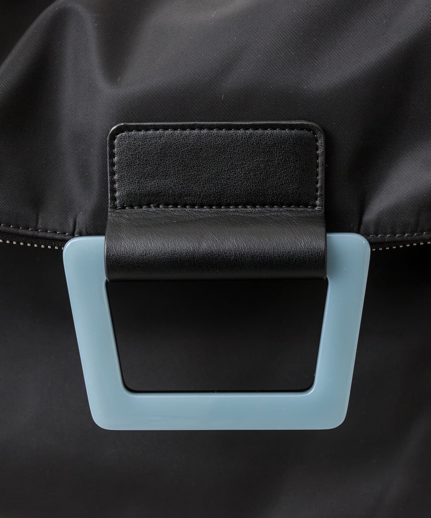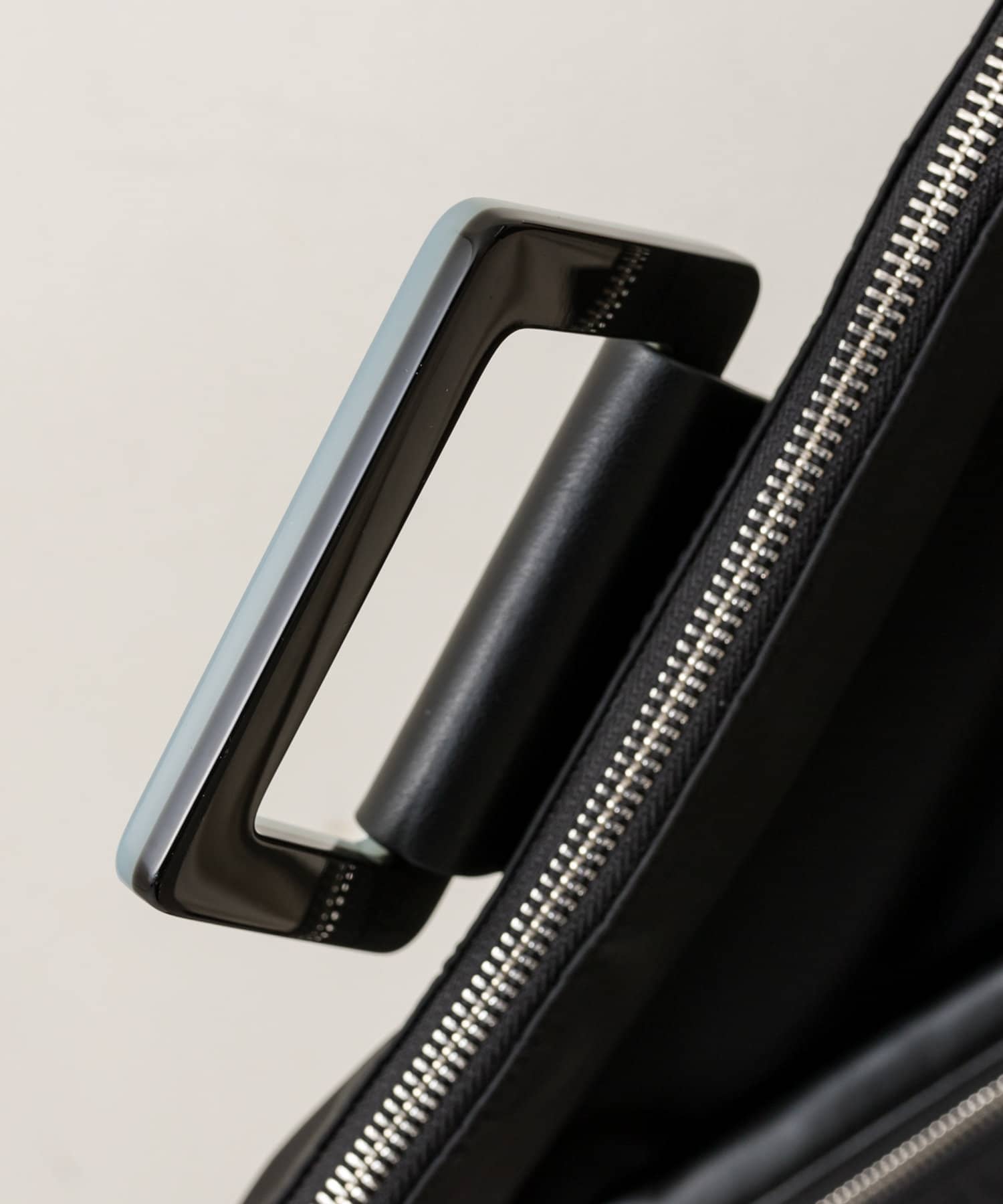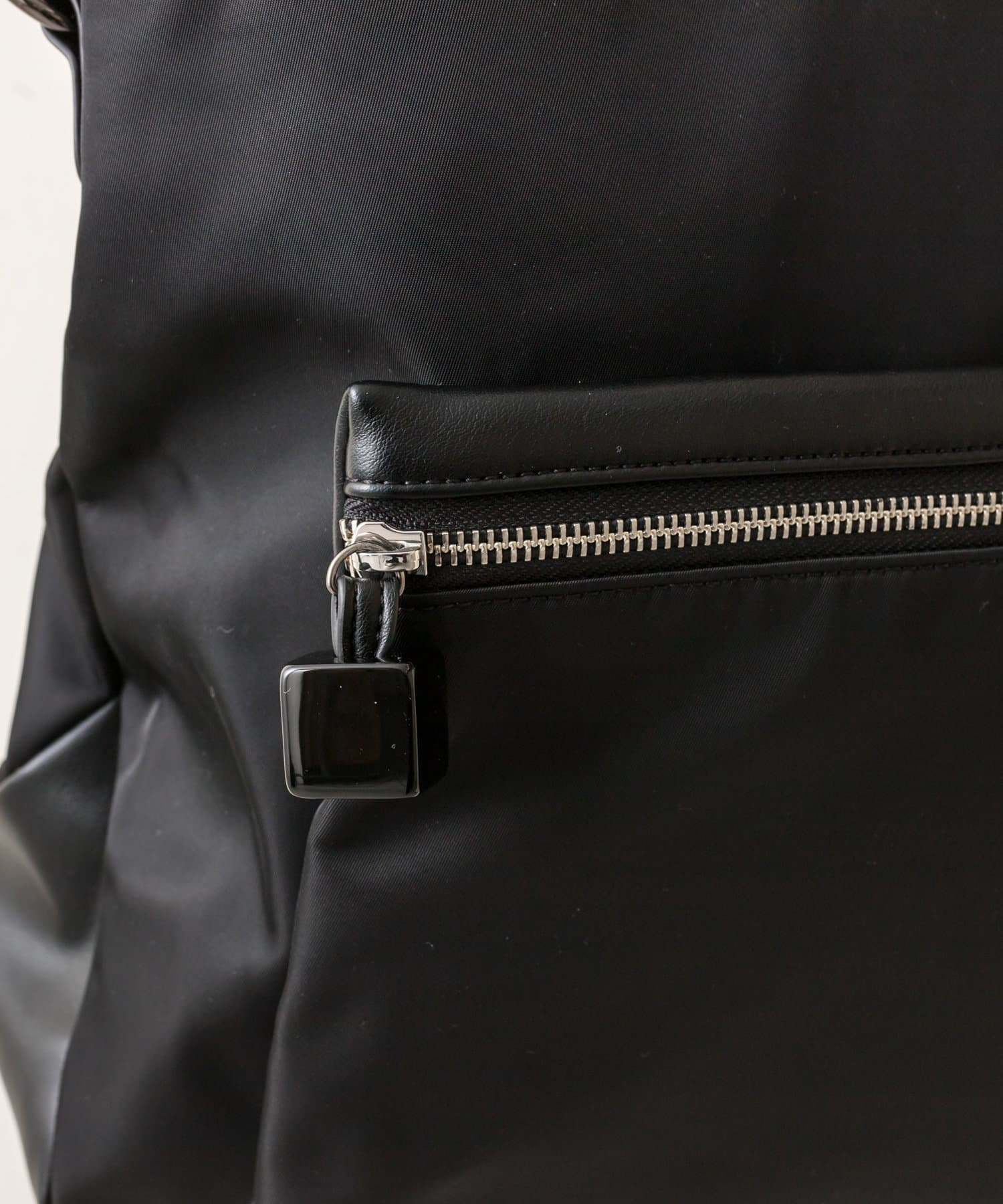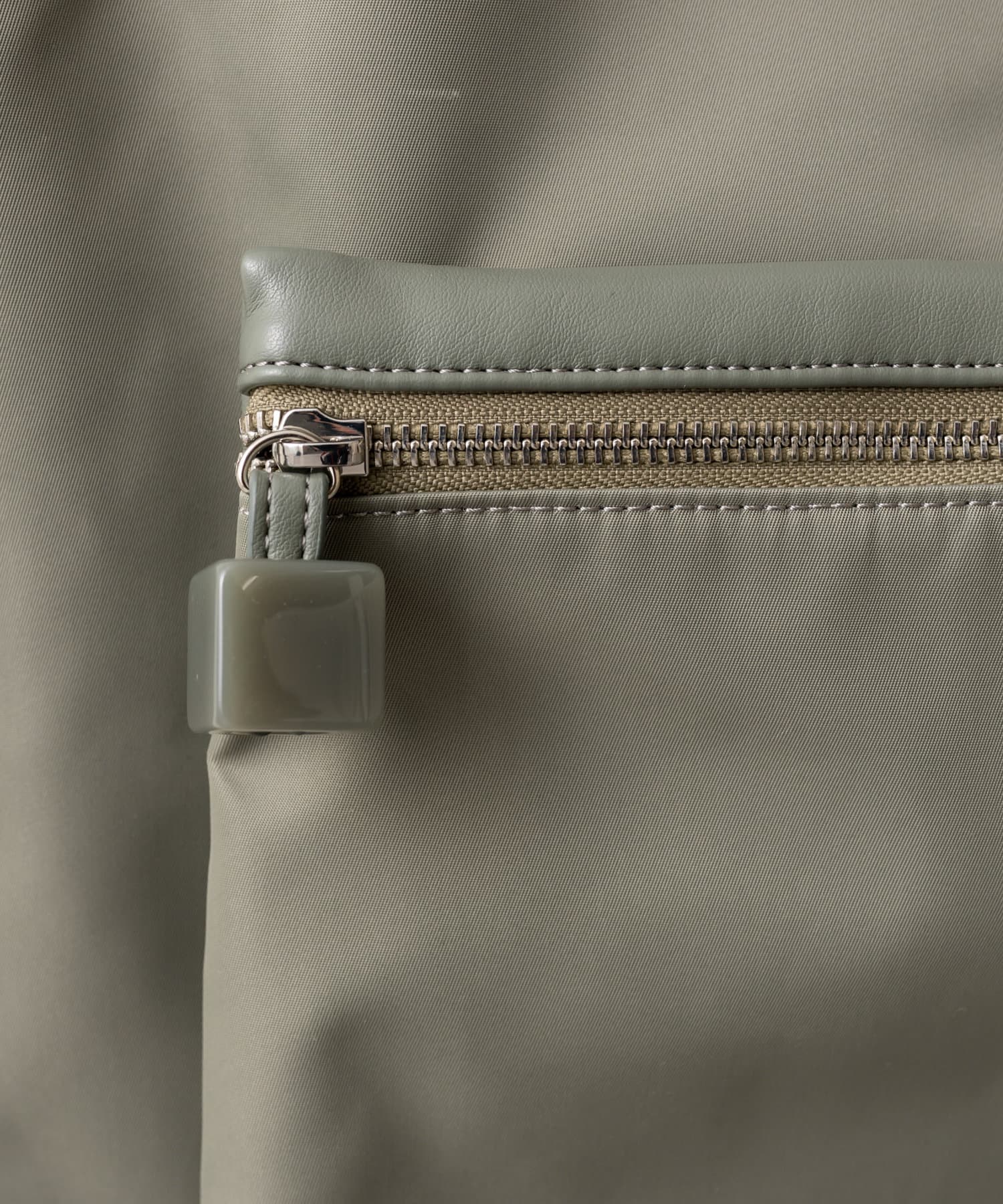 キューブ型の樹脂パーツ引手がポイントの立体的な外ポケットは合成皮革を使用。