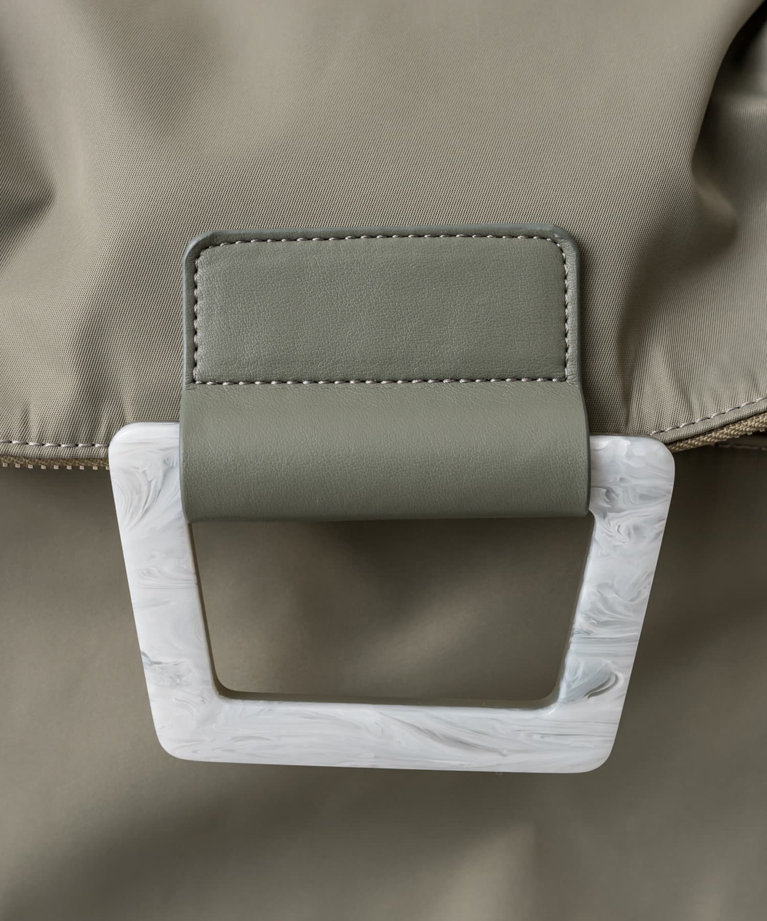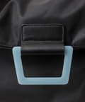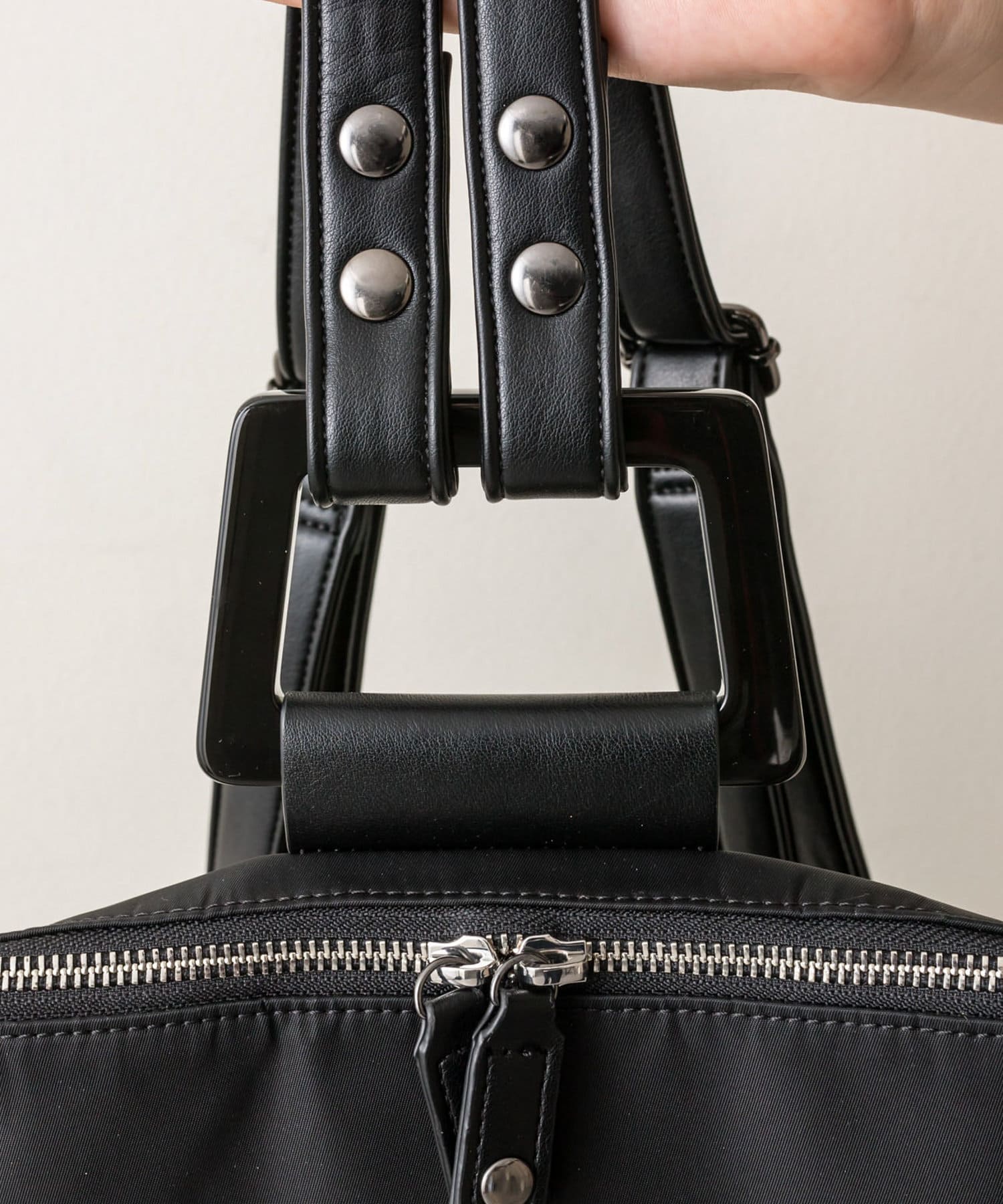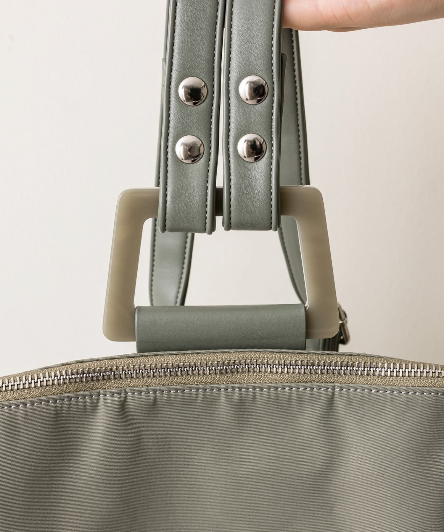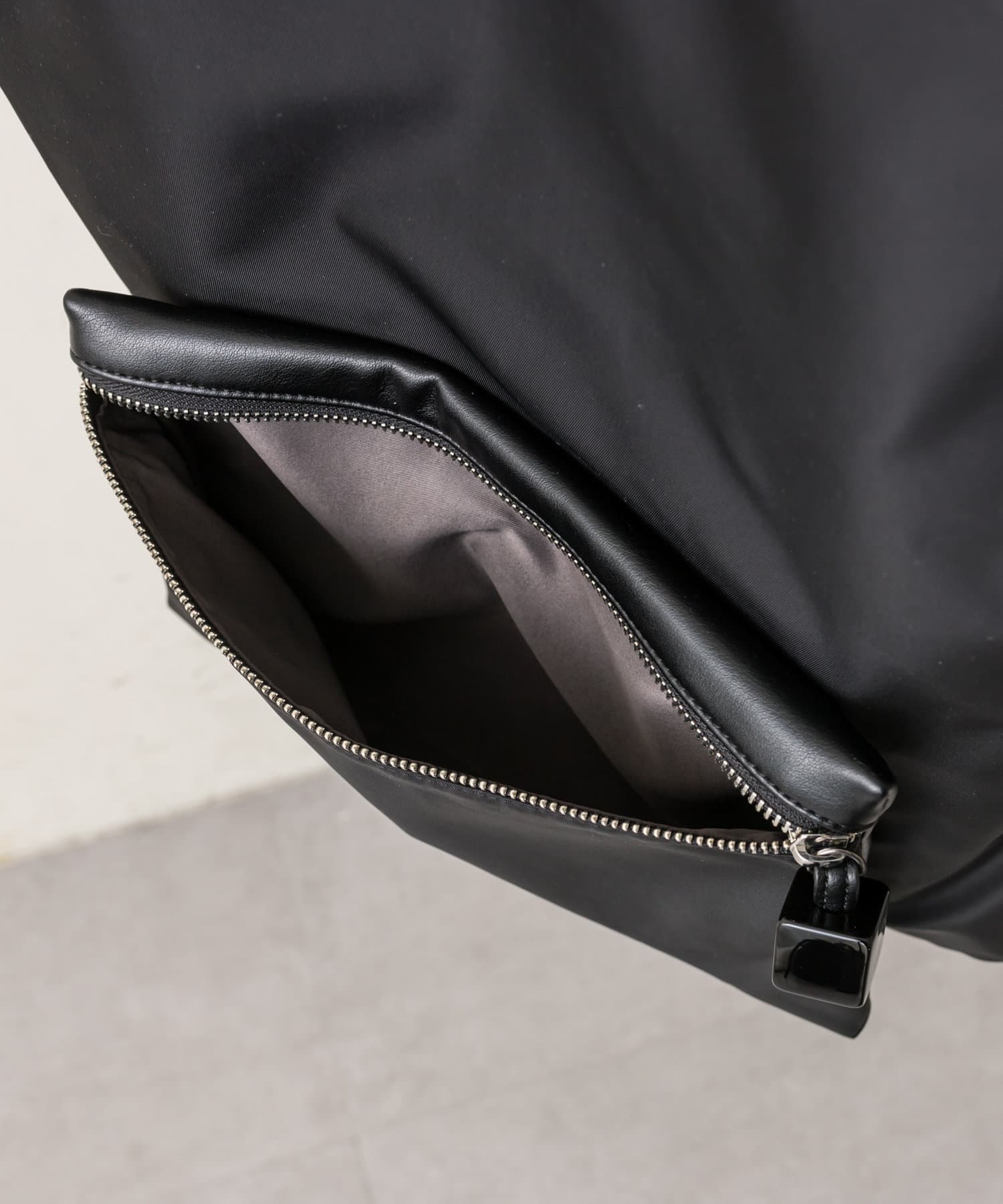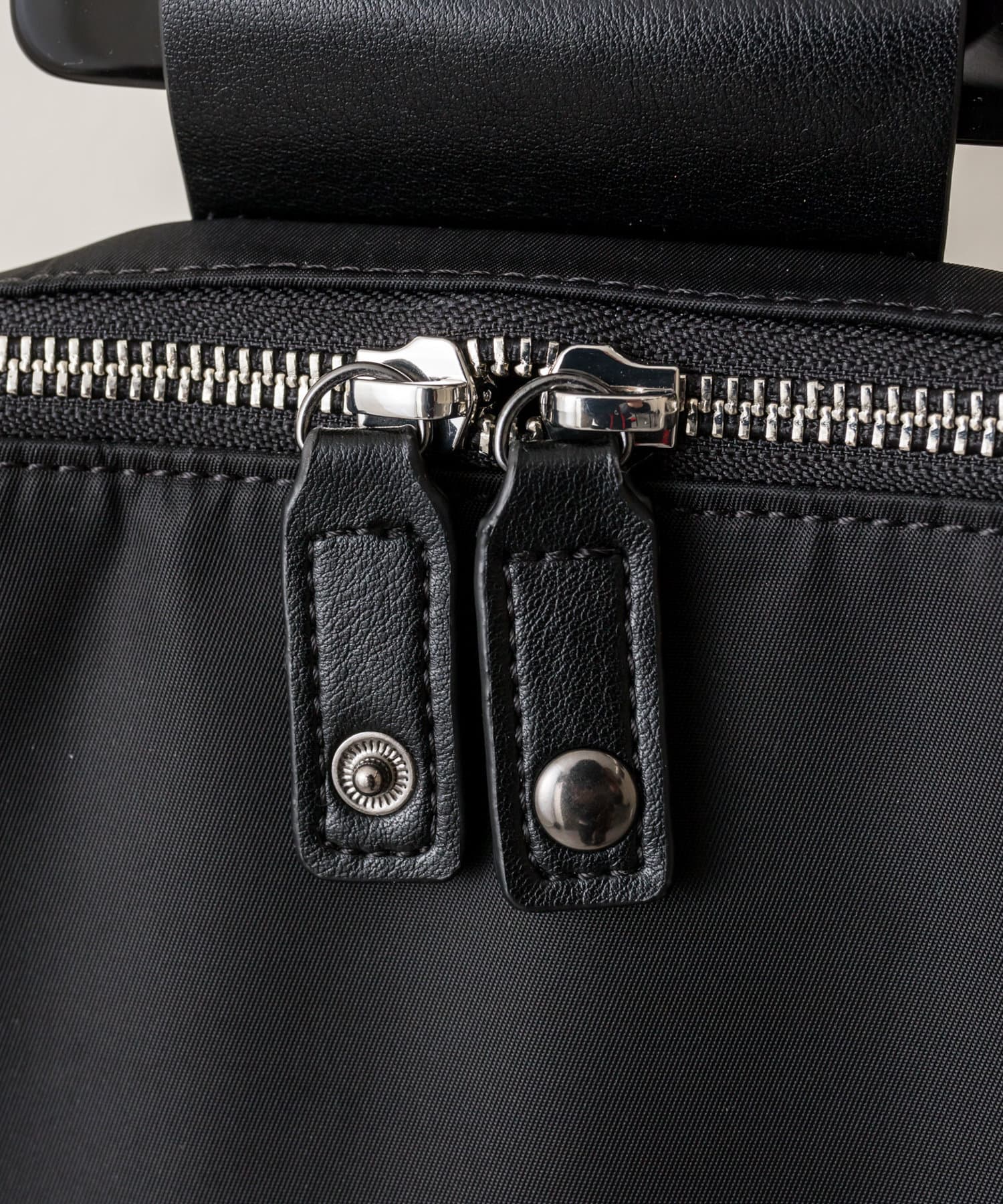 キューブ型の樹脂パーツ引手がポイントの立体的な外ポケットは合成皮革を使用。