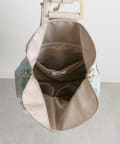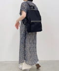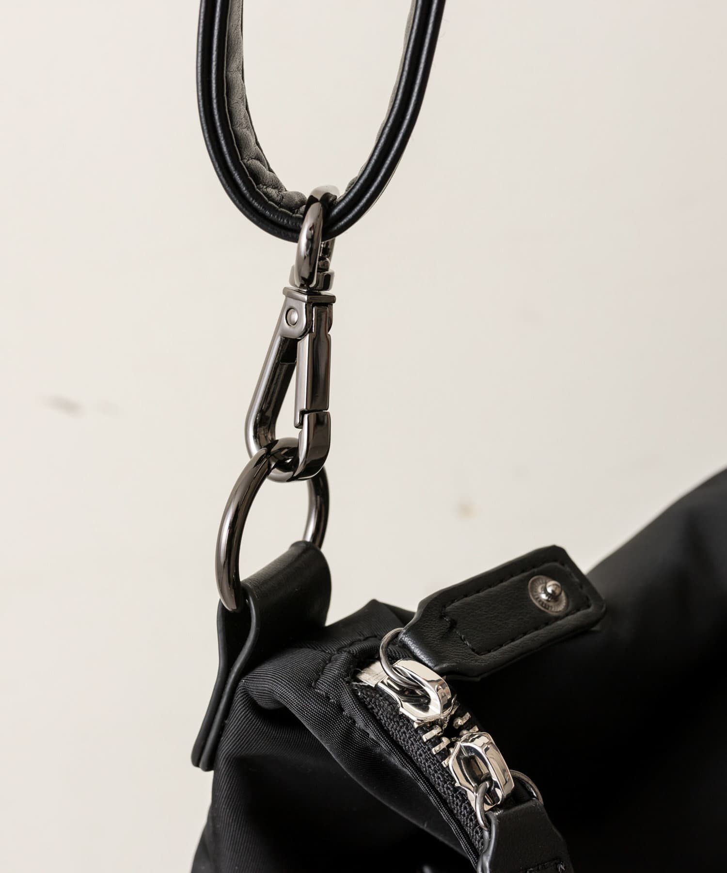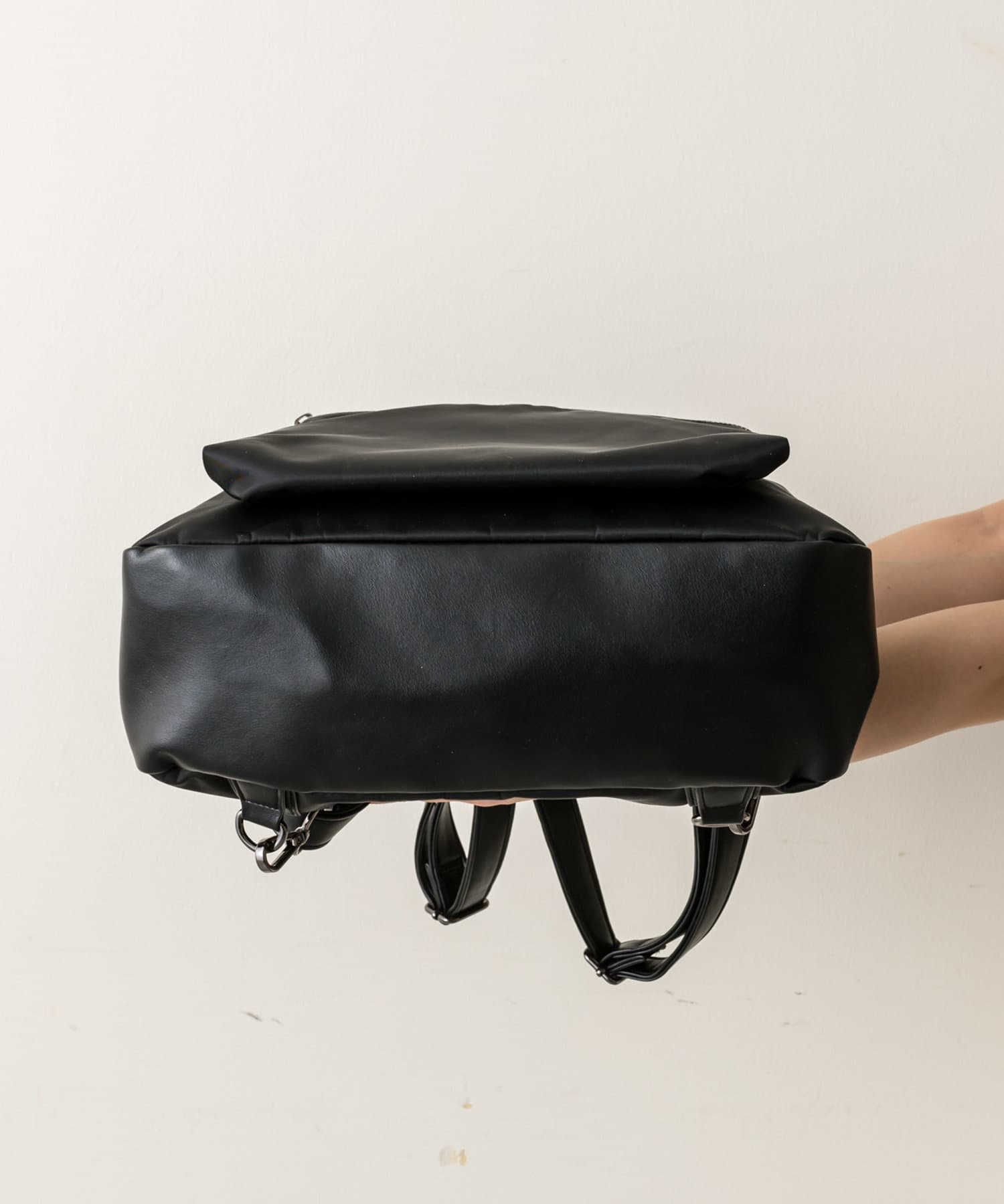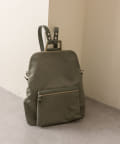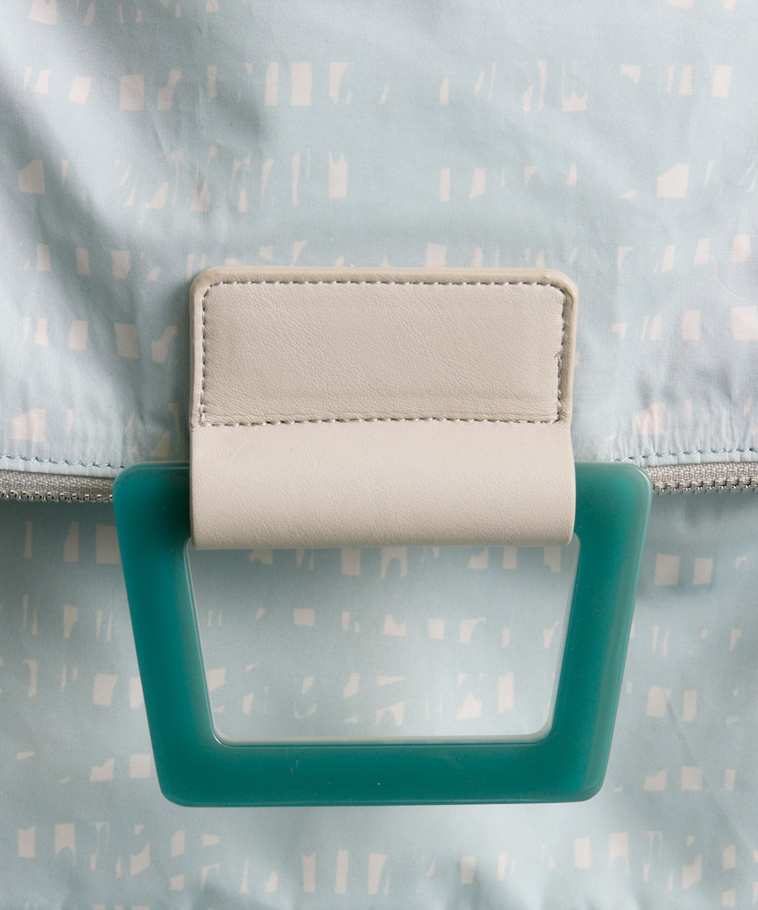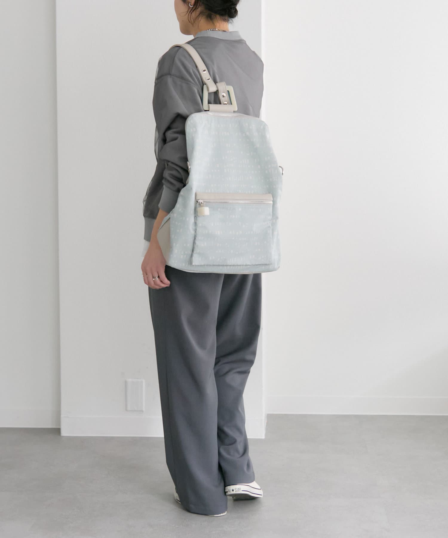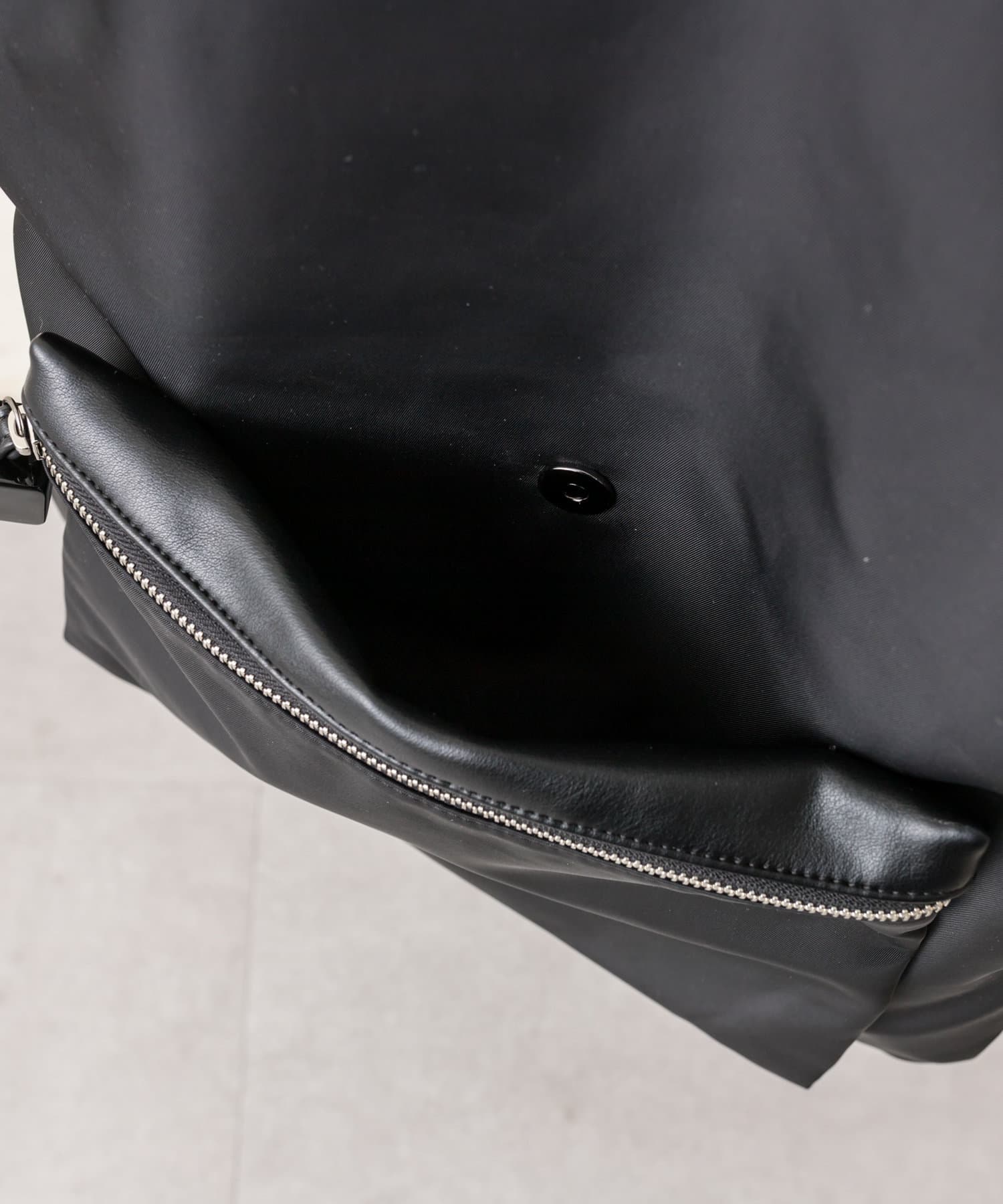 キューブ型の樹脂パーツ引手がポイントの立体的な外ポケットは合成皮革を使用。