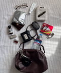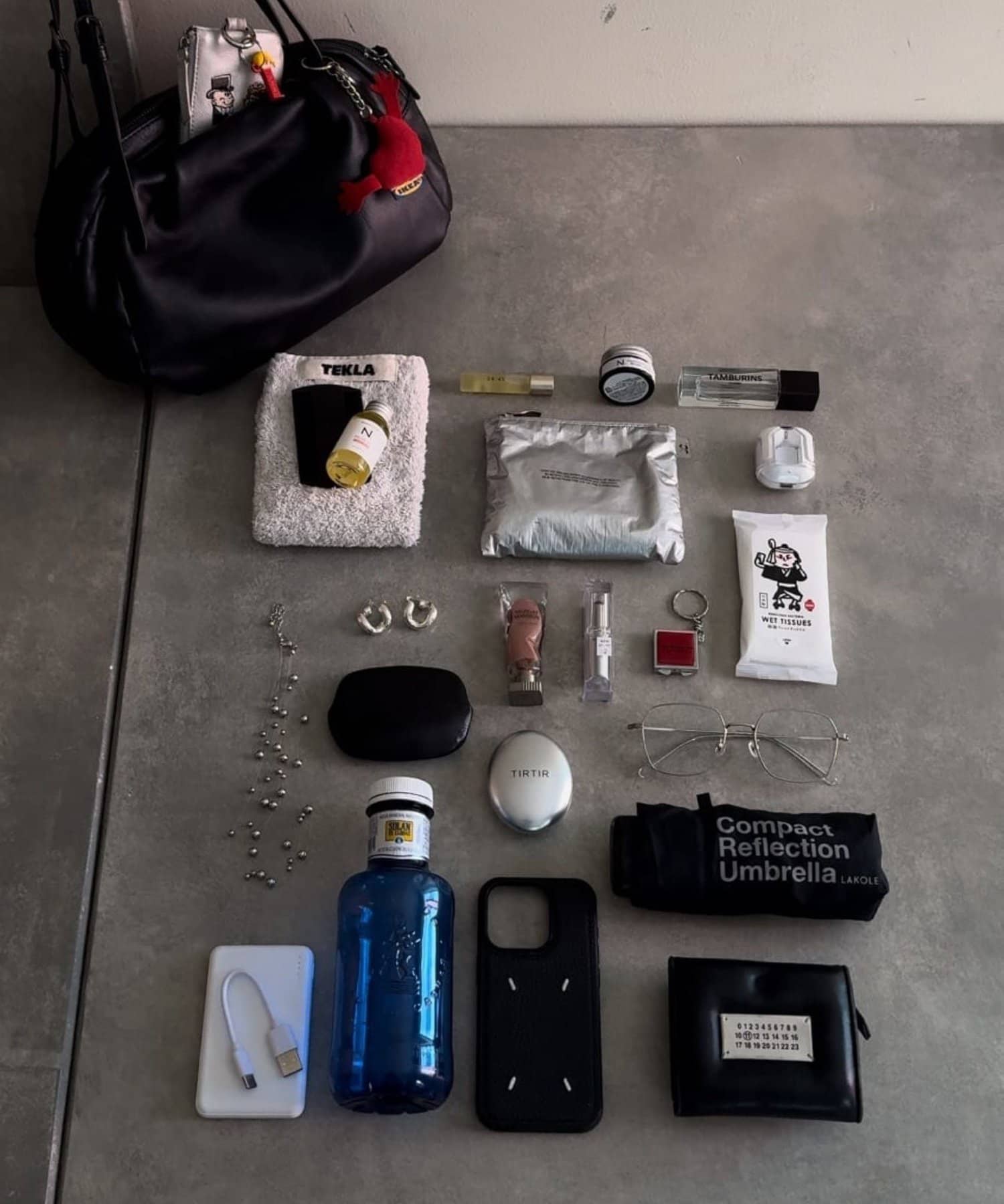 長財布、小銭入れ、メガネケース、ミニポーチ、のど飴、ハンカチ、ワイヤレスイヤホンをメインに、サイドにはパスケース、スマホが入って余裕がありました。サイドのポケットが深めで使いやすいです。試したところ、さらに500mlのペットボトルを横向きに、ユニクロの折りたたみ傘も入りました。持ち手が細いのであまり入れ過ぎない方が持ちやすいです。
