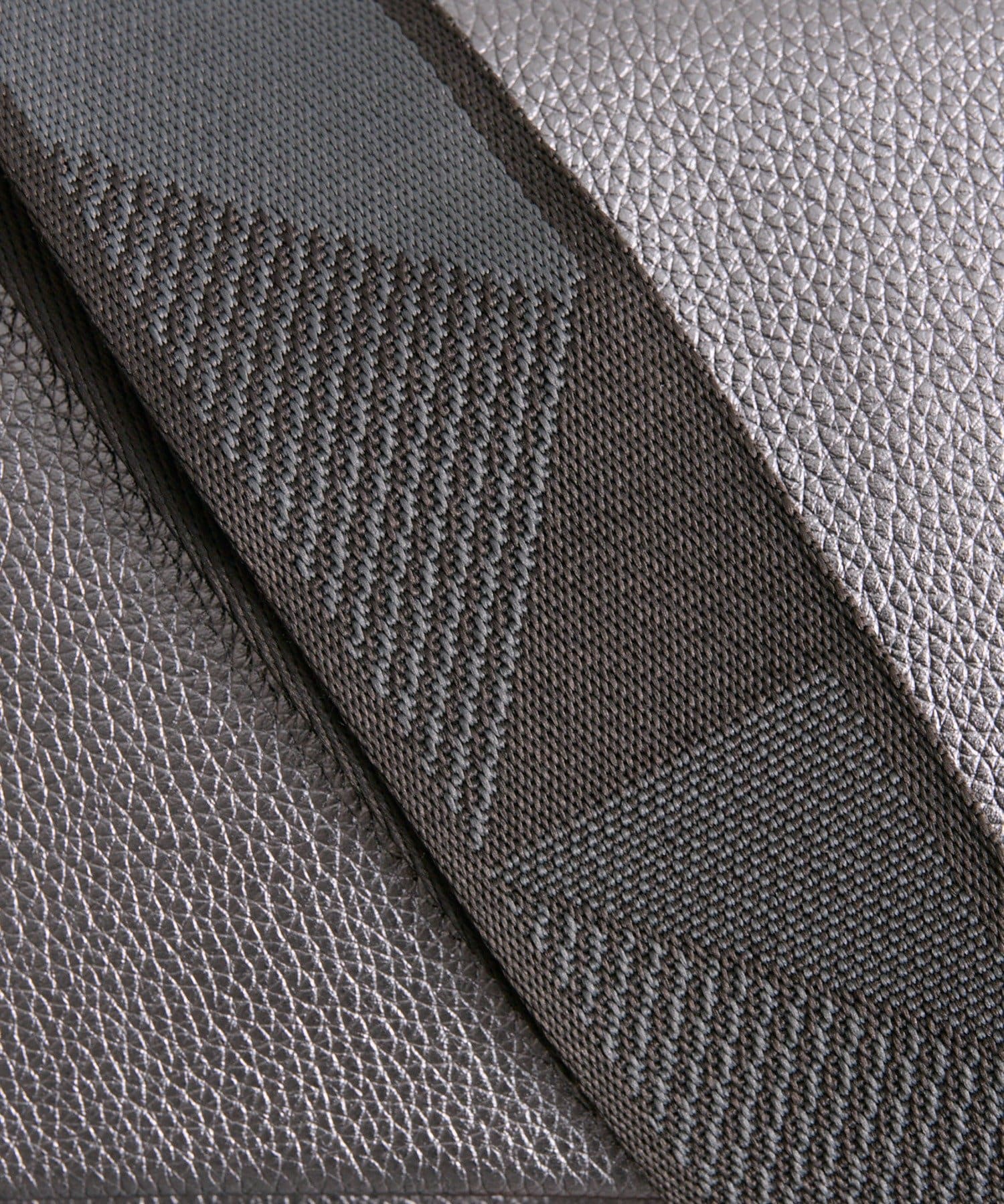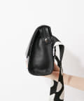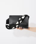 個性的な幅広のショルダーベルトに上品なレザーを合わせた