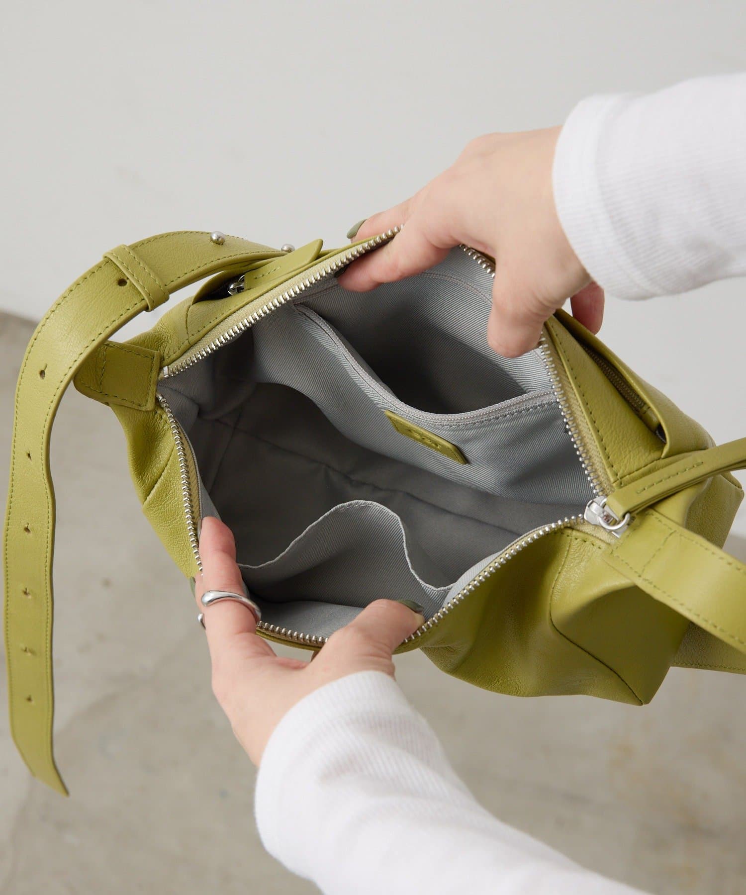 斜めがけなどにはせず、2つ目ないし3つ目のホールで短めに留めて肩にかけ、長くベルトを垂らして手前に魅せて待つのがモード系にはおすすめ。わたしは147cmと小柄ですが、意外と長すぎることなく垂れたベルトが程よくモード感を演出してくれてgoodです!このベルトの細さが絶妙なのだと思います。バッグを取るときに掴みやすい。
