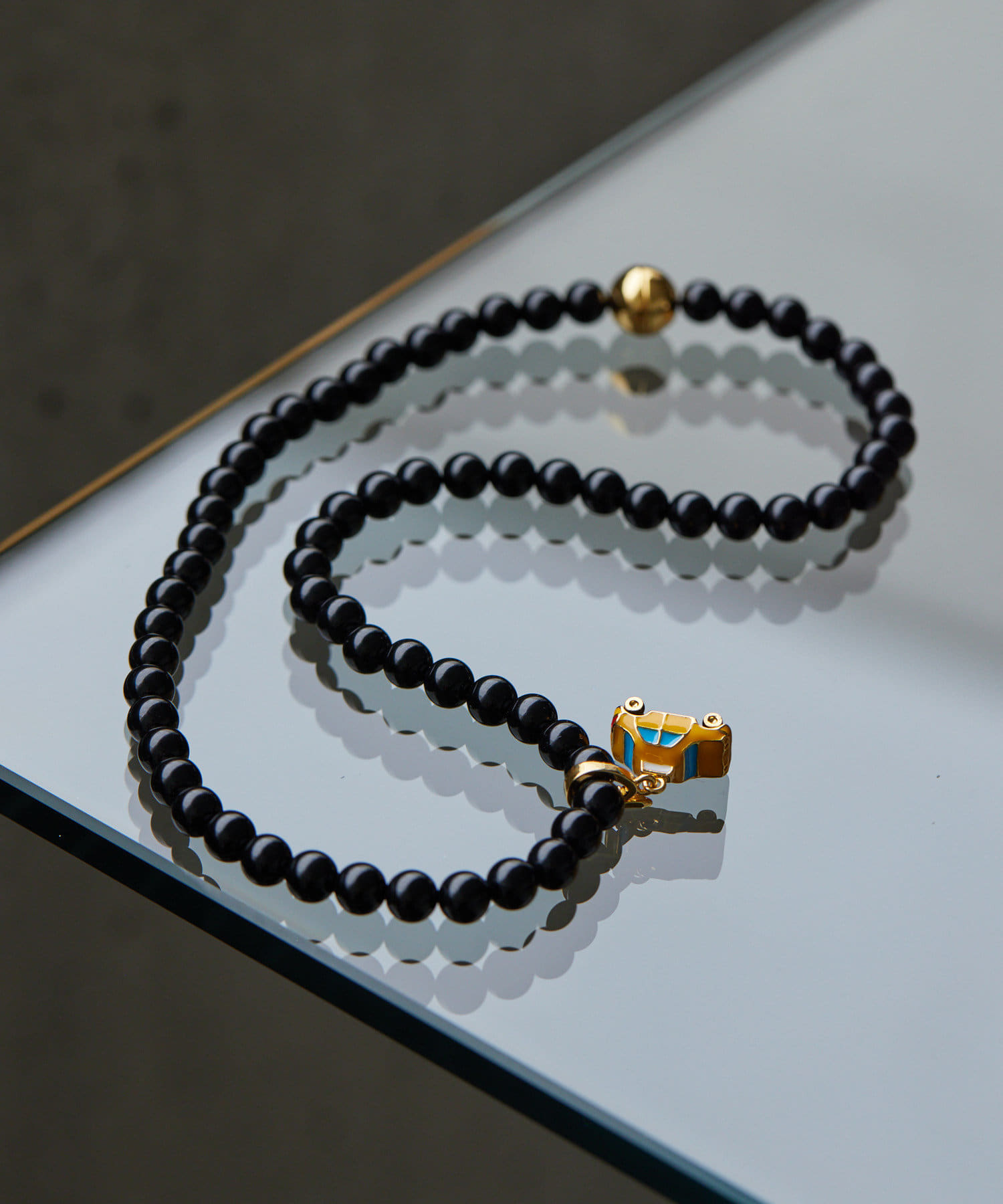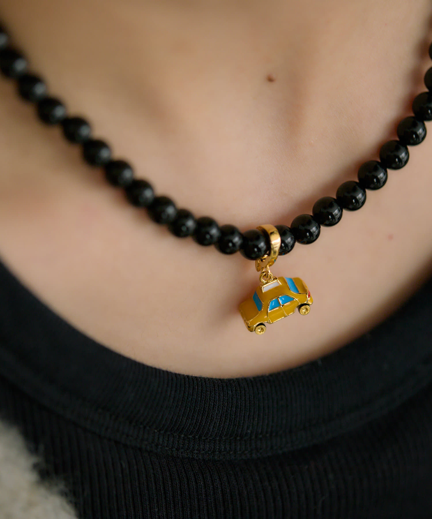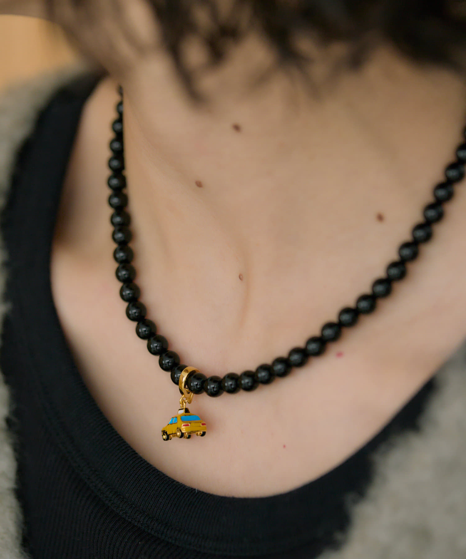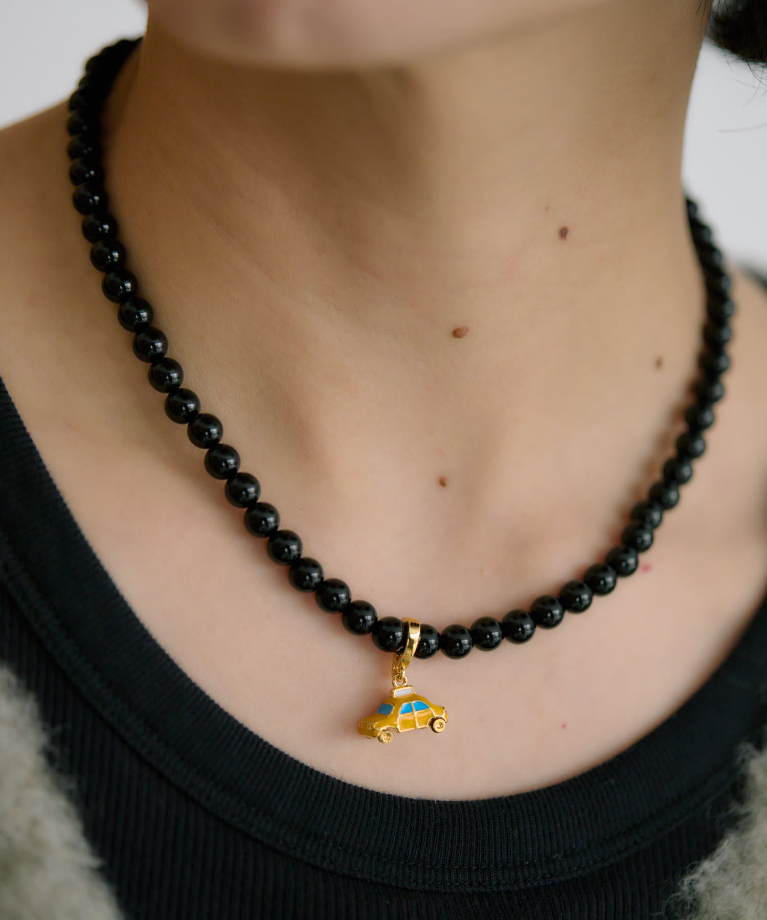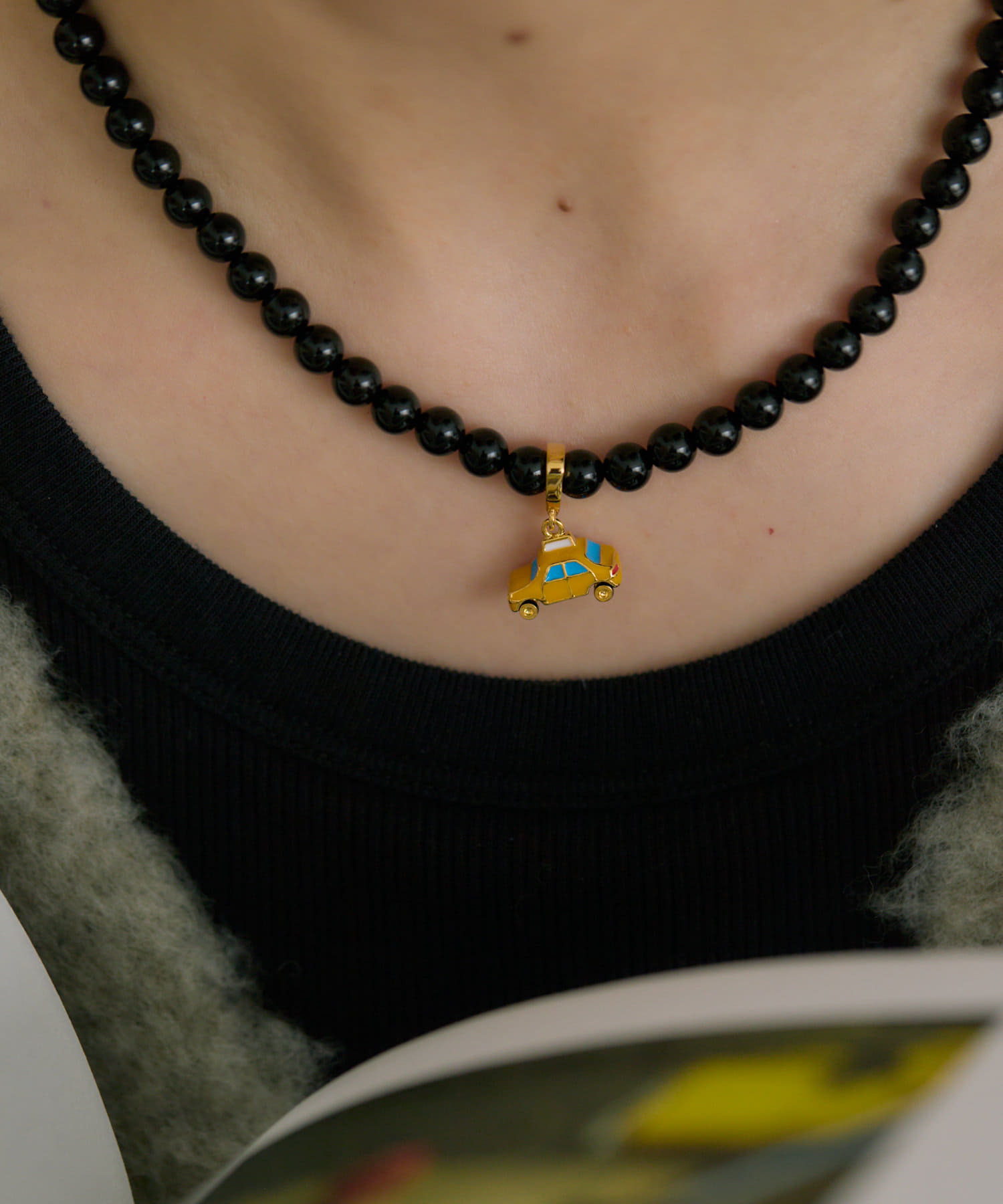イエローの車チャームが揺れる遊び心感じるネックレス。