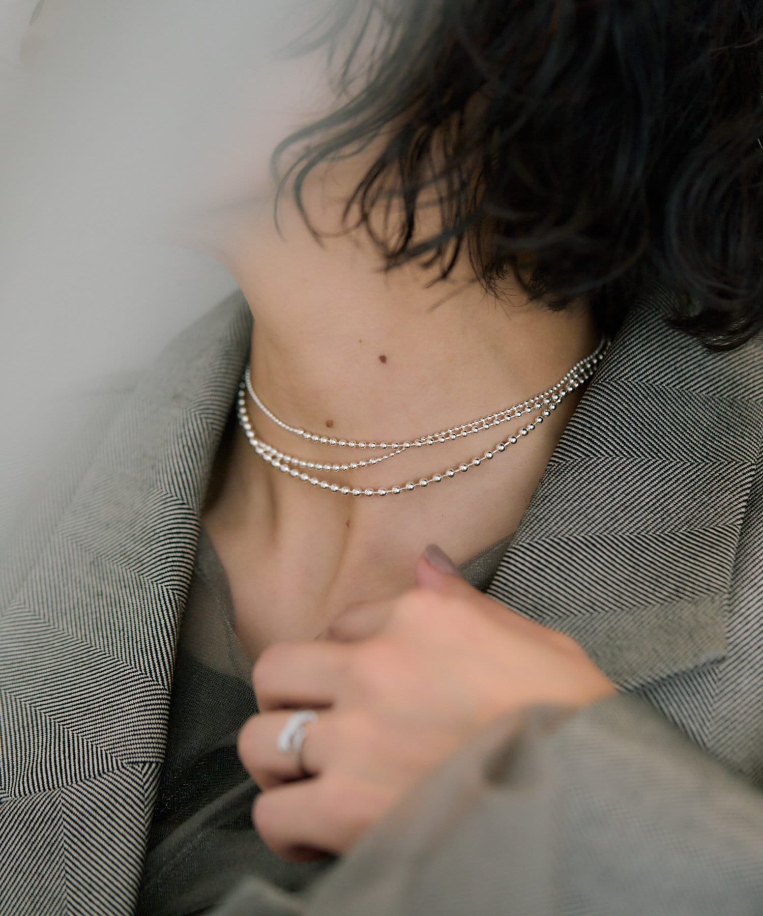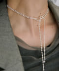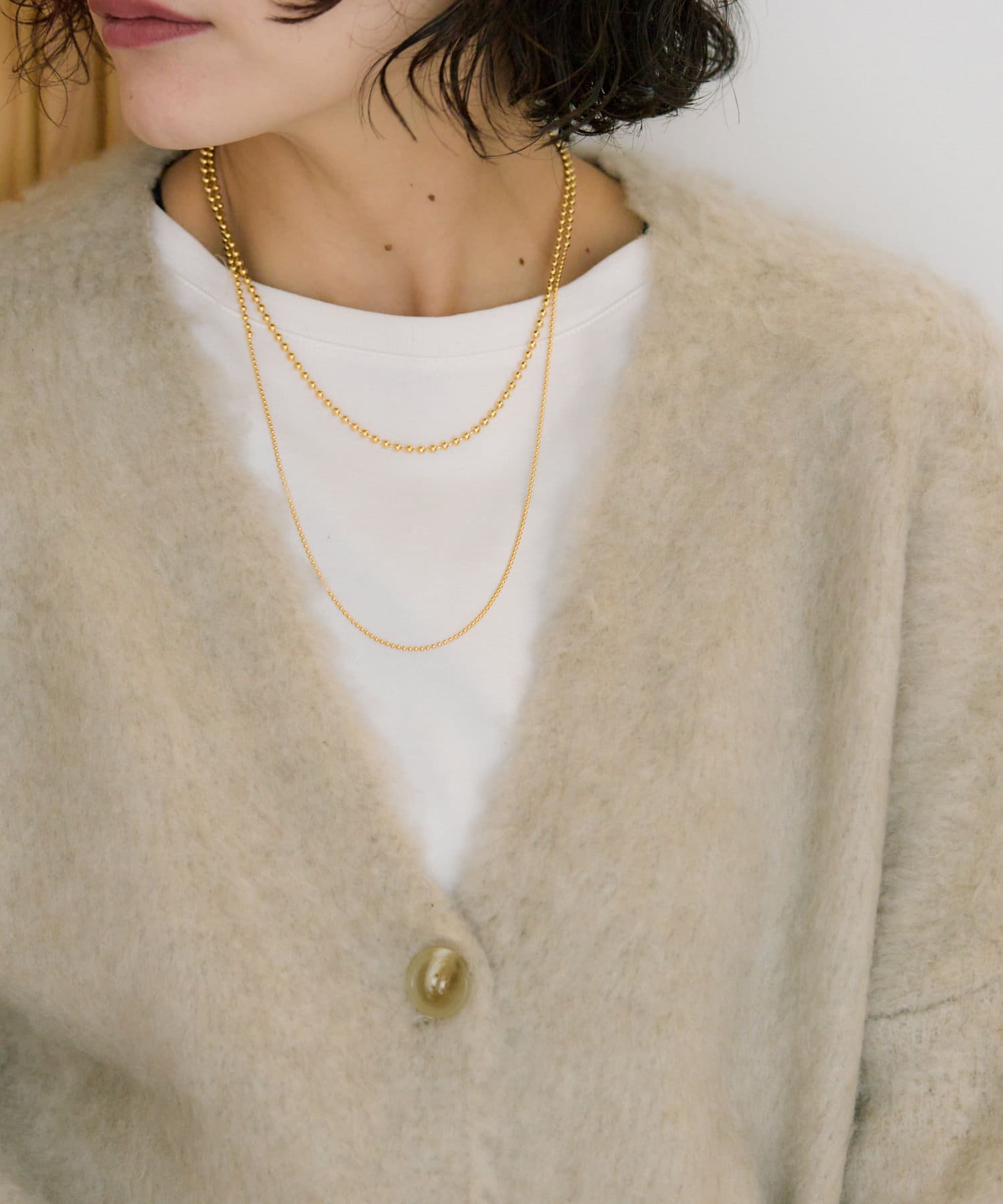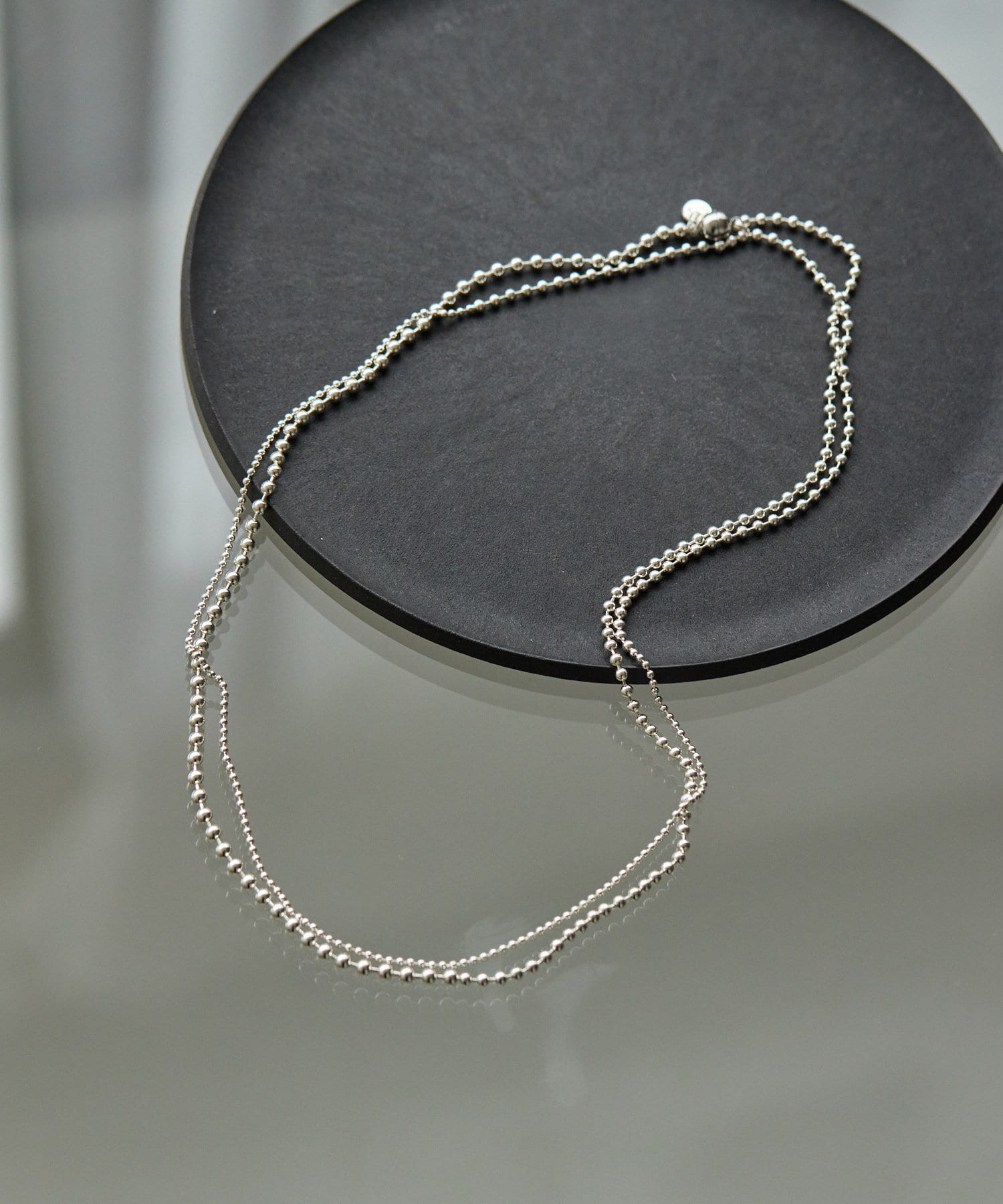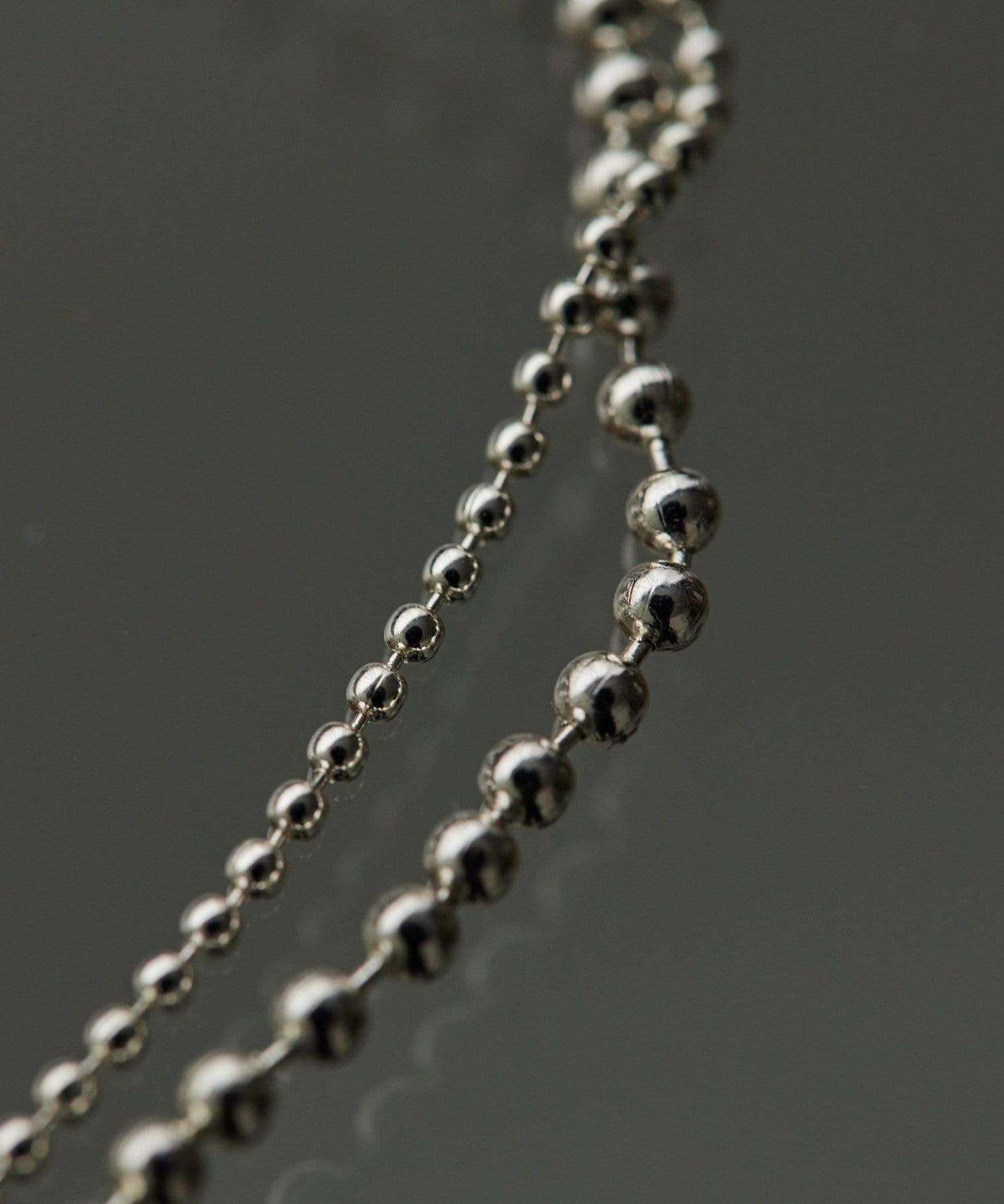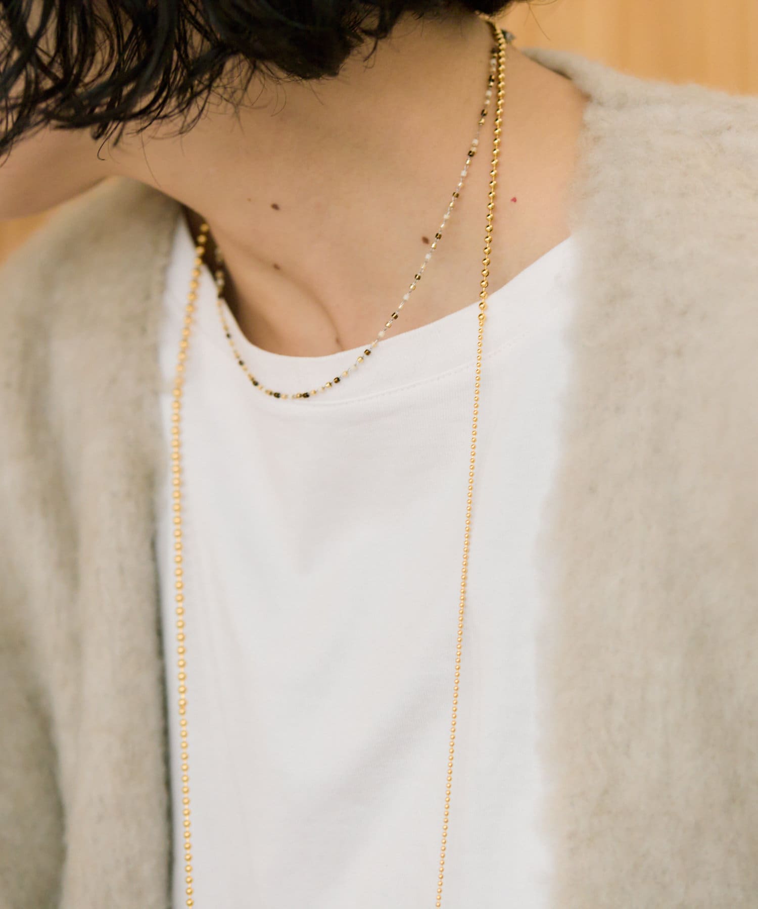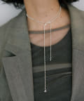 3種のボールチェーンを連ねたロングネックレス。