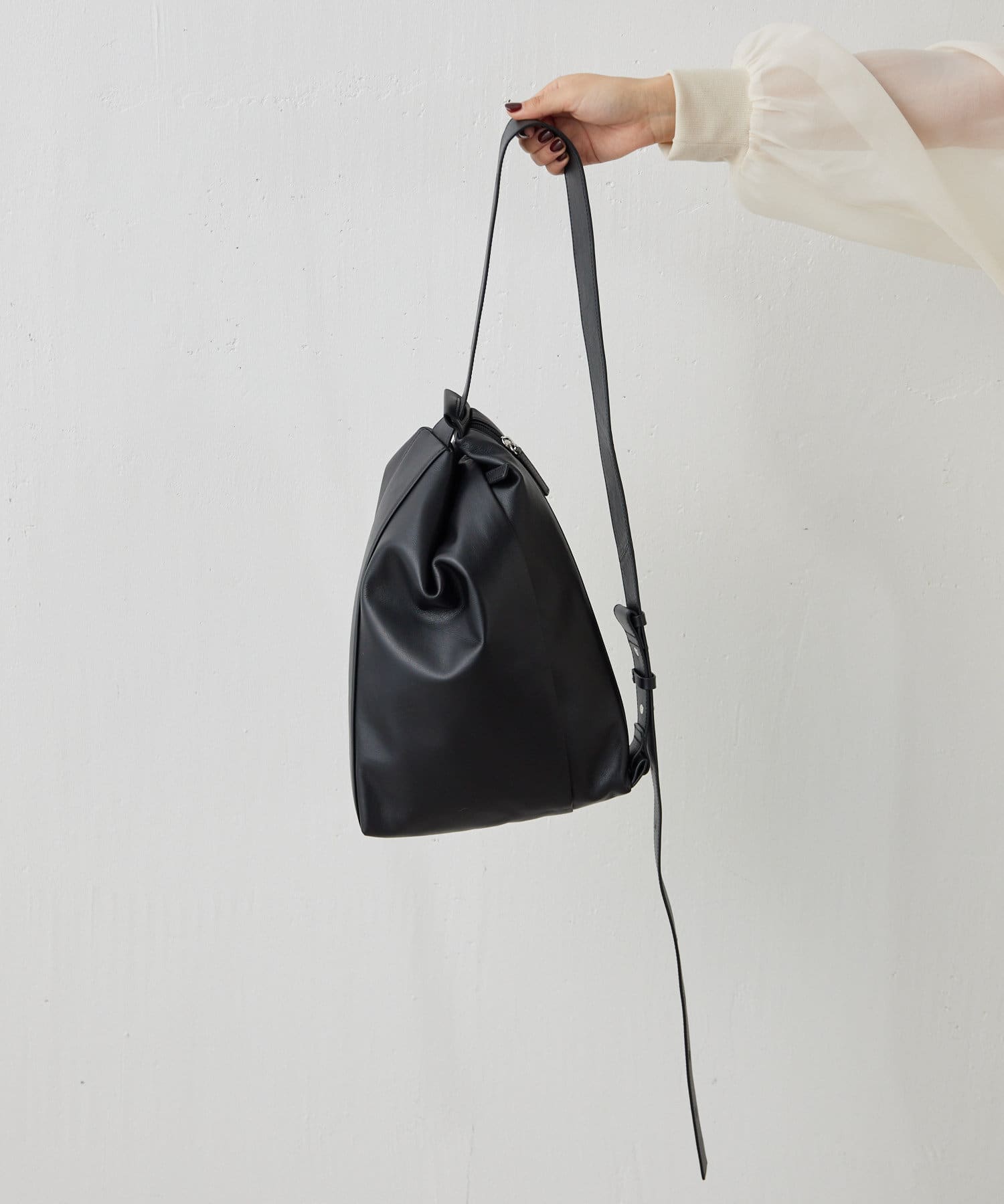 ショルダーとしても、巾着型のリュック風としても持てる2WAY仕様で、