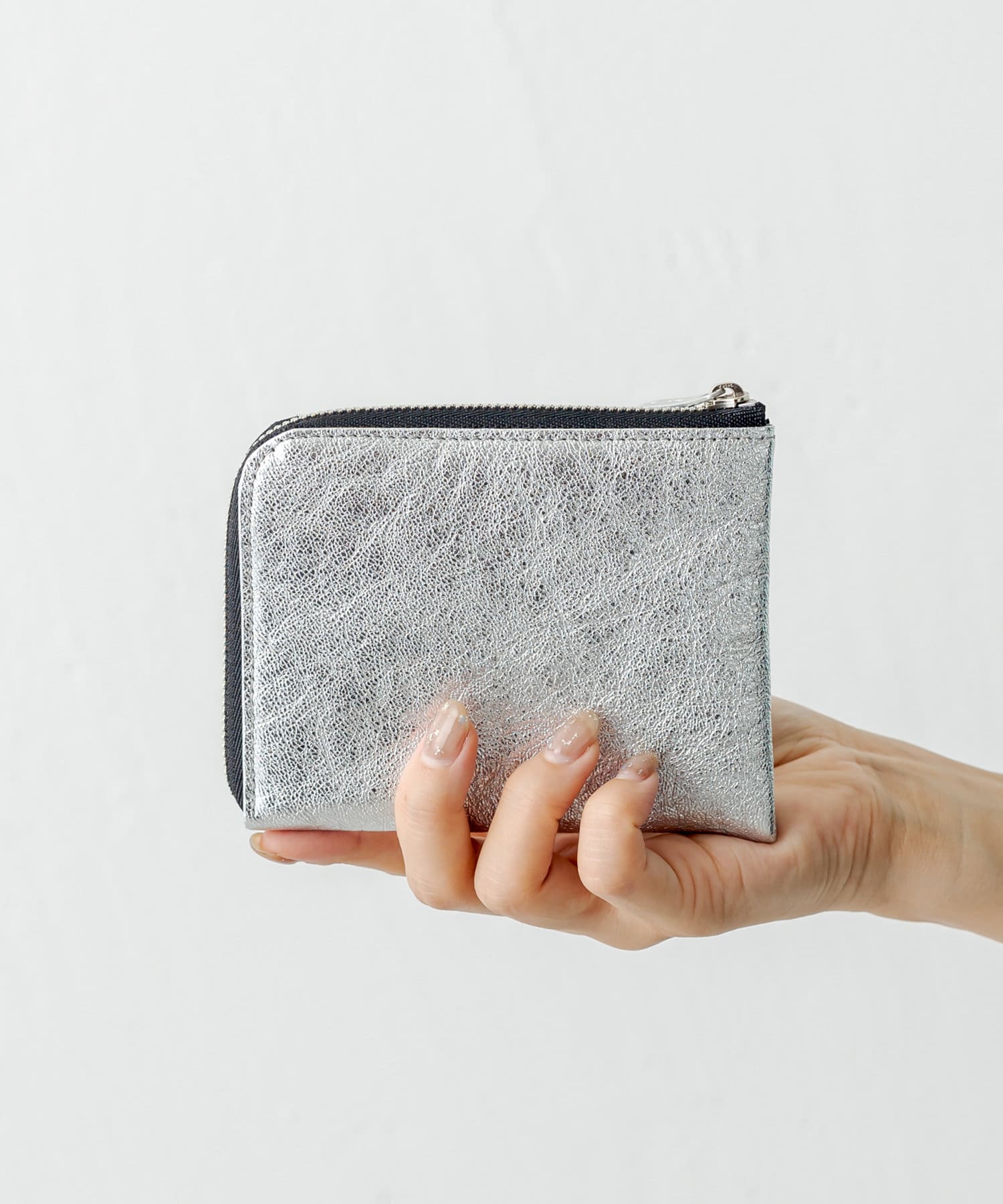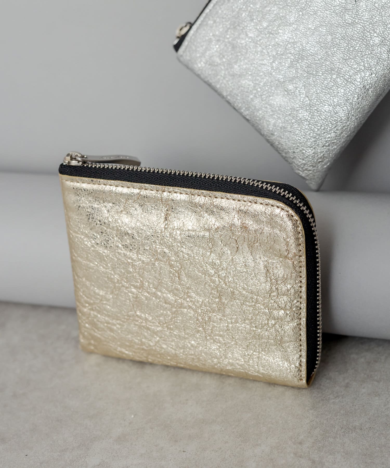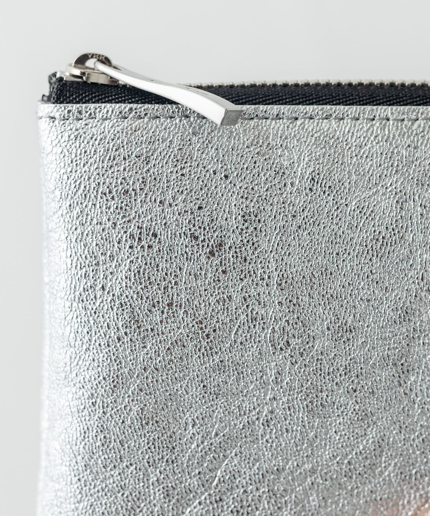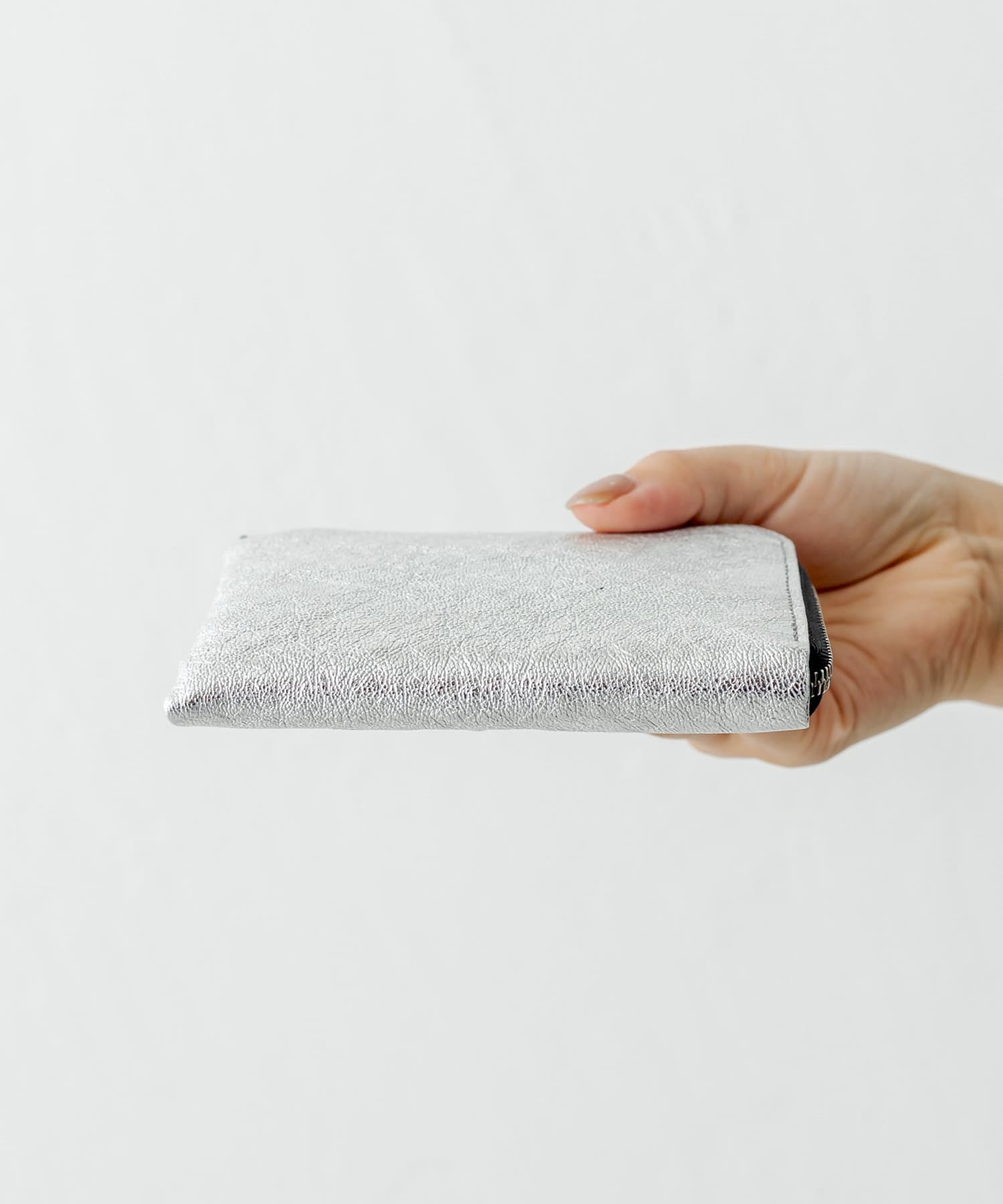本体にはやぎ革にシルバー箔を圧着し、更に洗い&ヒートドラムシュリンク加工を施した革質が感じられるメタリック素材。