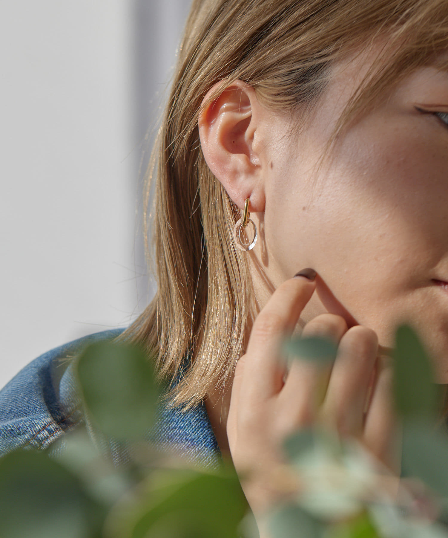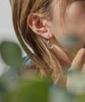 さりげない輝きが、顔周りを華やかに彩ります。カットされたガラスが光を捉え、キラキラと上品に輝く様子は、つけるだけで気分を上げてくれるアイテムです。