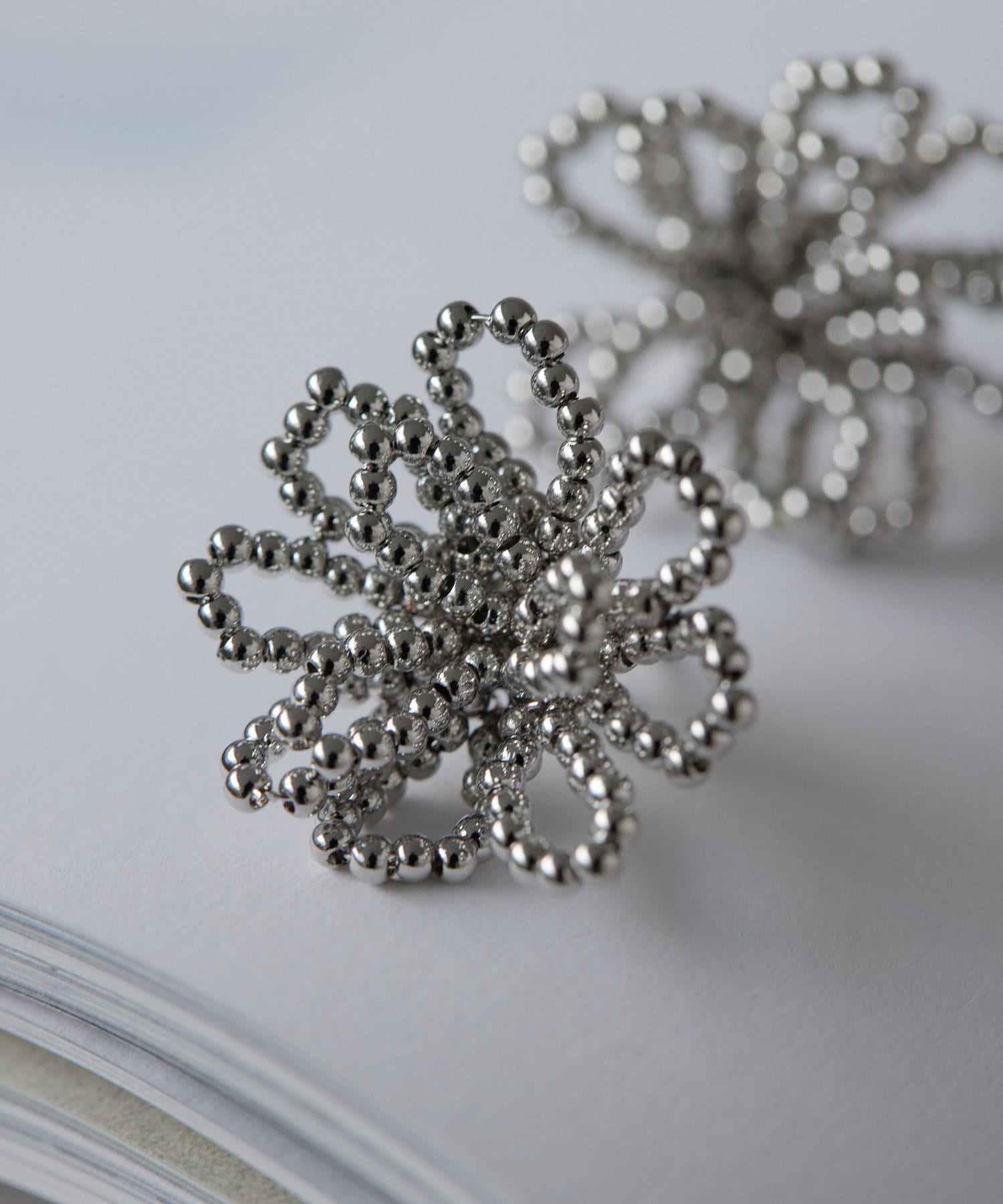 上品な輝きを放つメタルビーズが、立体的な花びらを表現し、顔周りを華やかに彩ります。