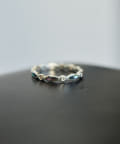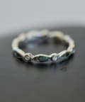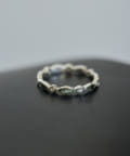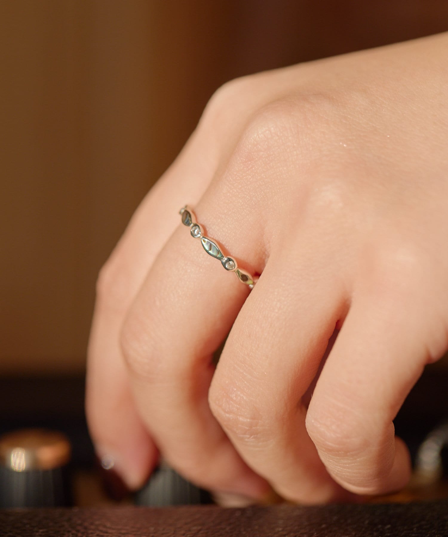 リーフチェーンシェルリングは、木の葉型シェルがぐるりと連なった、華奢で上品なリング。