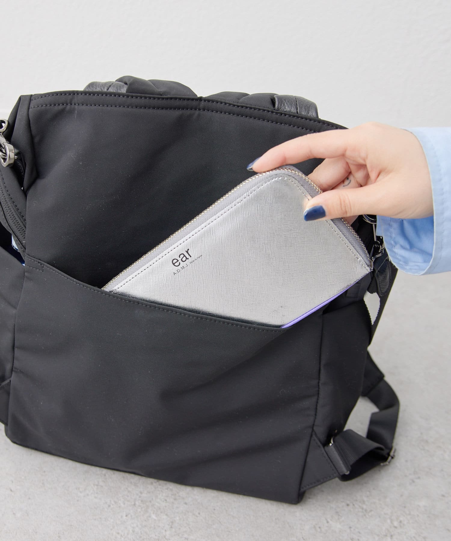 撥水加工を施したポリエステル素材を使用、急な雨の日も安心