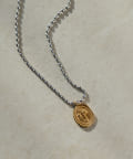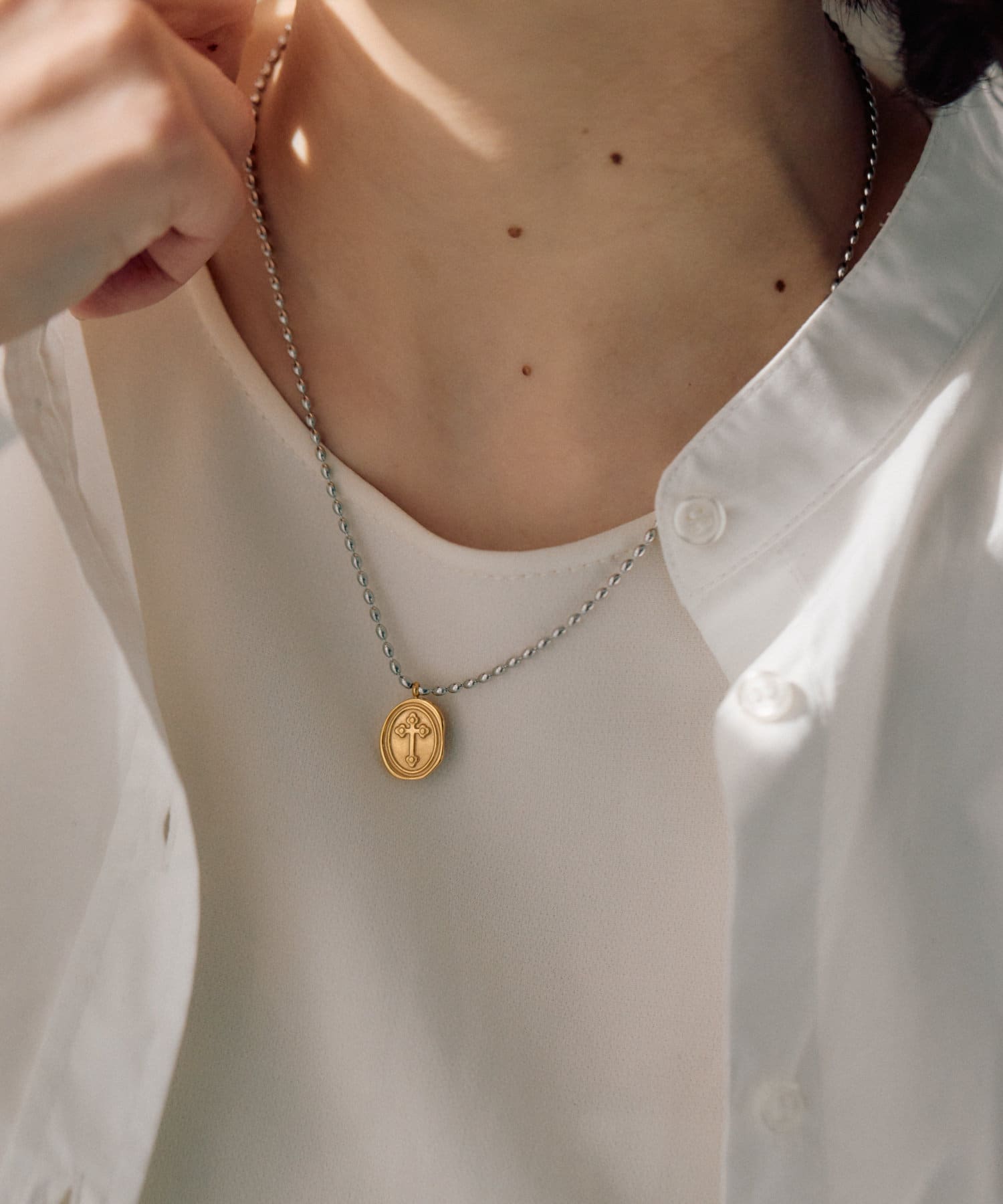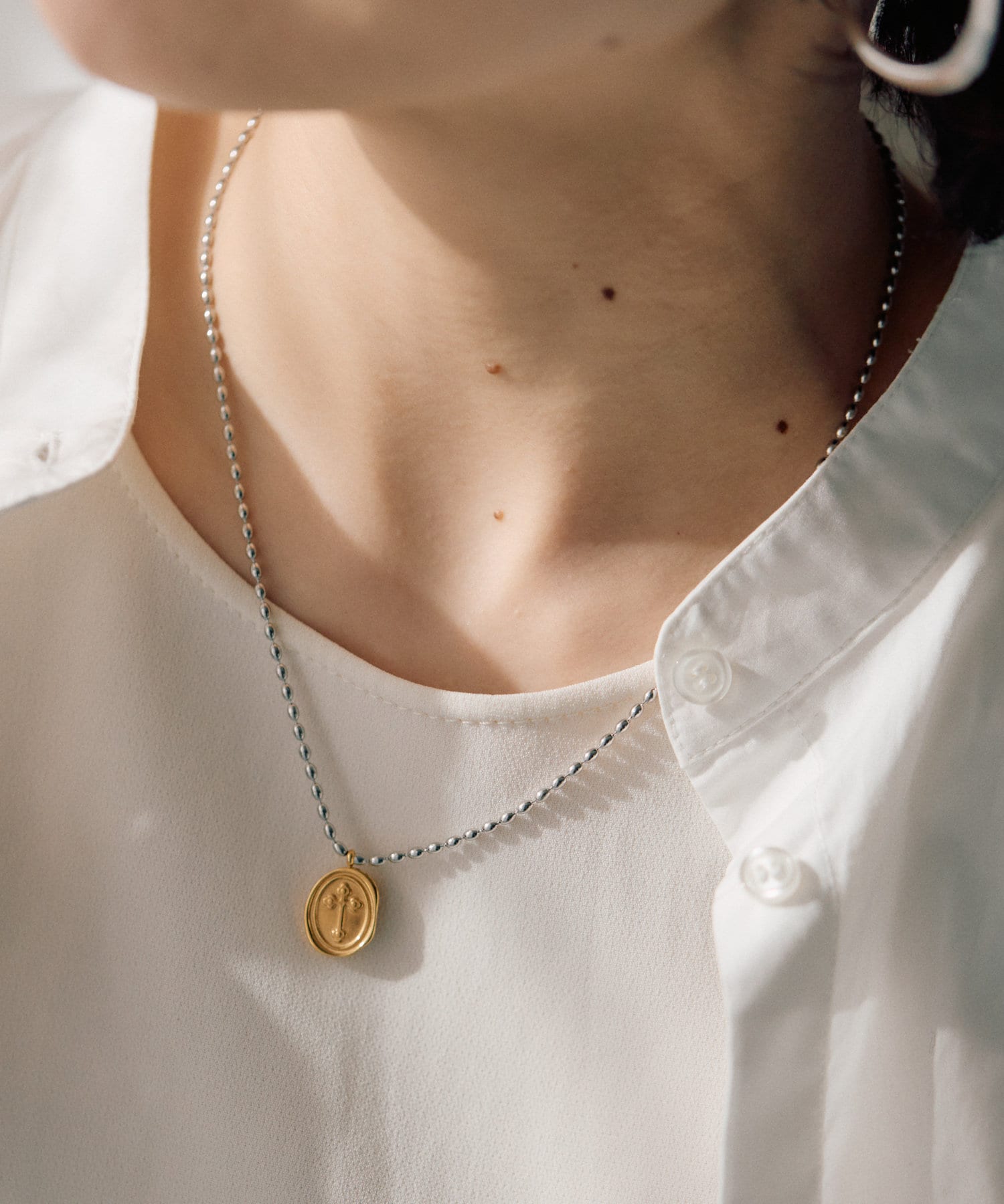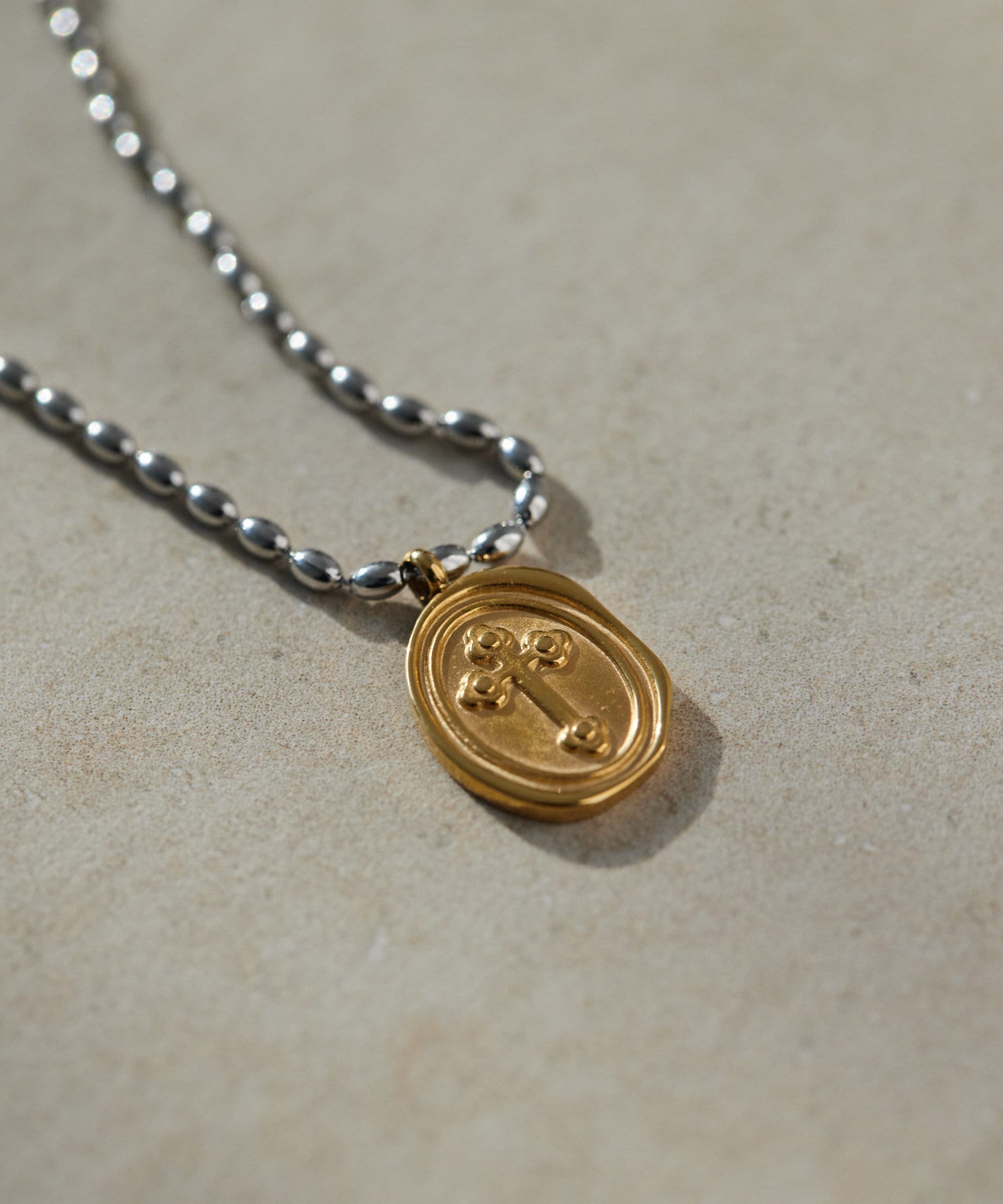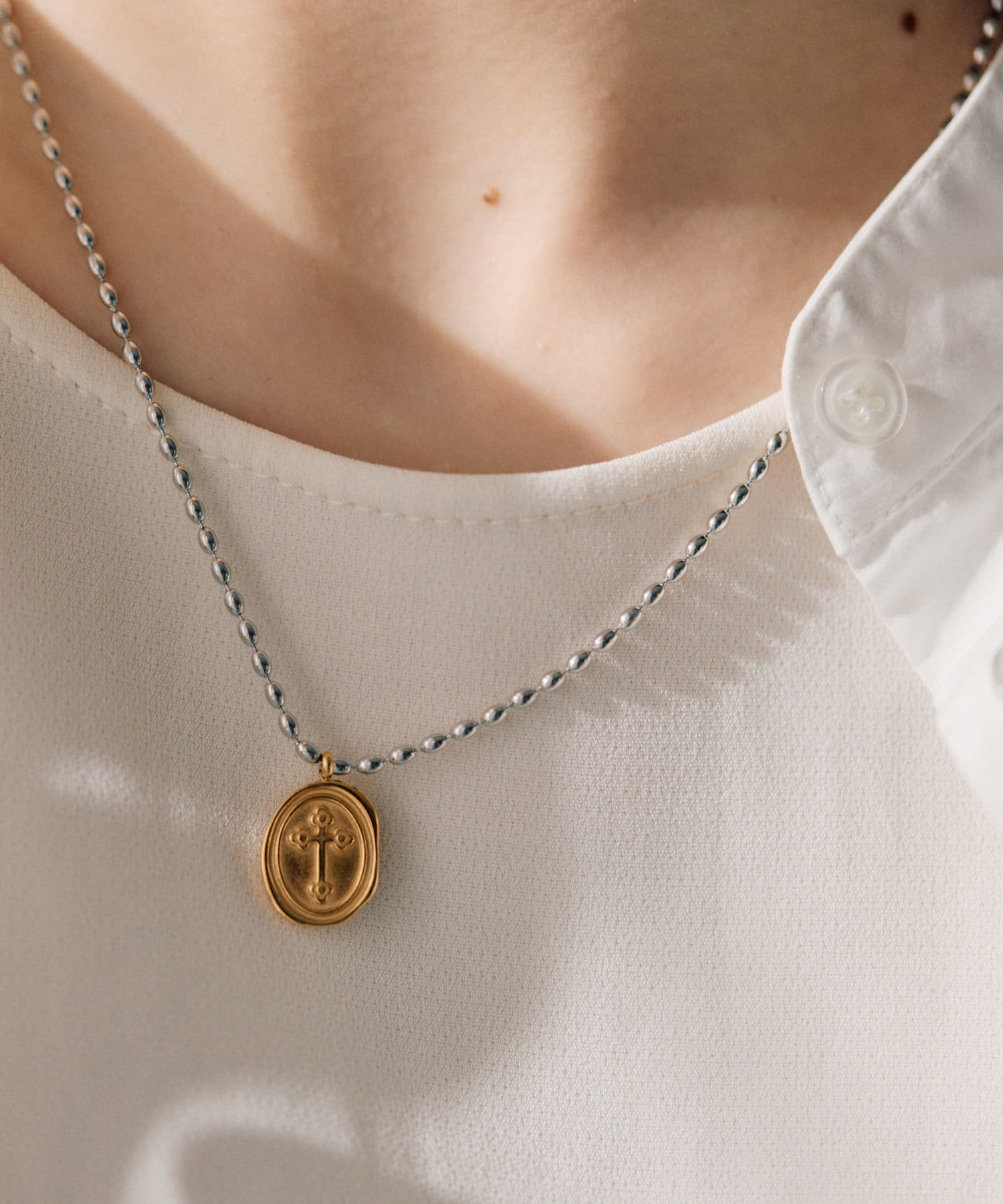 十字架モチーフのコインが目を惹くバイカラーネックレス。