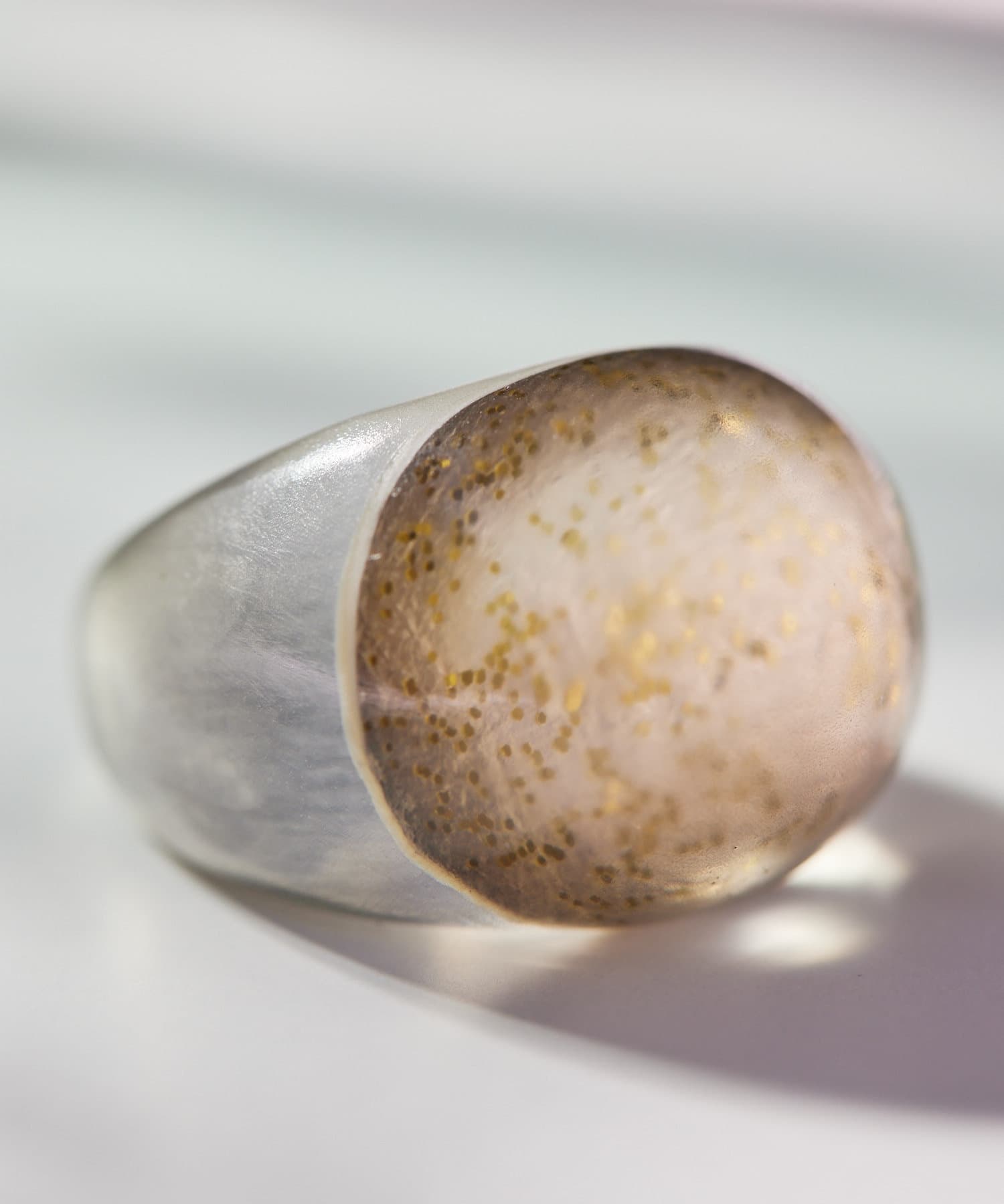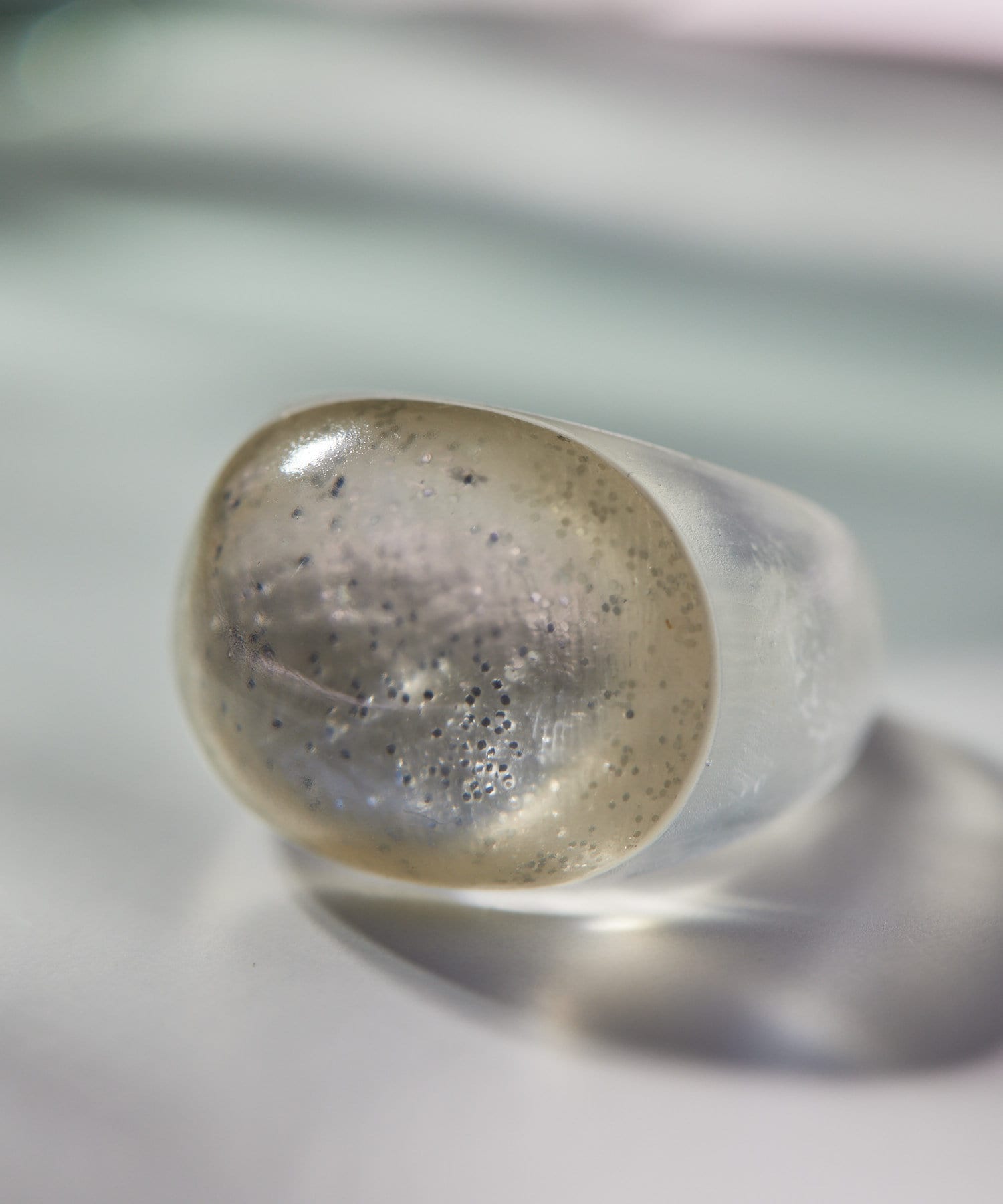 シェルプレートに施されたラメが、クリア樹脂の透け感と相まって、まるで星屑が舞う銀河系のような輝きを放ちます。