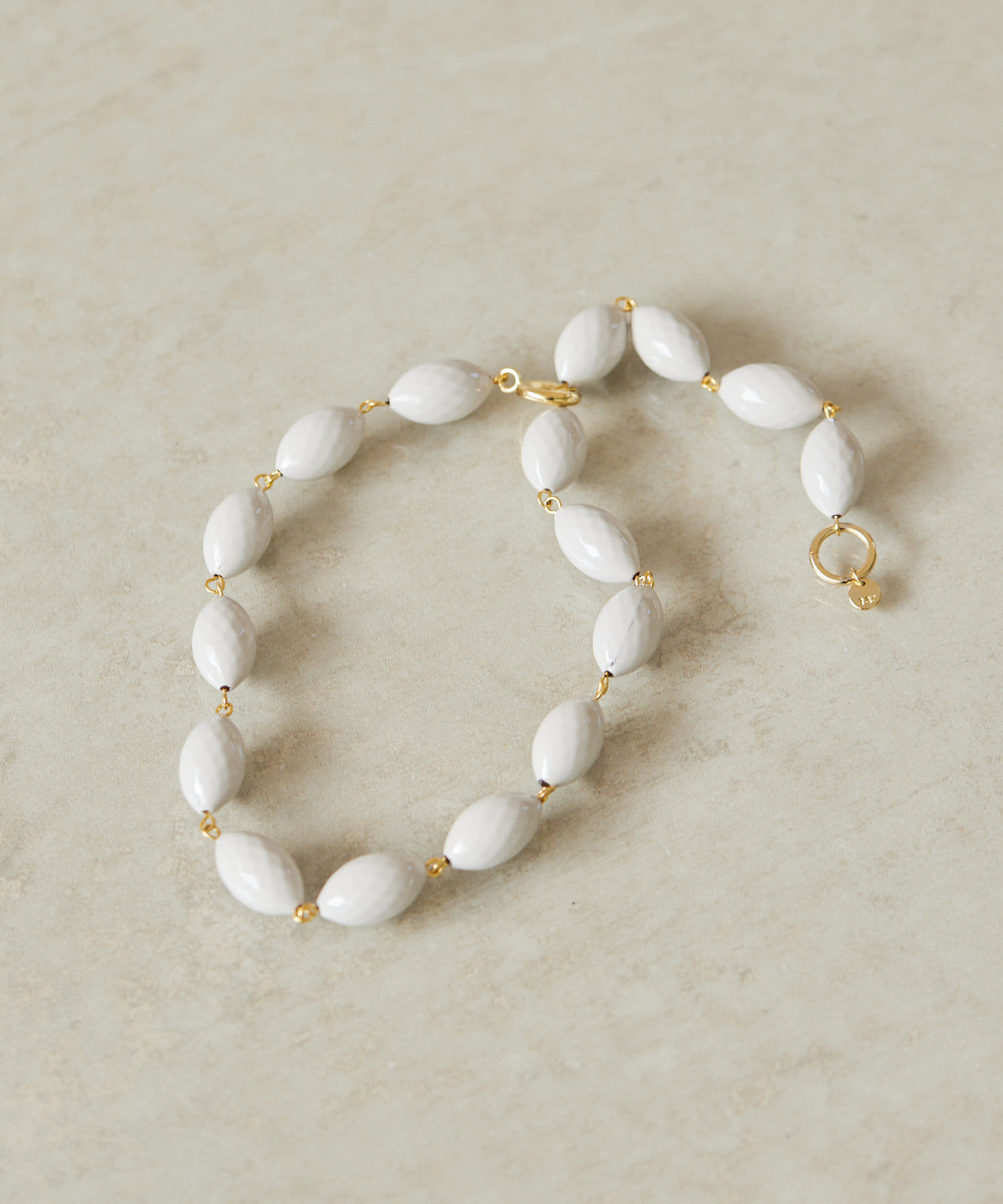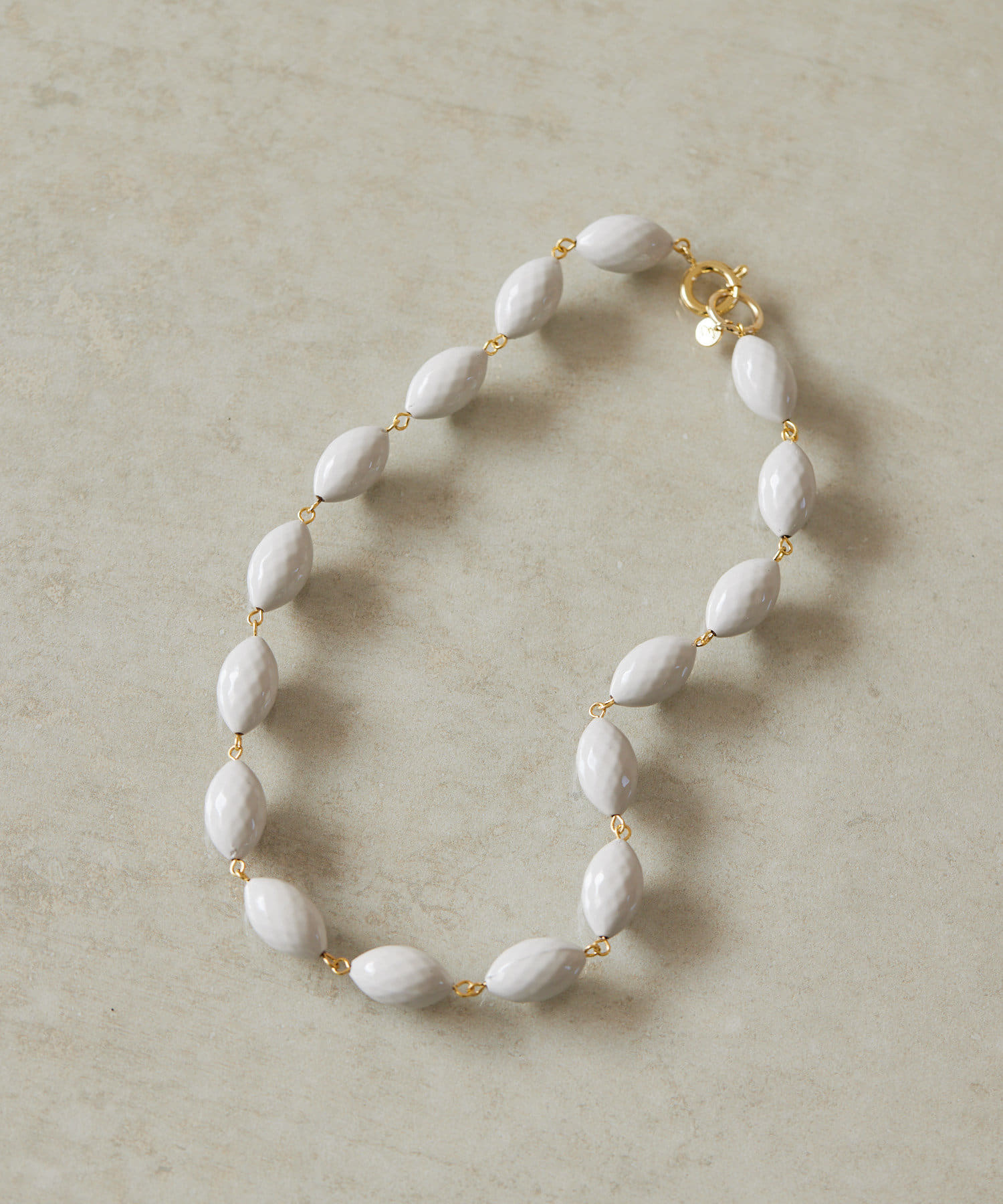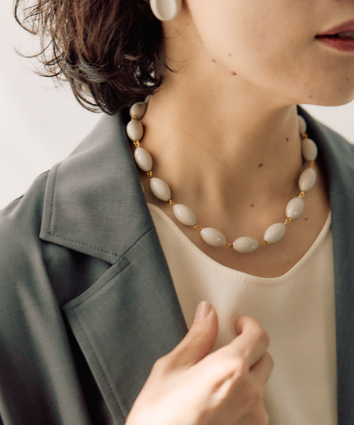 ころんとしたナツメ型のパーツが連なり、首元に程よいボリューム感をプラスします。