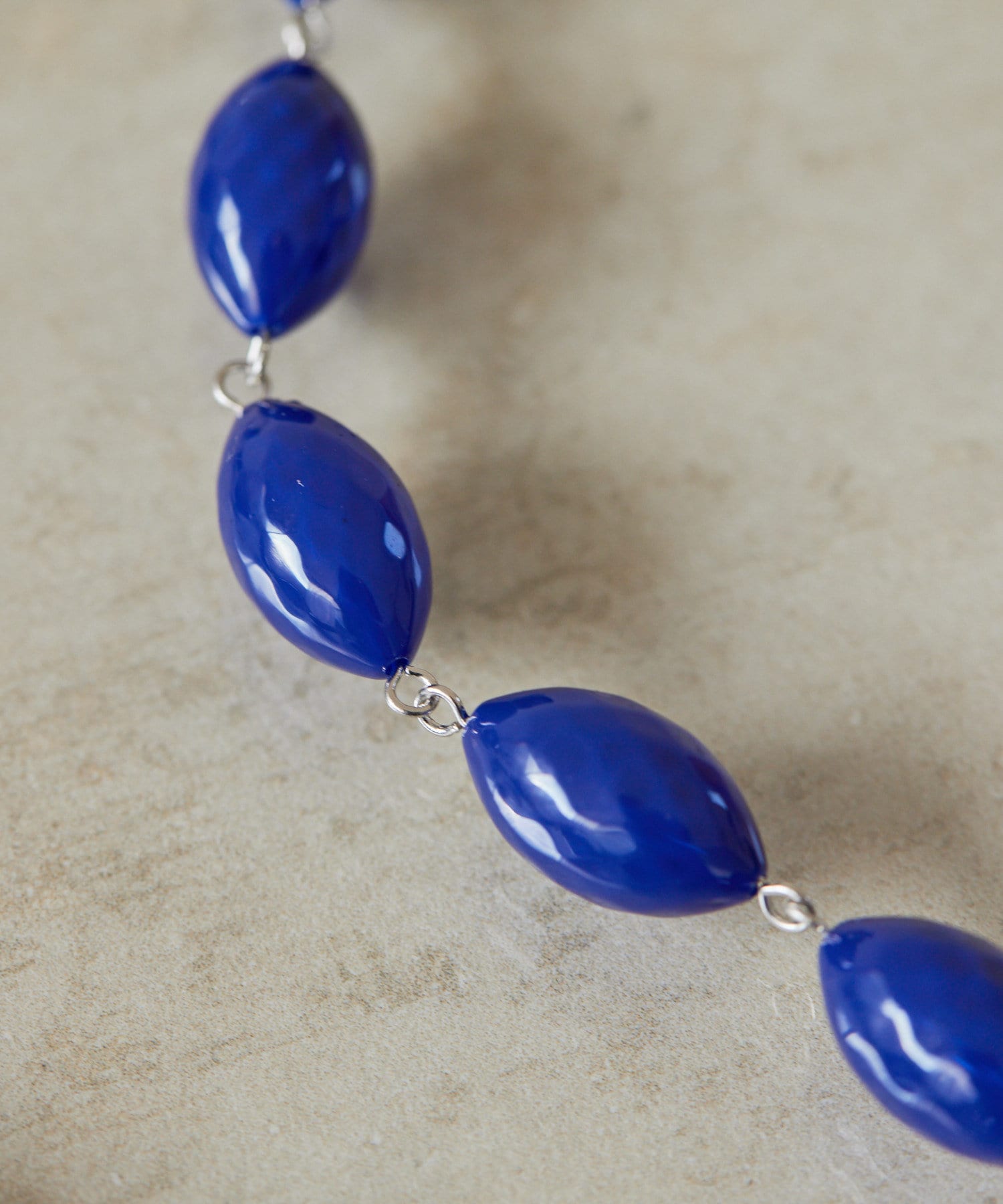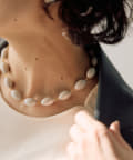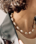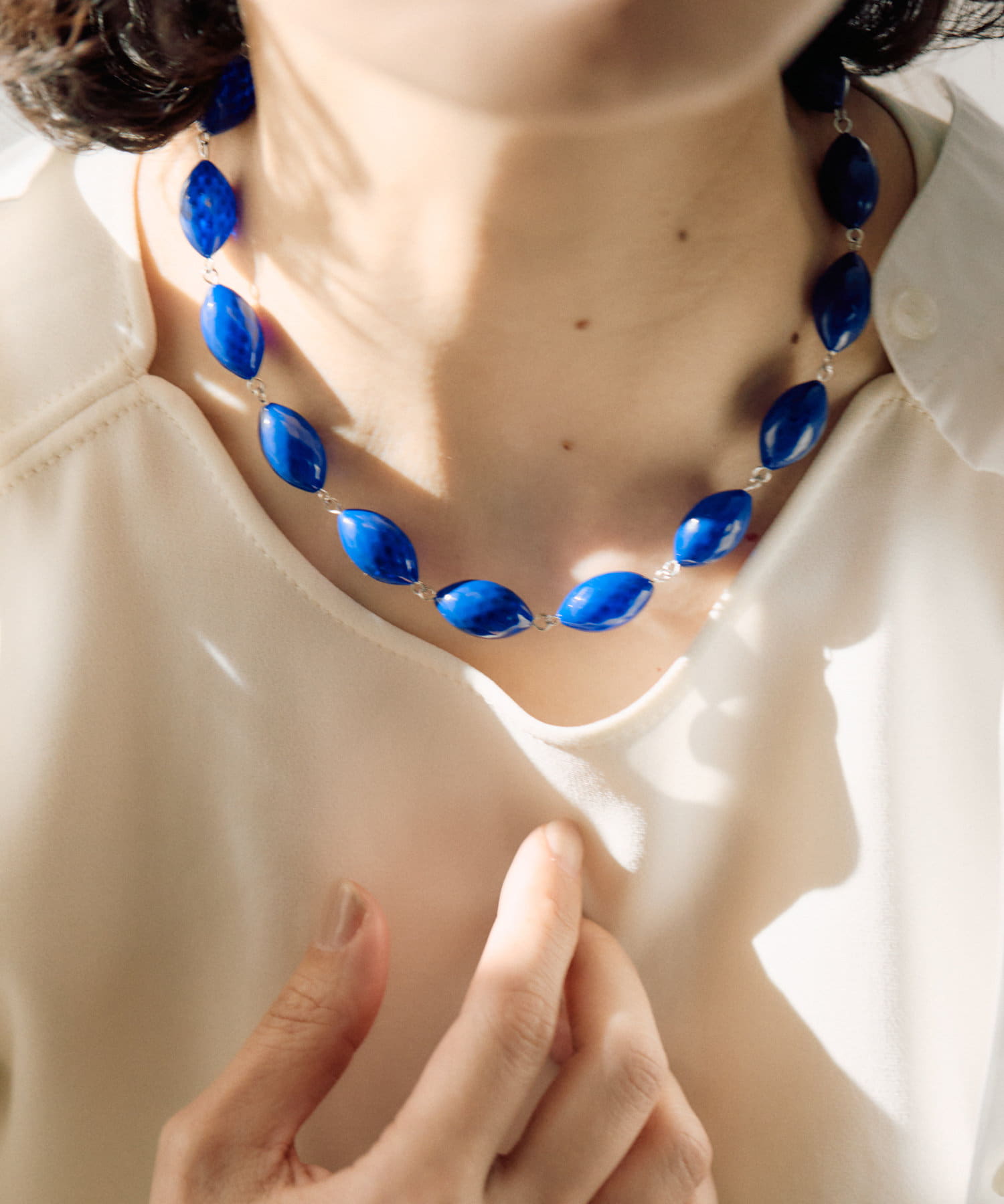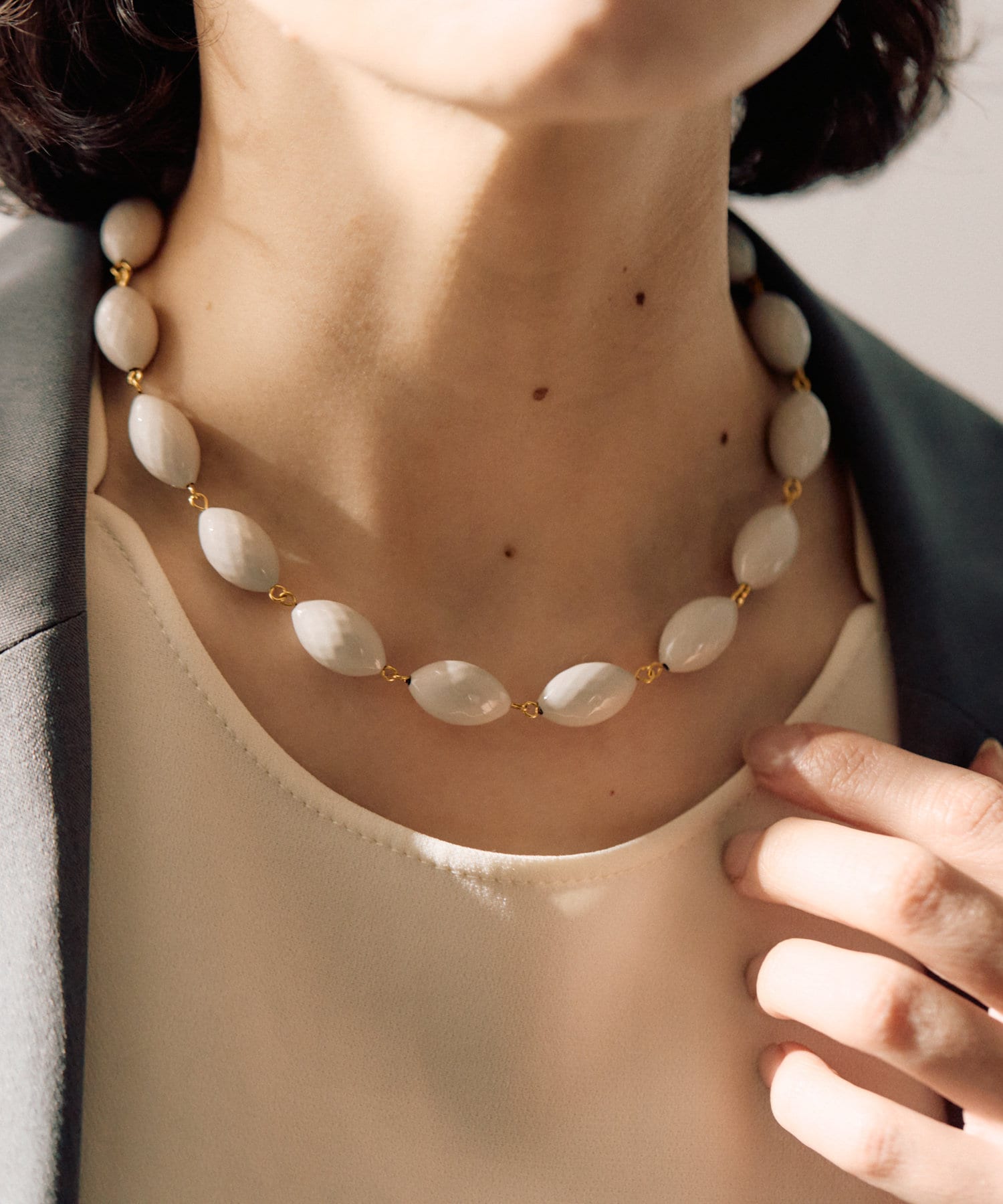 ころんとしたナツメ型のパーツが連なり、首元に程よいボリューム感をプラスします。