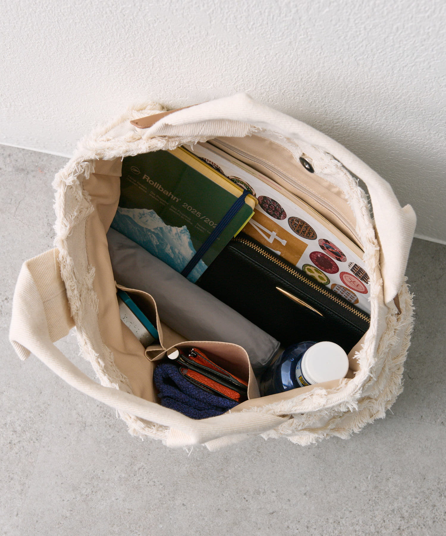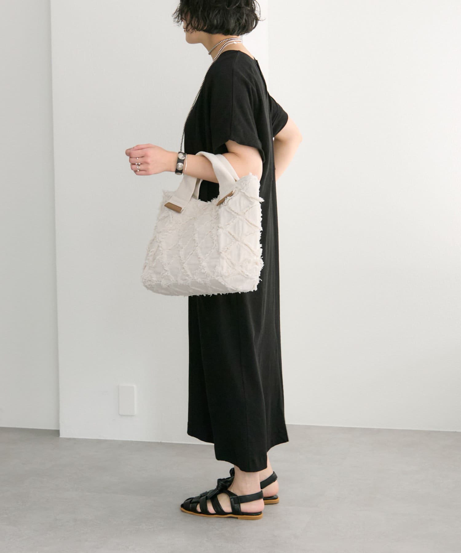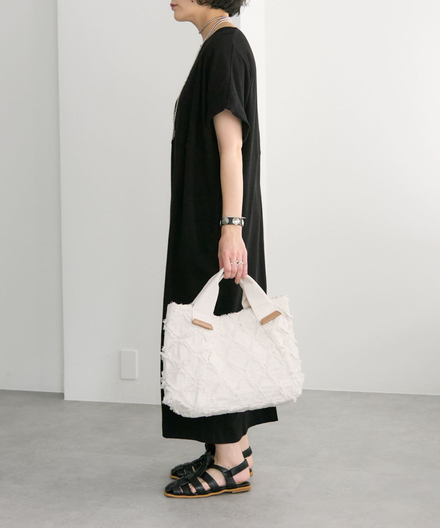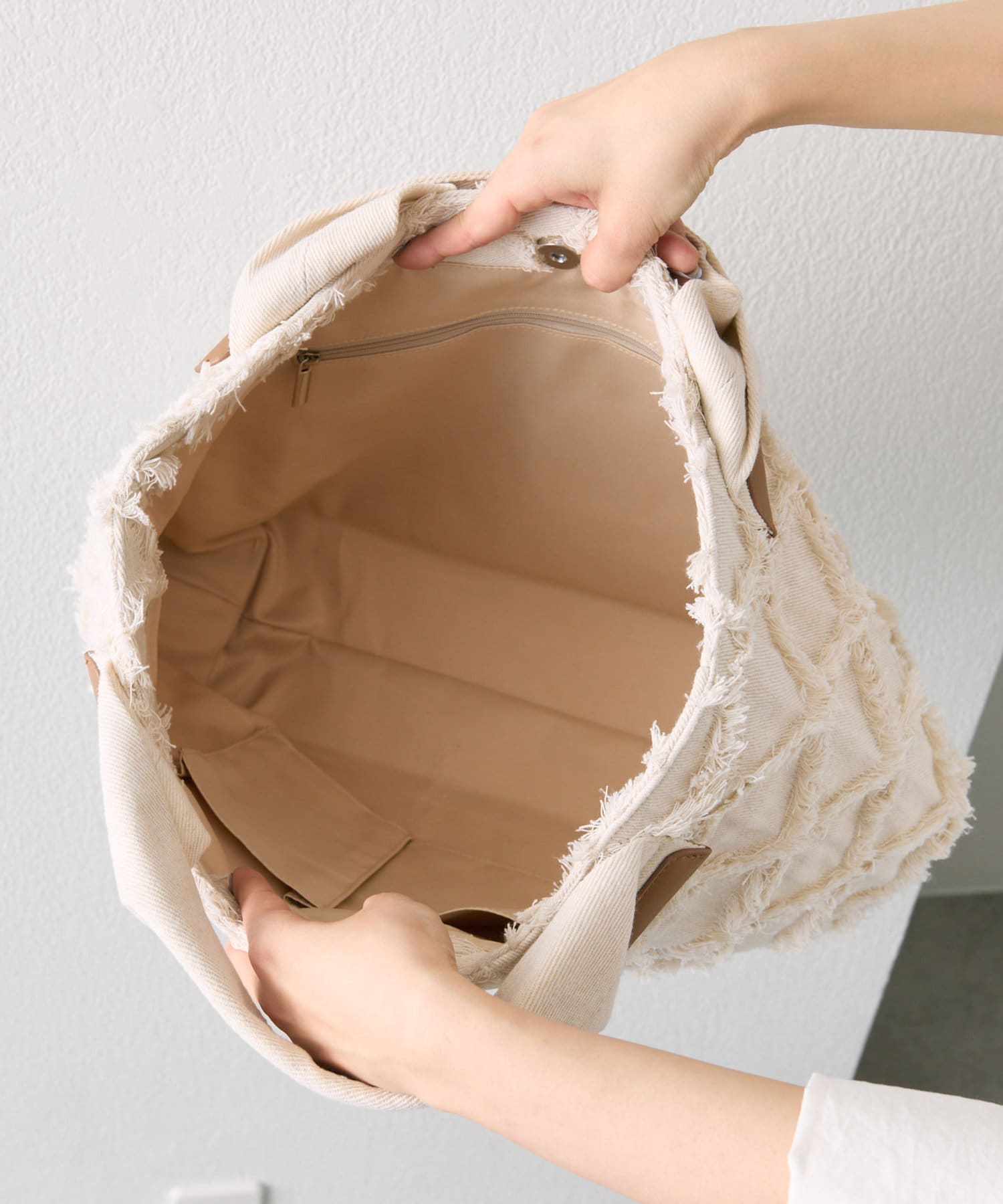 予めご了承ください。また、切りっぱなし部分と本体の縫製部分で止まるためそれ以上はほつれてはきません。