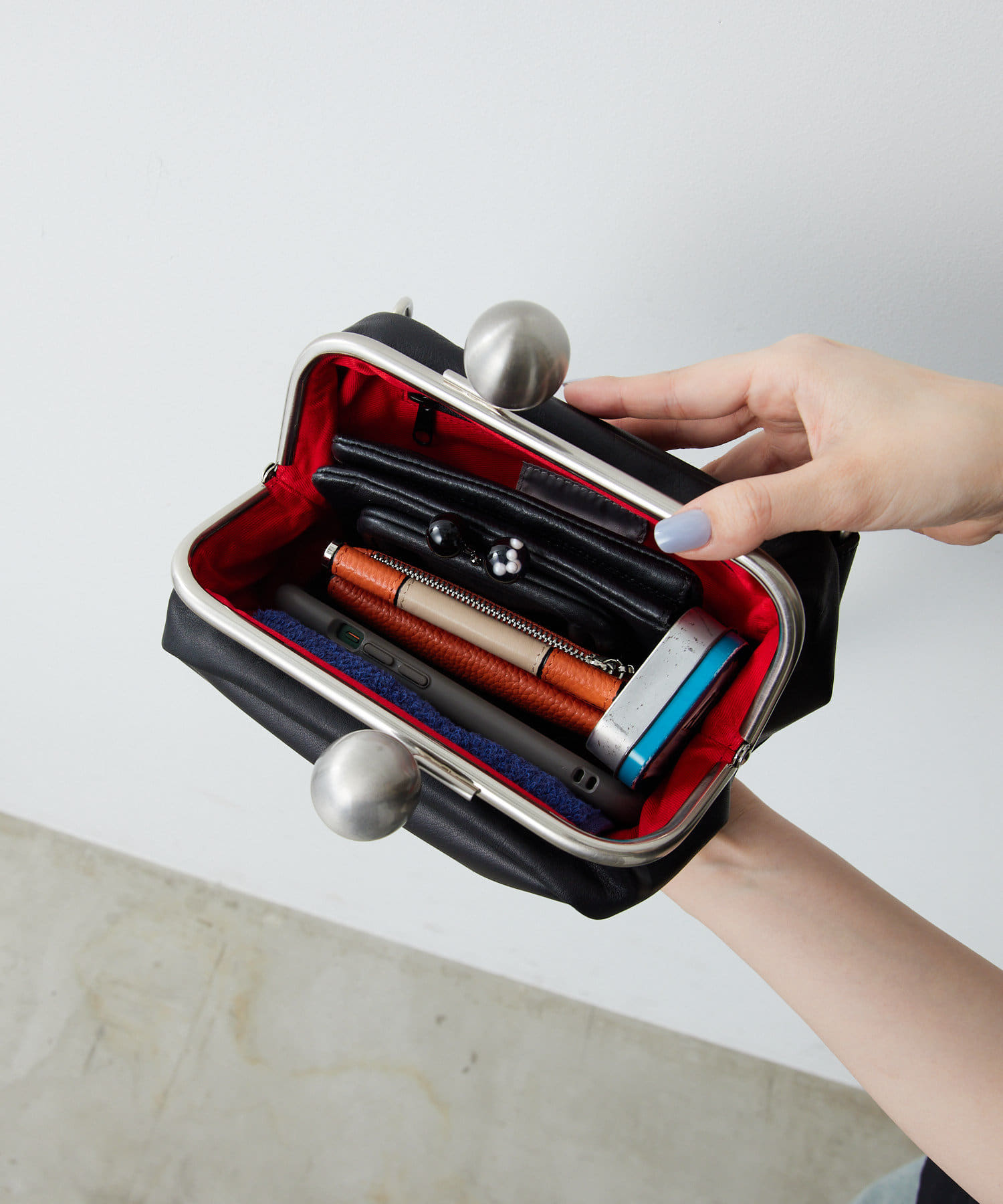 大きな口金は見た目のインパクトだけではなく、パチンとしっかり開閉するため防犯面に優れ