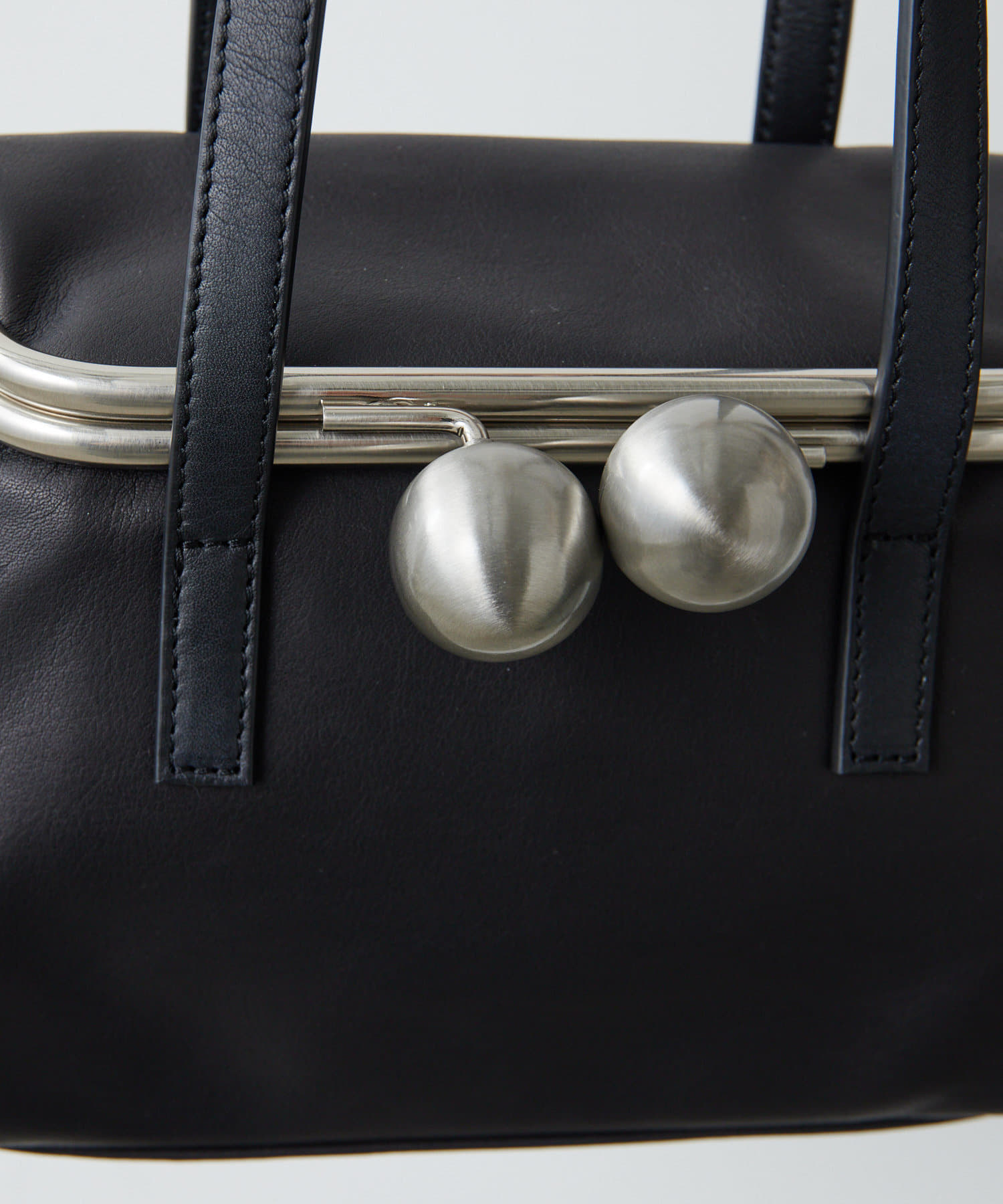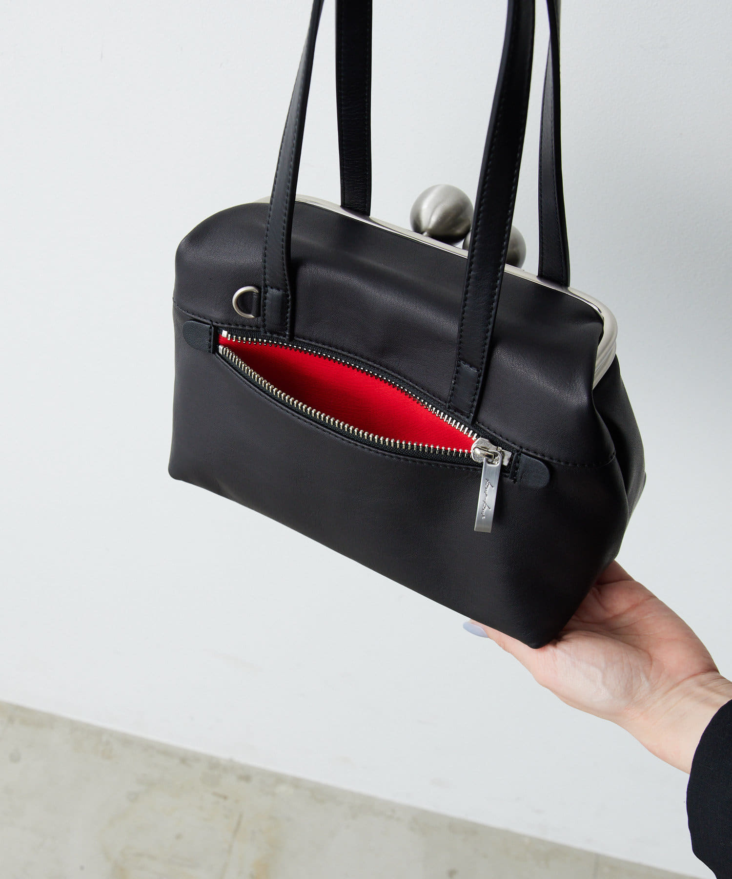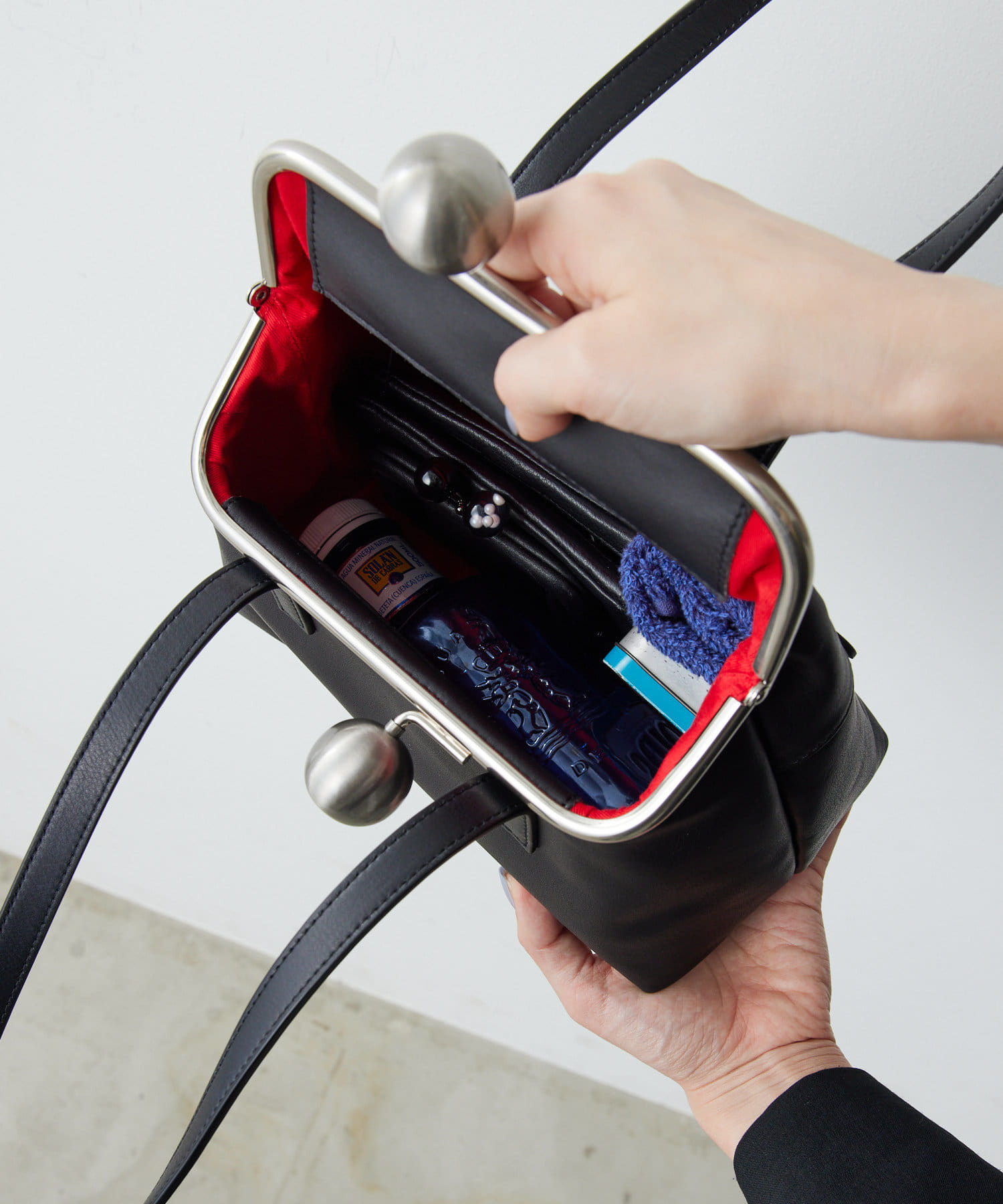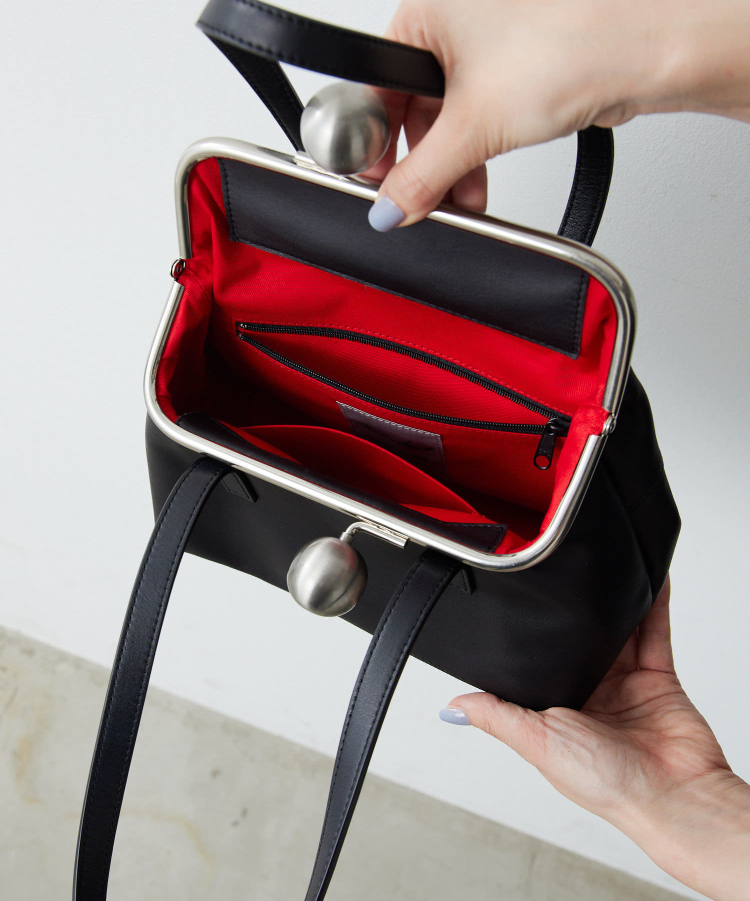 ハンドルは肩掛け可能で肩にかけたままでも開けやすいように口金の取付角度を前に傾斜させ実用性を考慮しています。