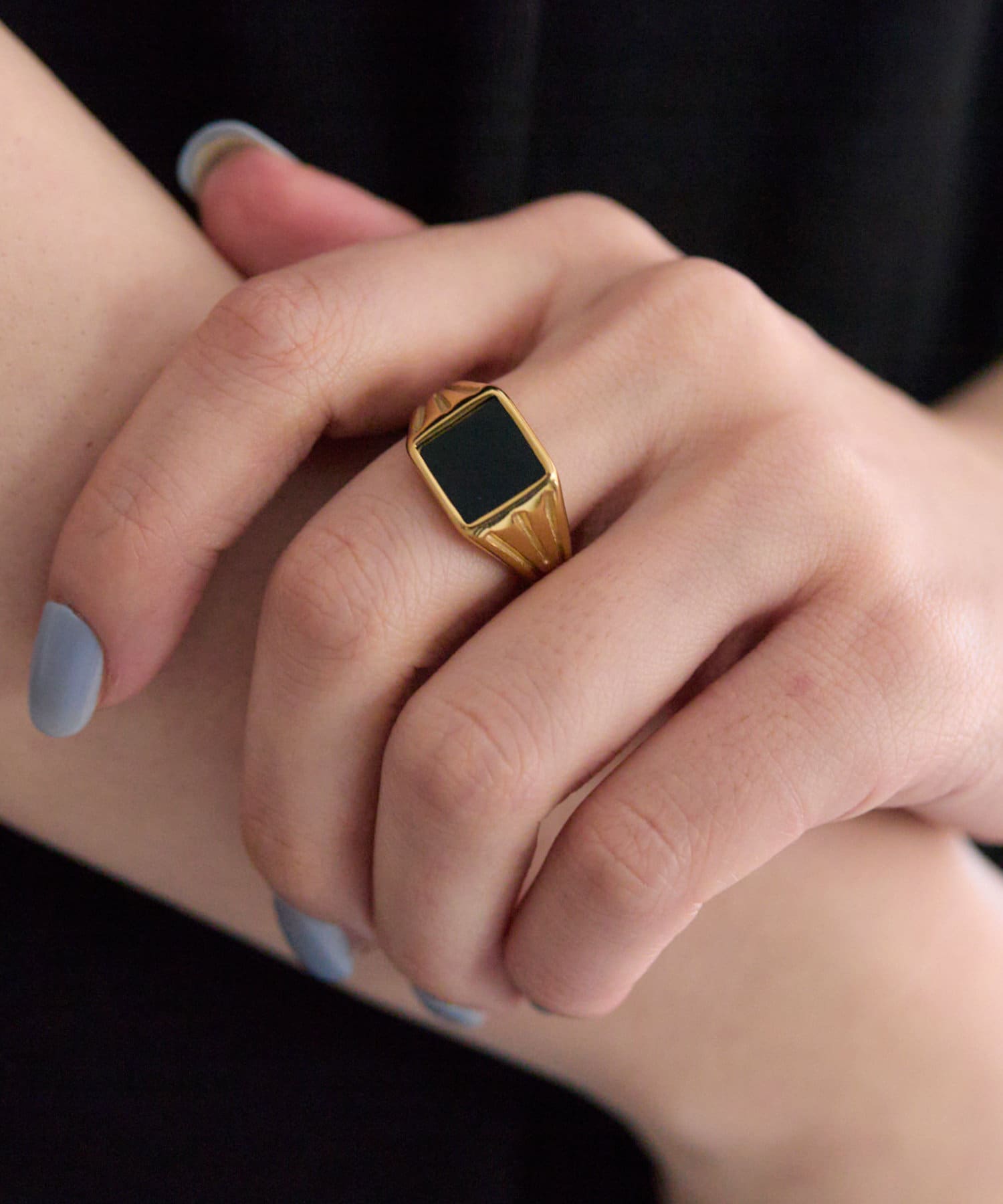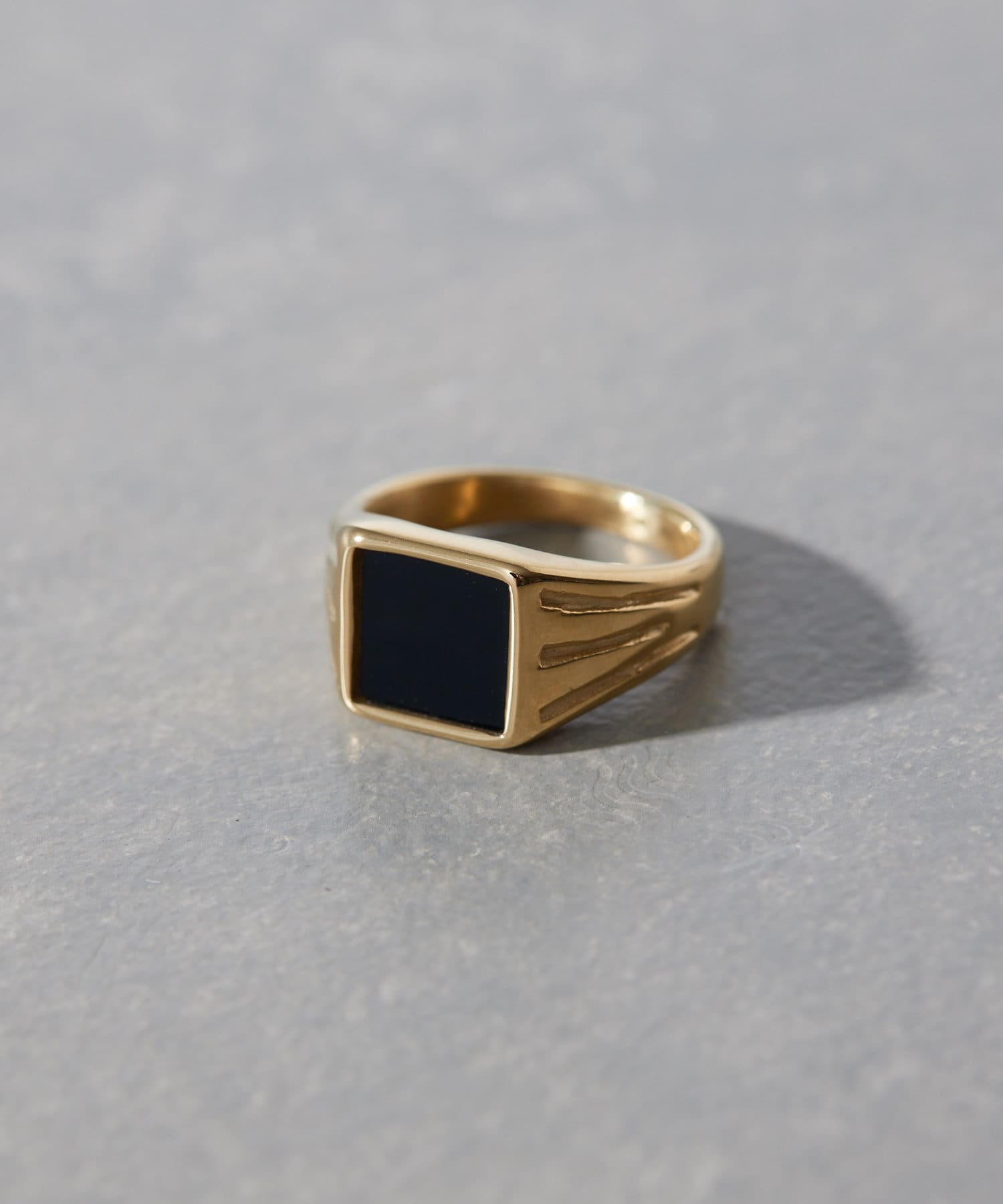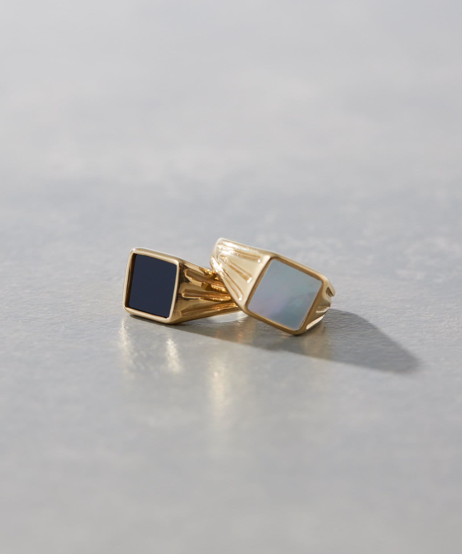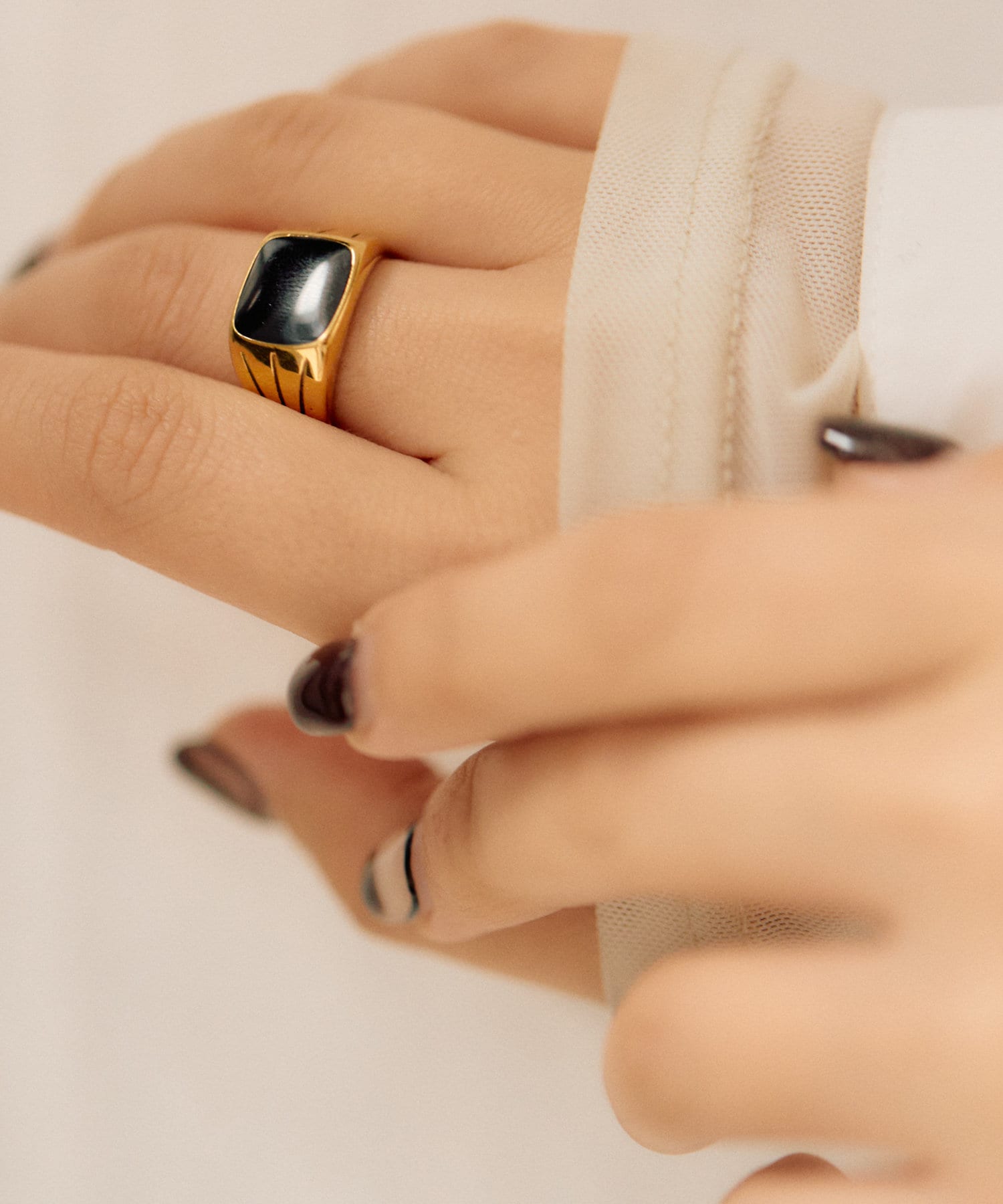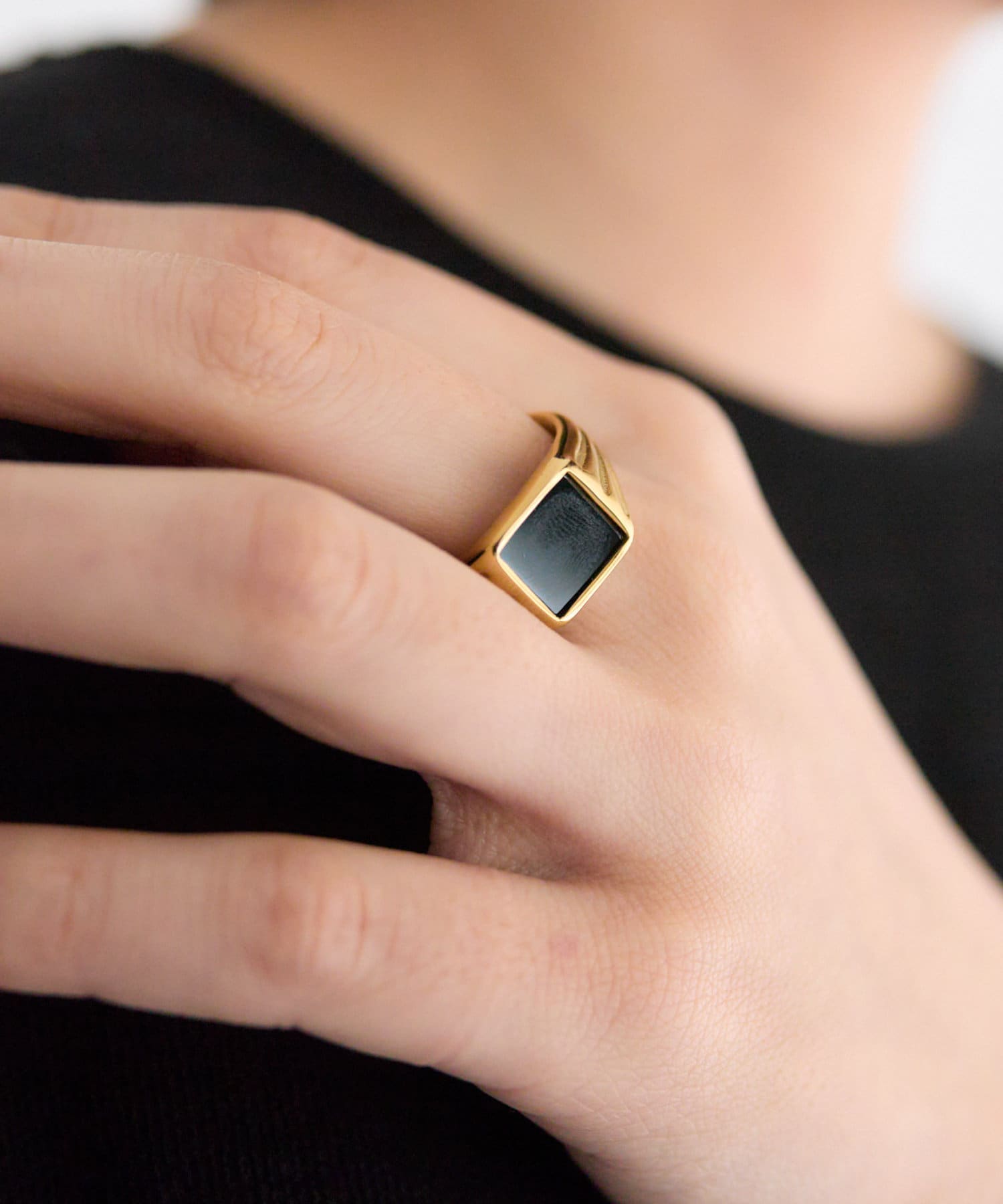 フロントのスクエア型カラープレートが目を惹く、シックでモダンなリング。