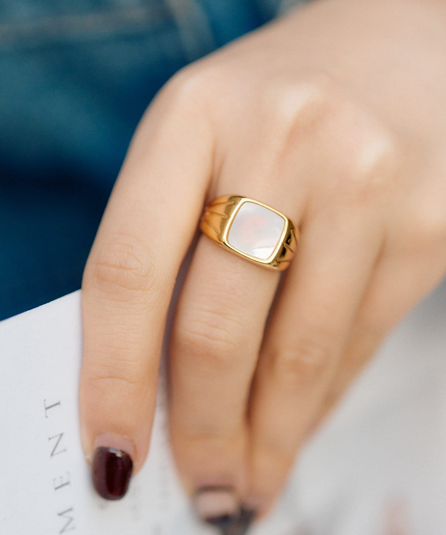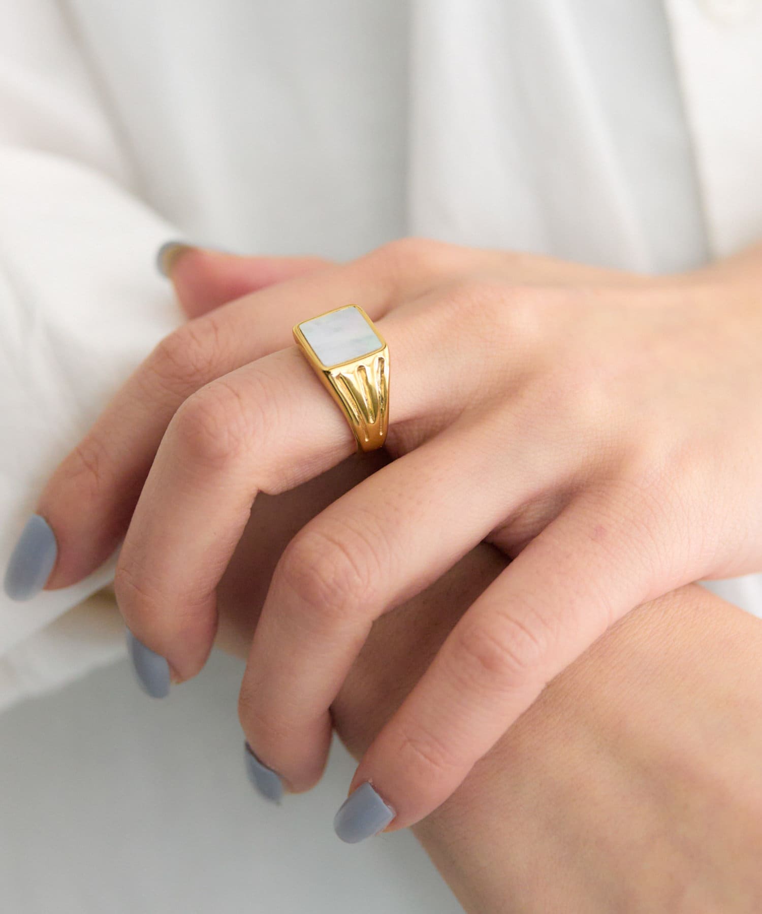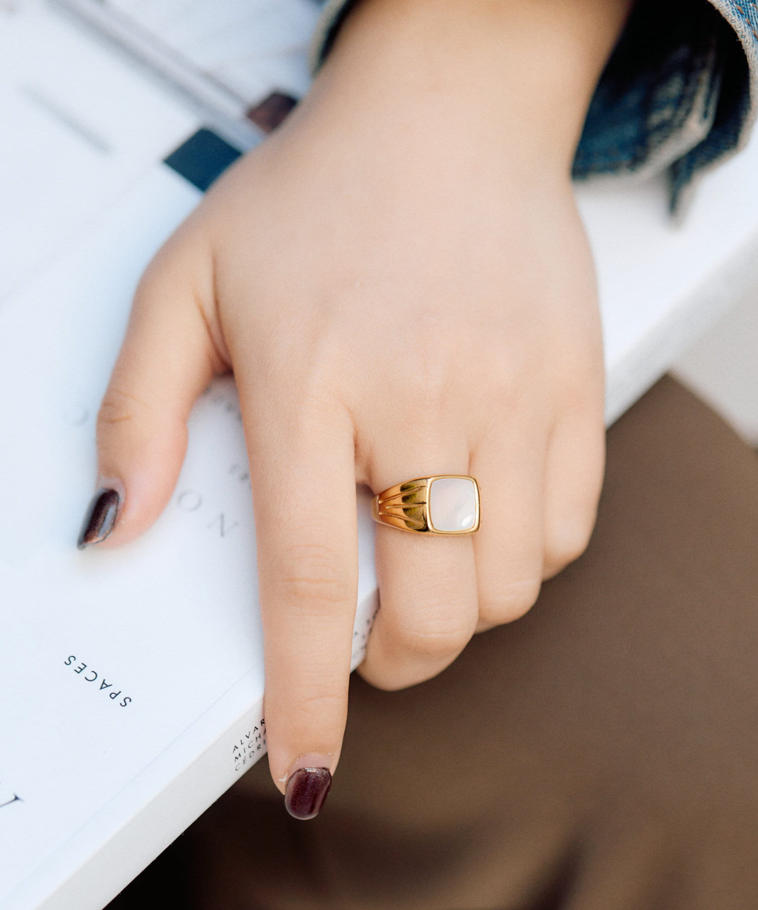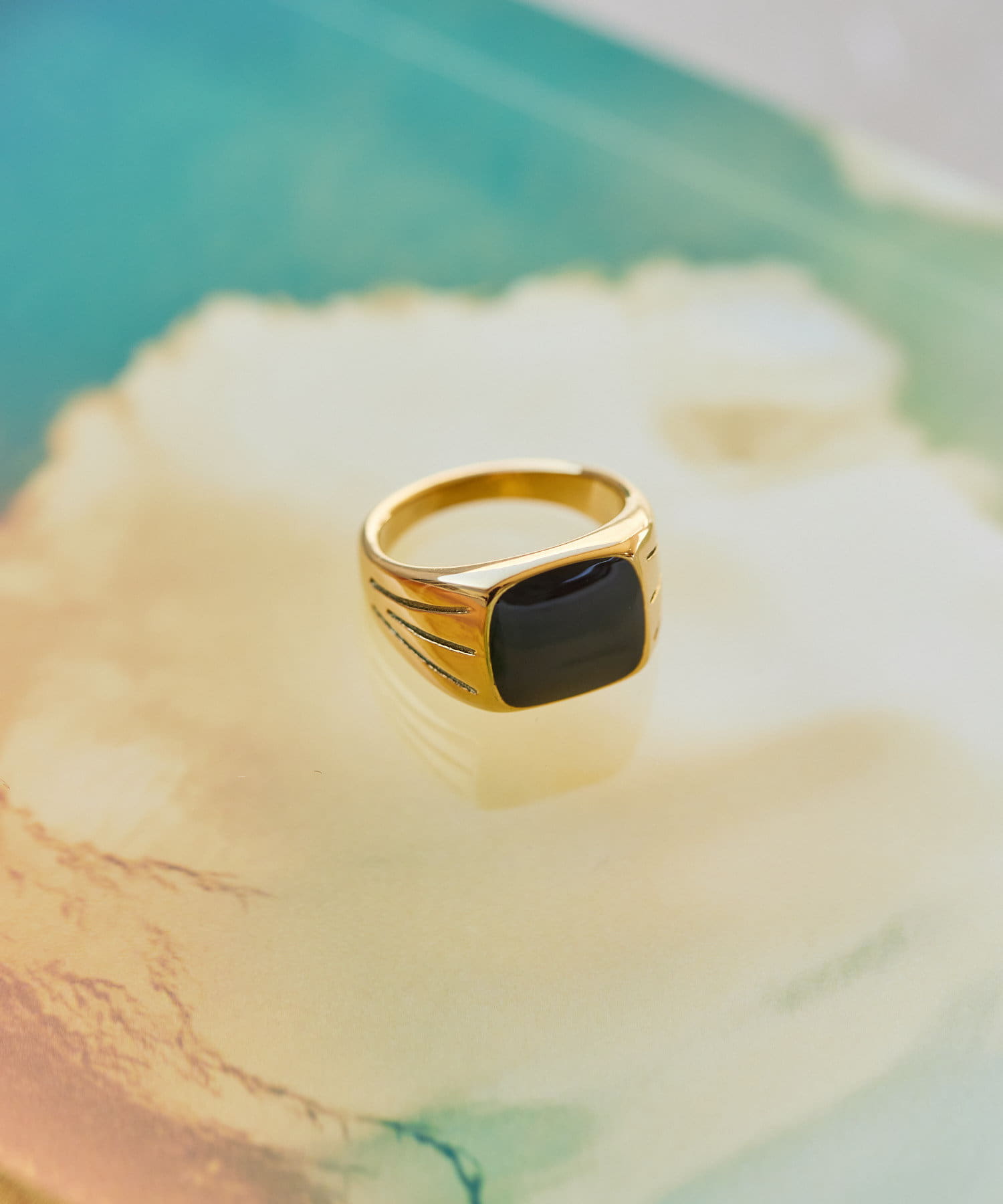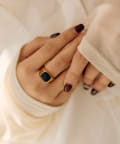 フロントのスクエア型カラープレートが目を惹く、シックでモダンなリング。