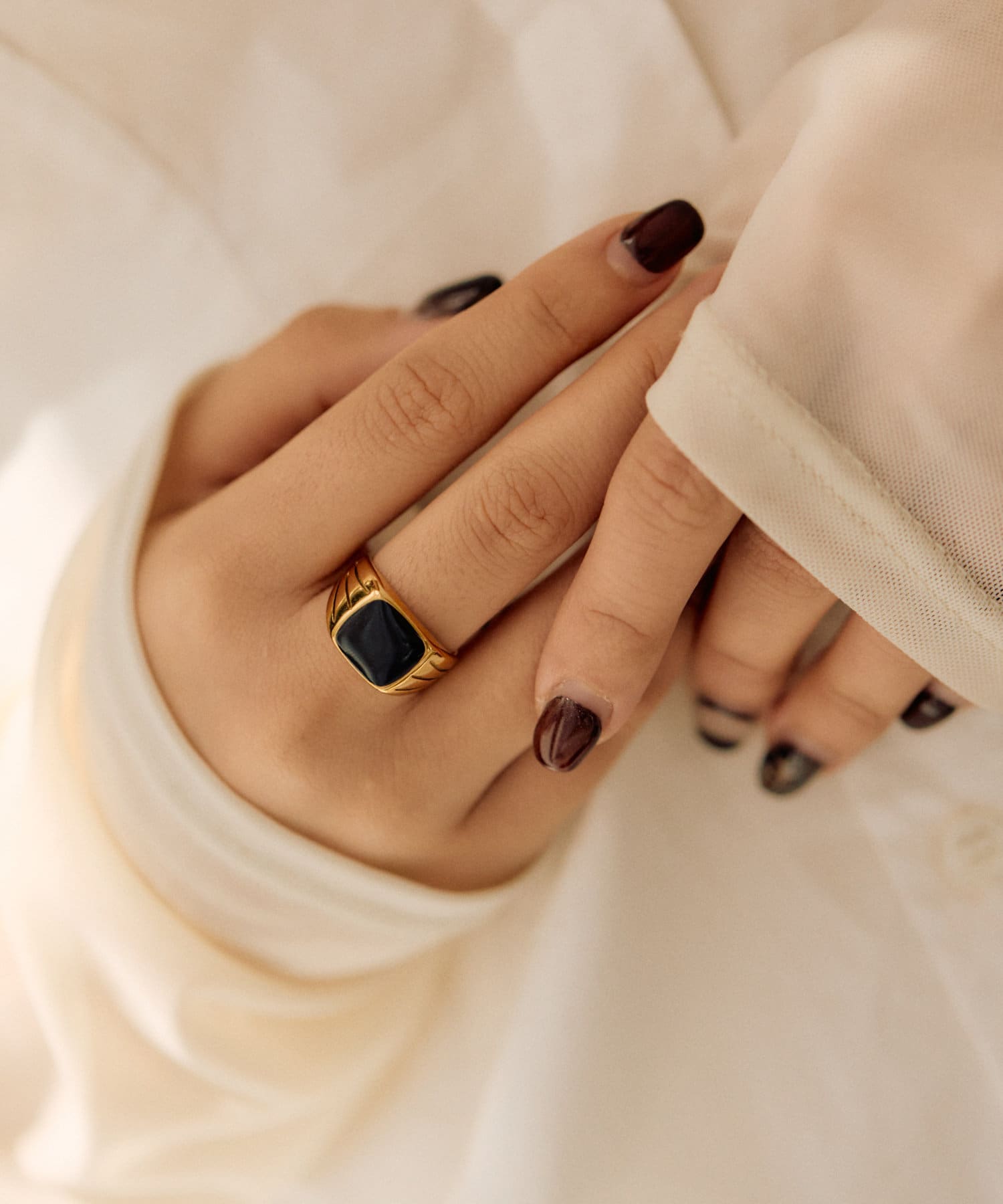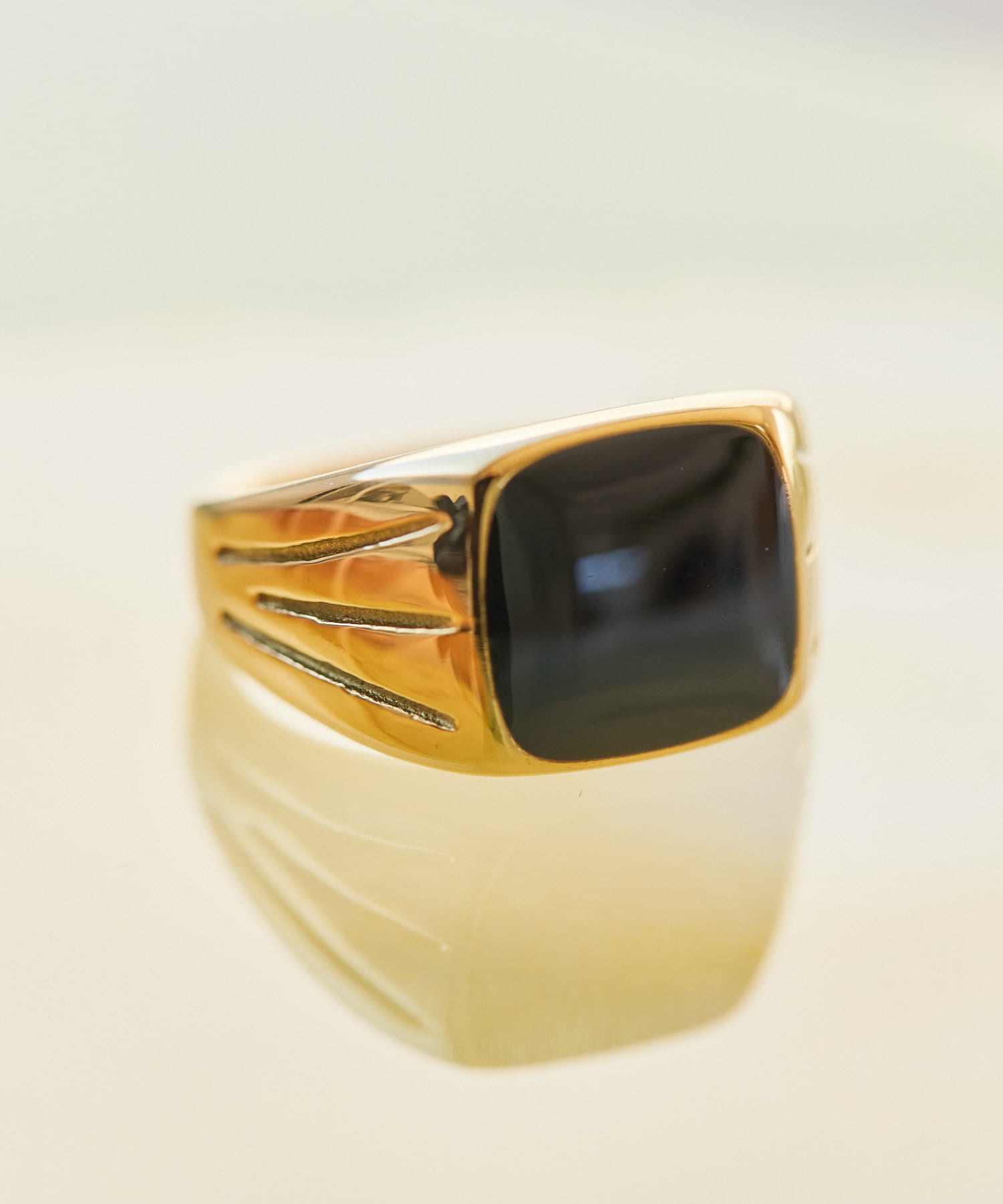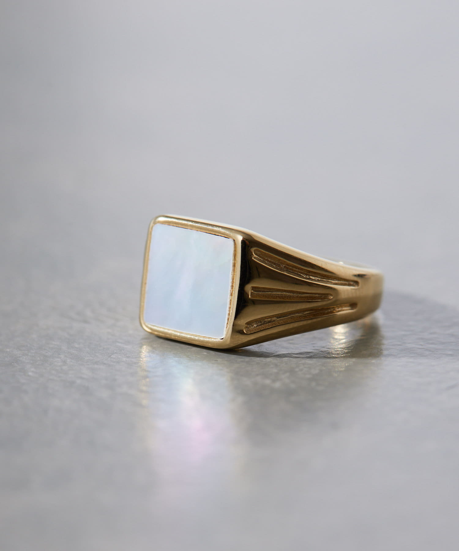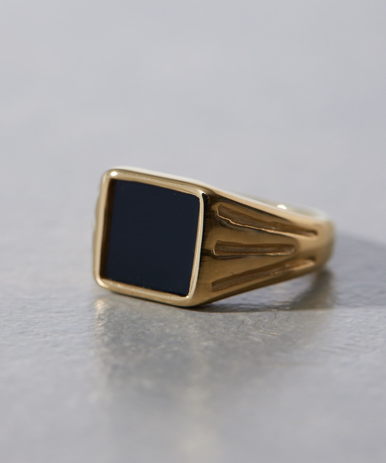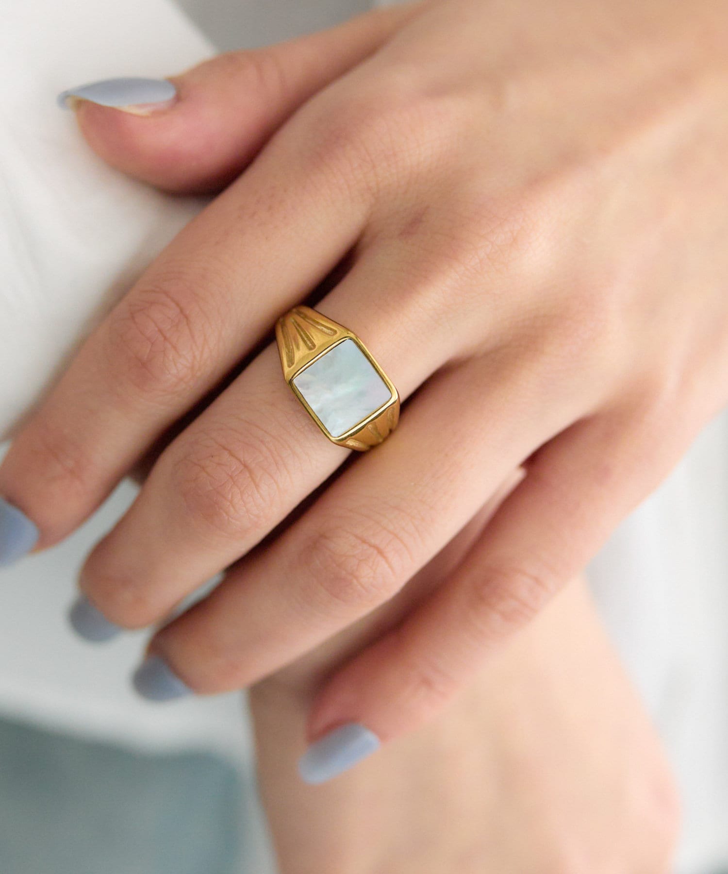 フロントのスクエア型カラープレートが目を惹く、シックでモダンなリング。
