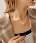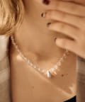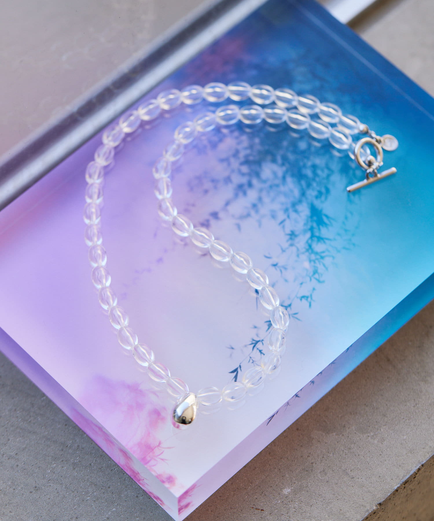 透明感あふれるクリアネックレスで首元に涼しげなアクセントを。