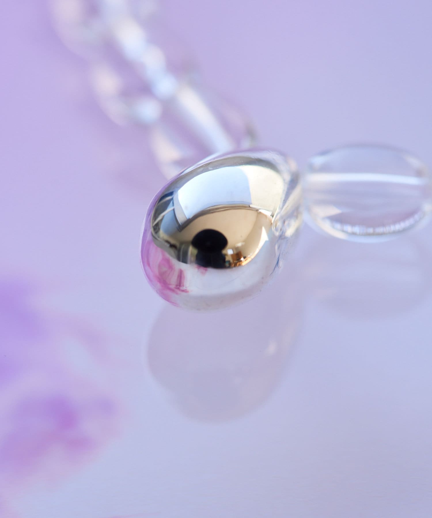 ・クリアのアクリル樹脂を通した中にひと粒、シルバーの雫がポイントのネックレス