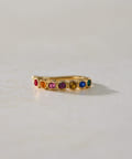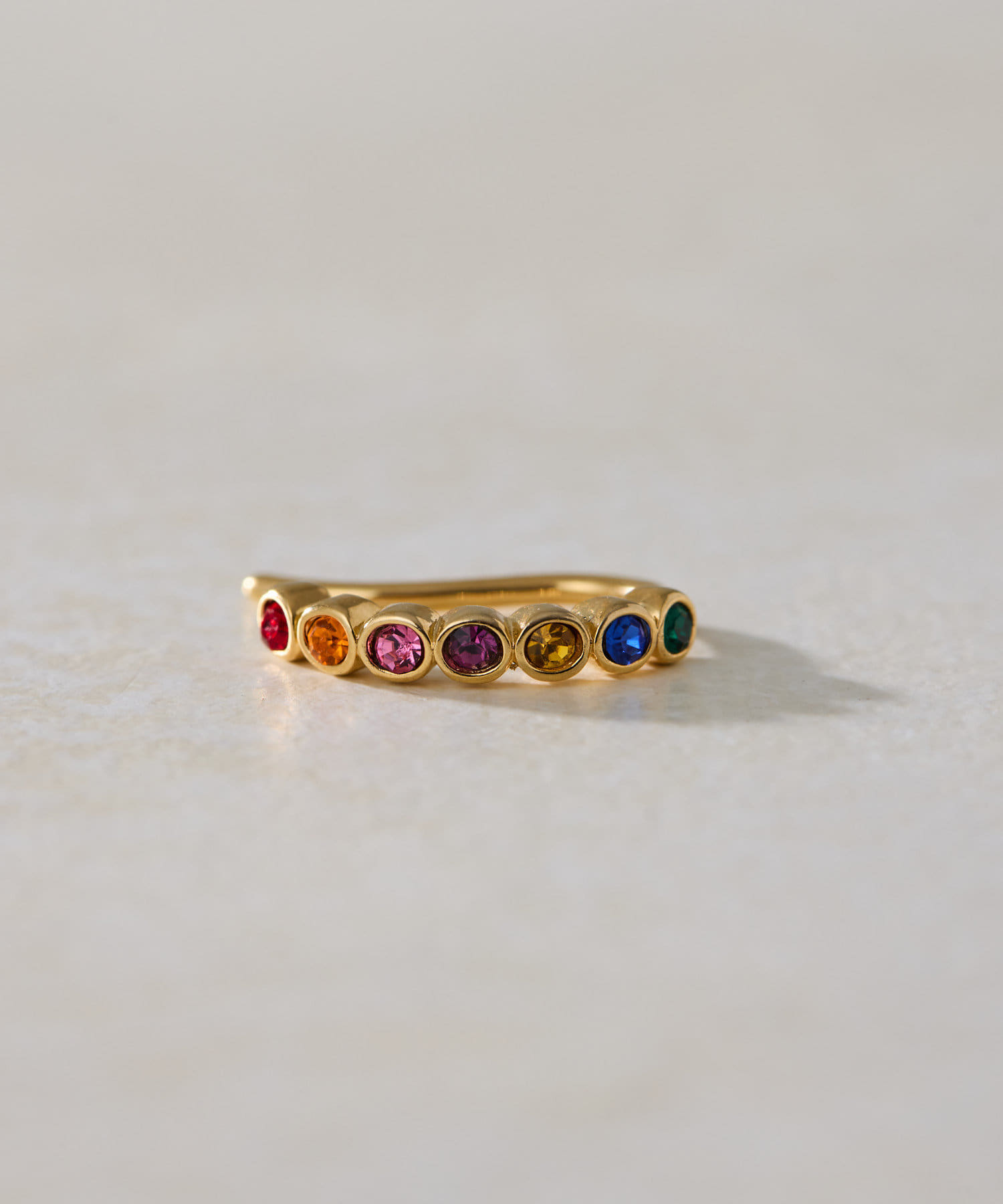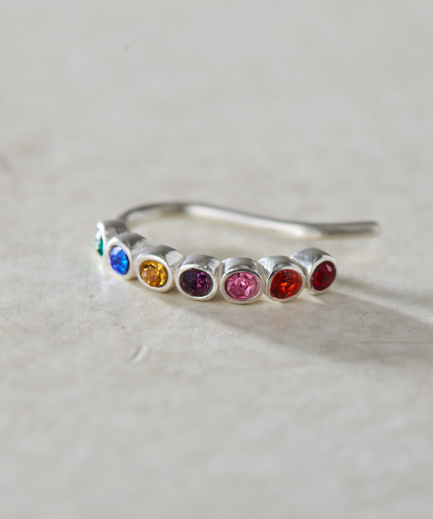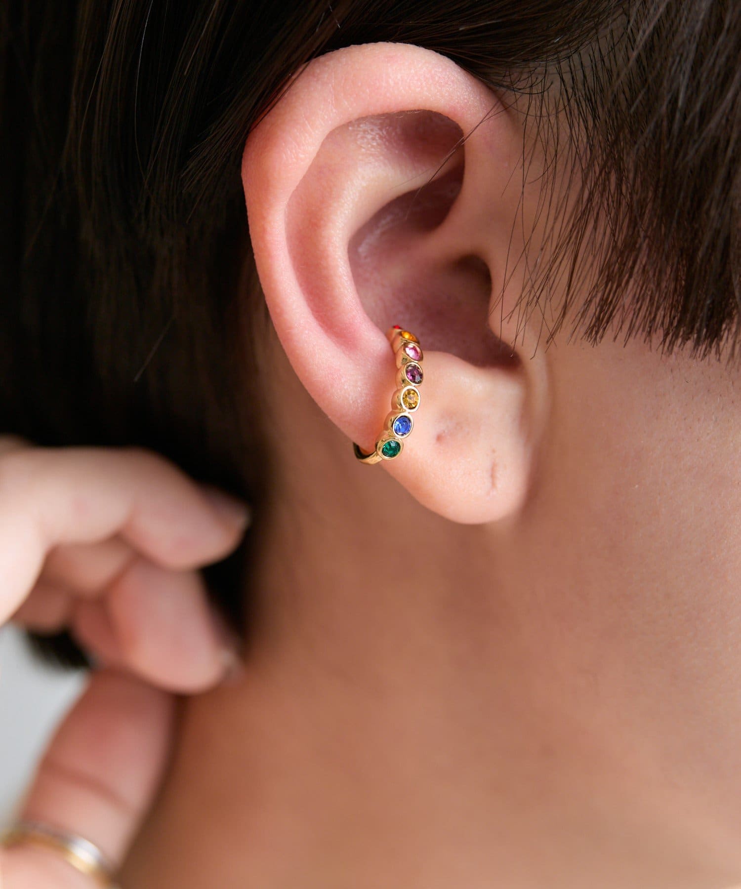 スターリングシルバーの上質な素材に、虹色に輝くカラフルなストーンが並んだイヤーカフ。