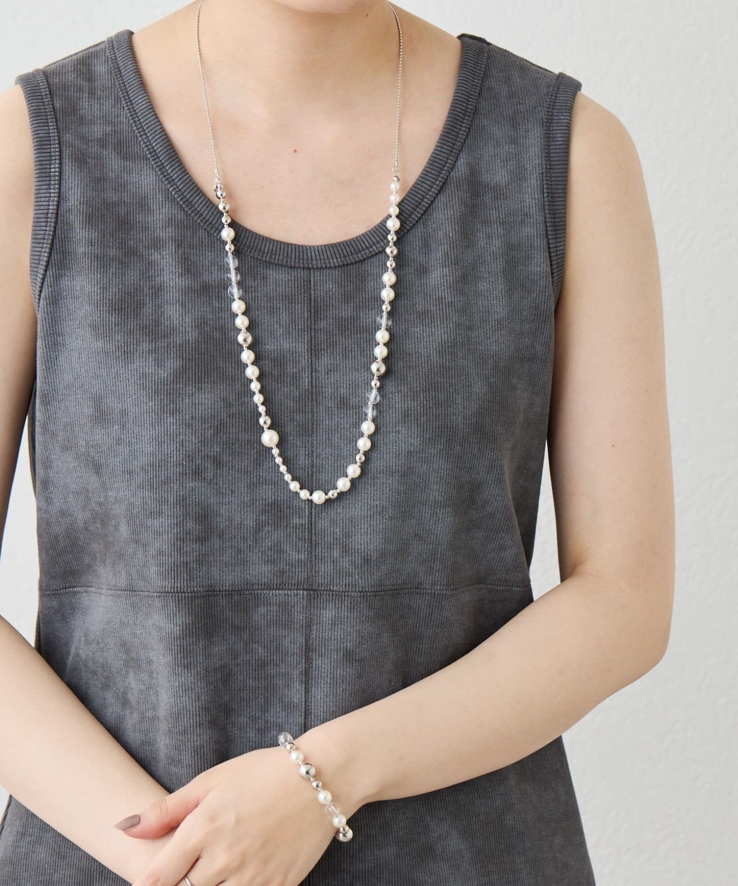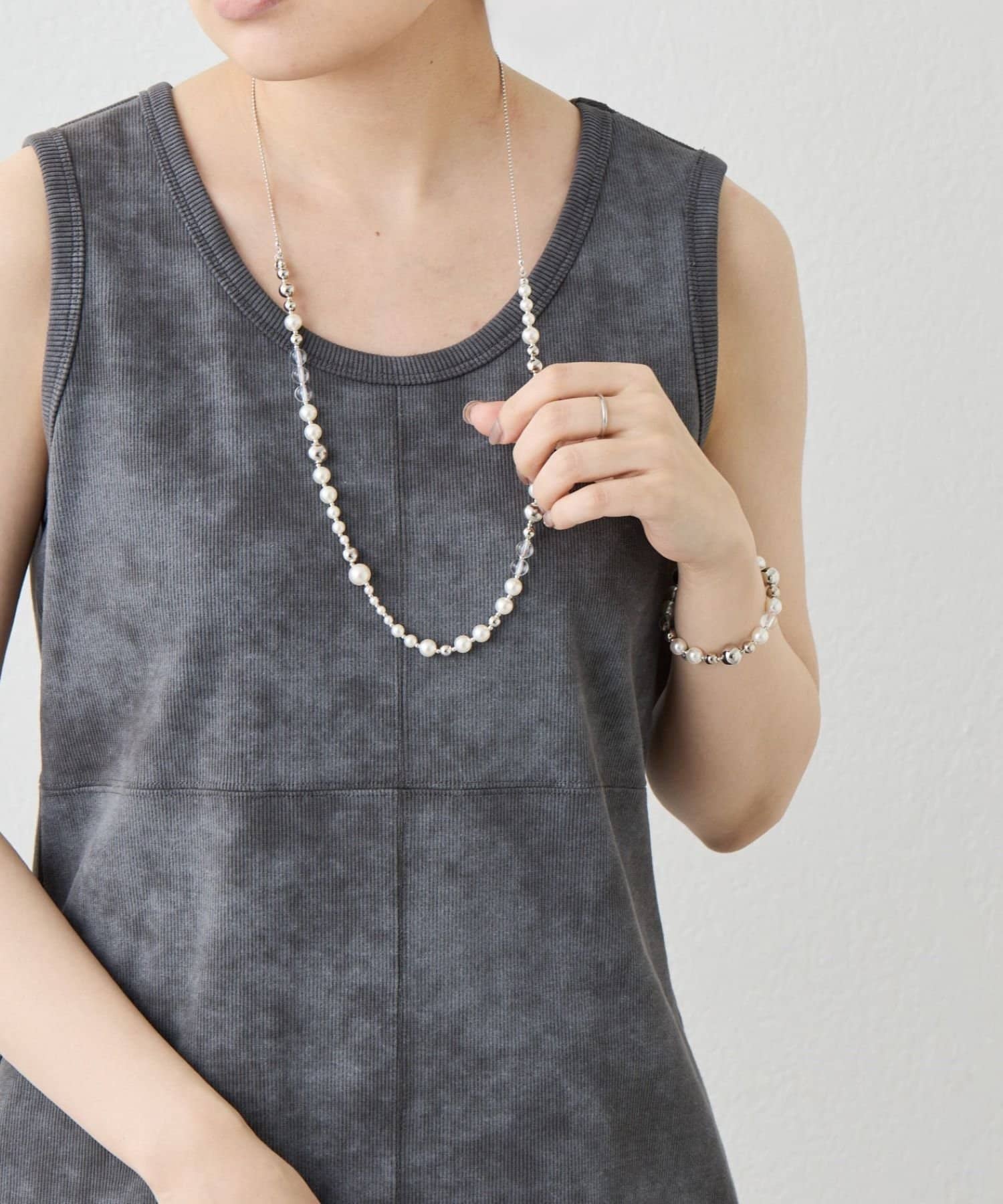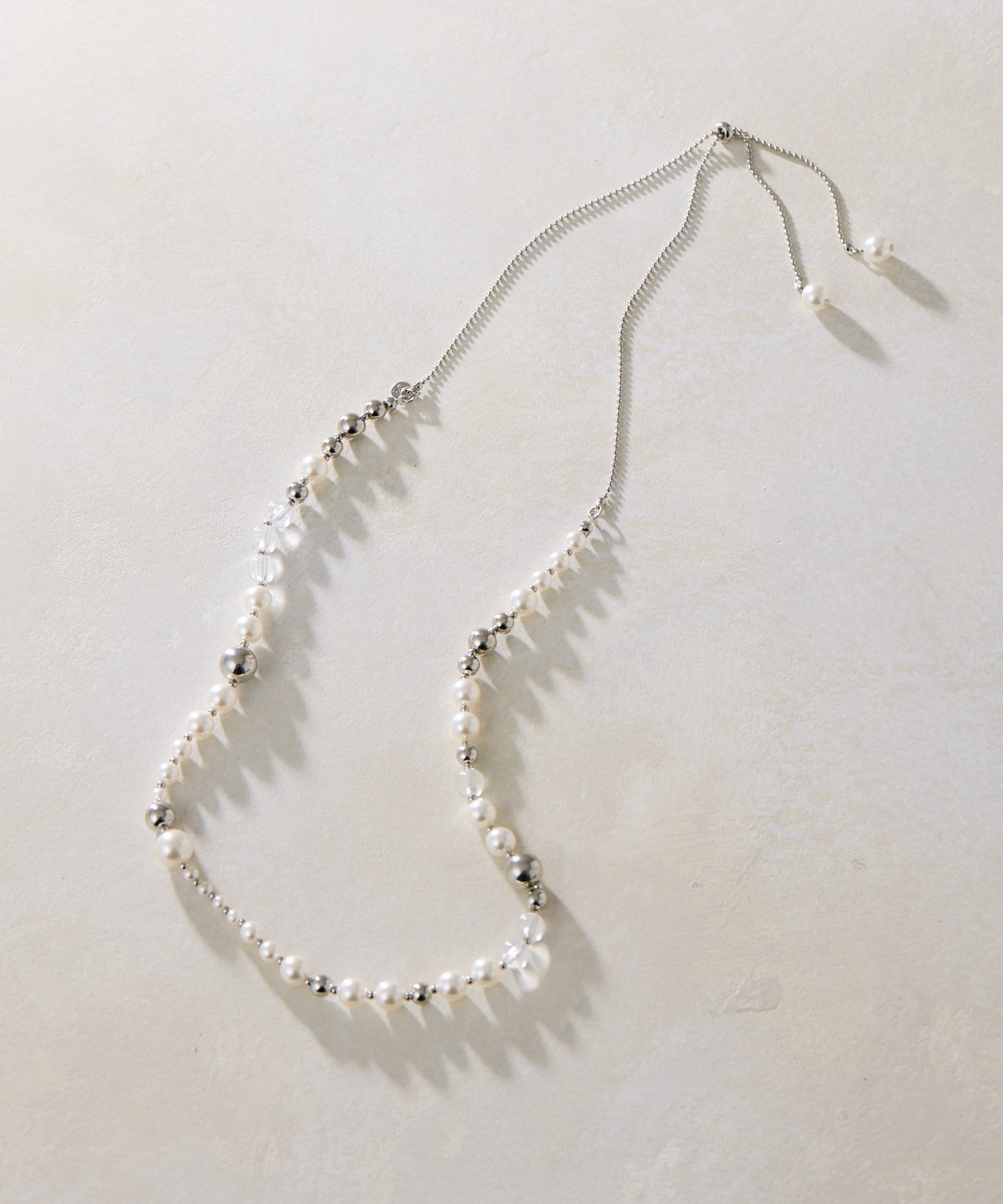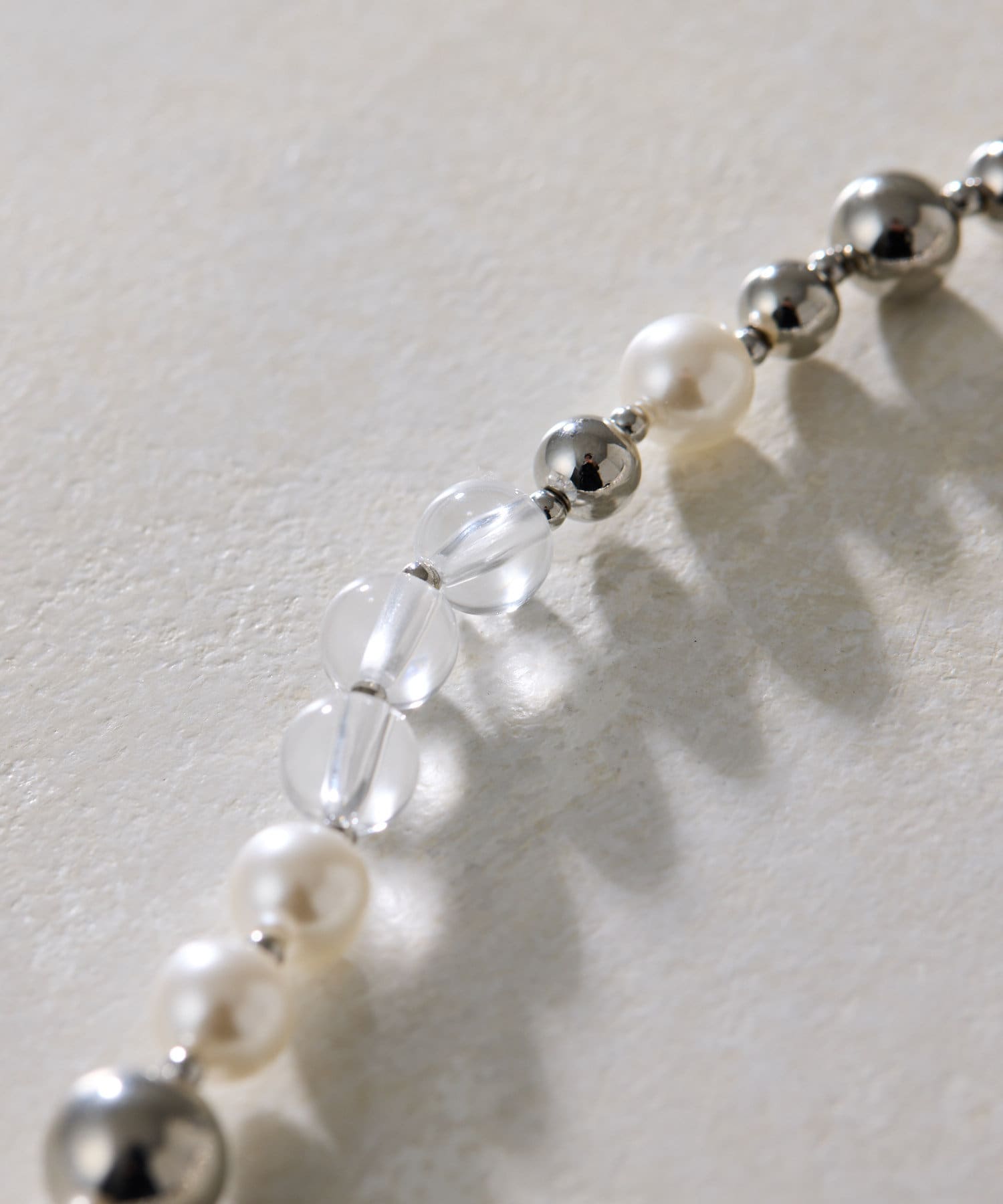 上品なパール、クリアボール、メタルボールをミックスした軽やかなネックレス。