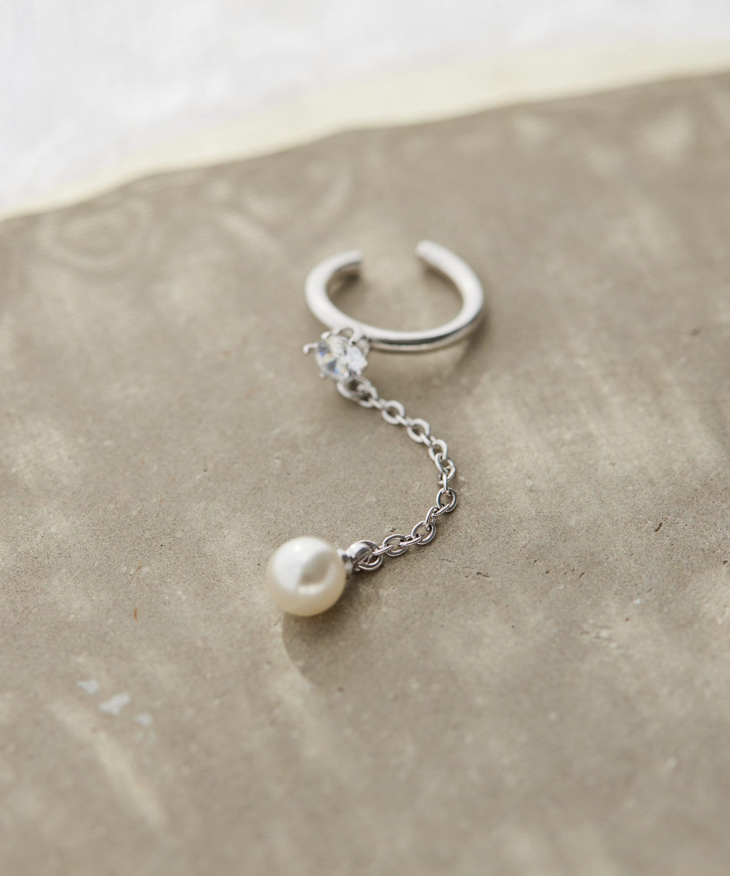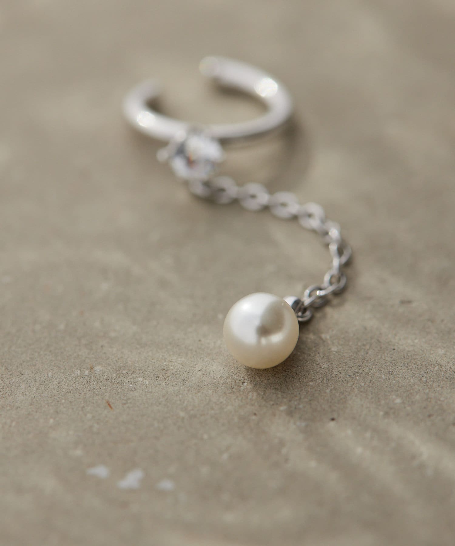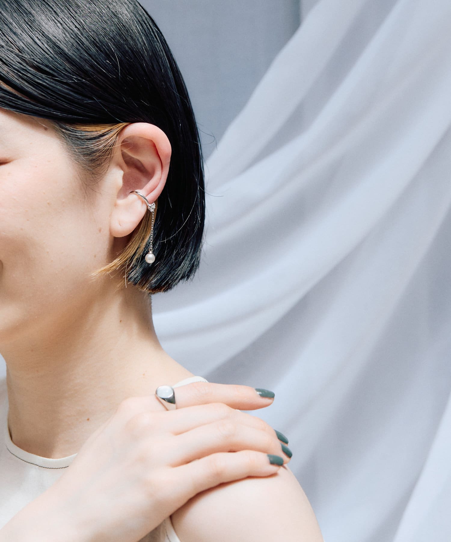 耳元で優雅に揺れる、ロングチェーンのパールイヤーカフ。
