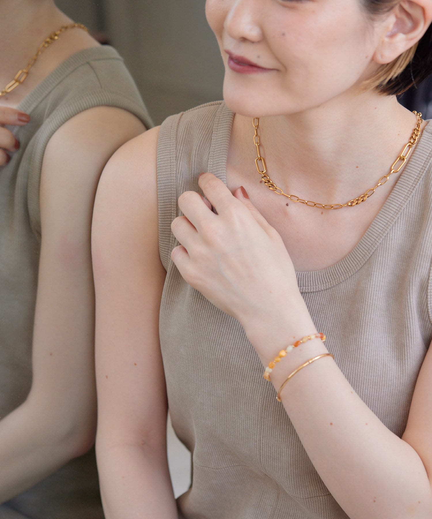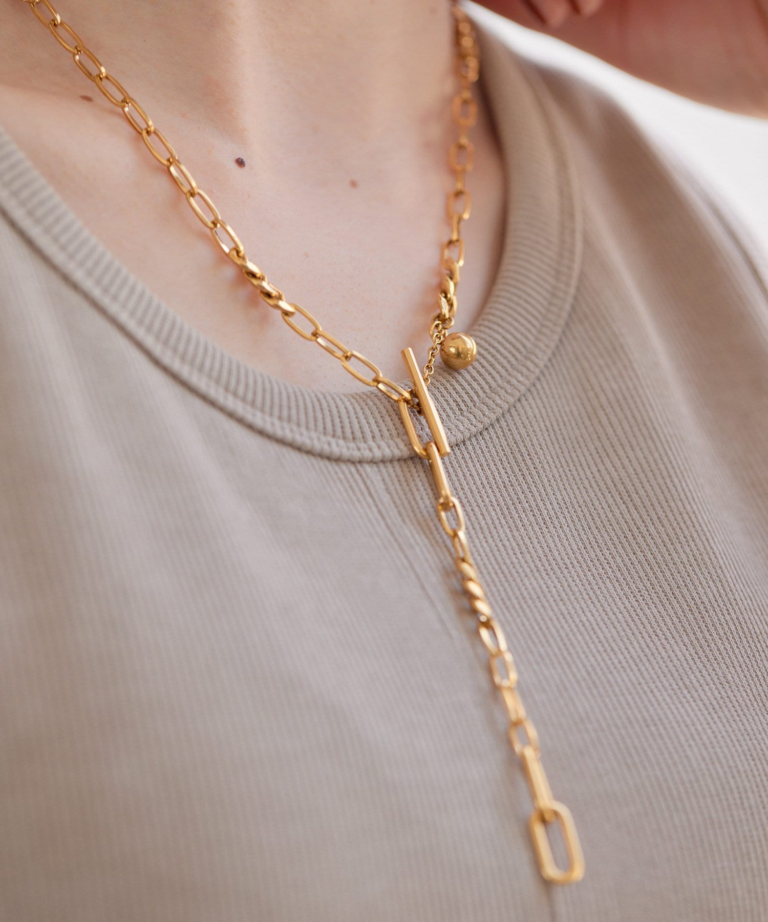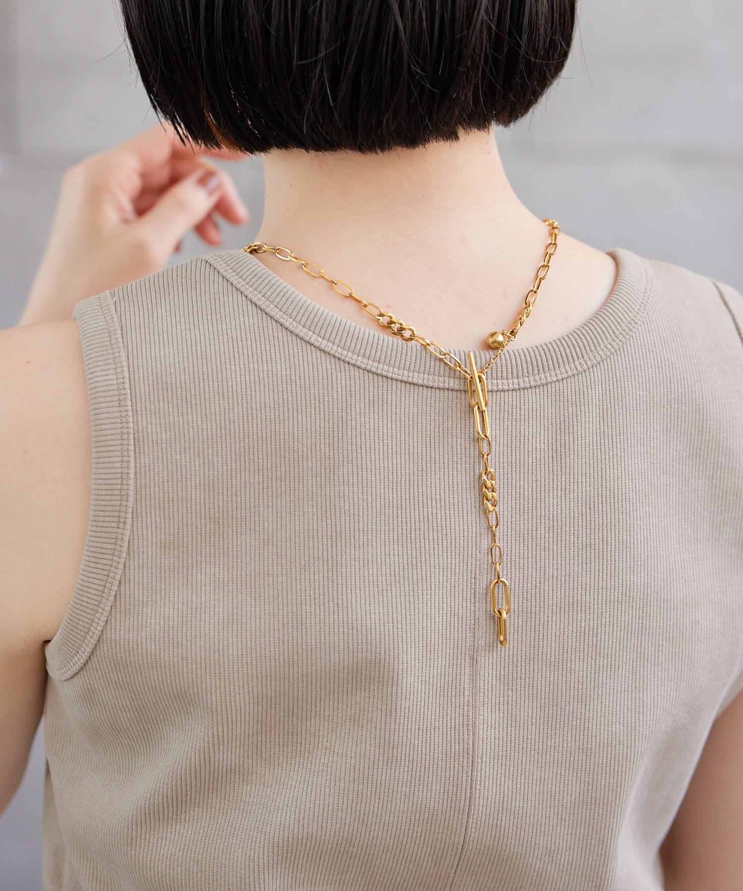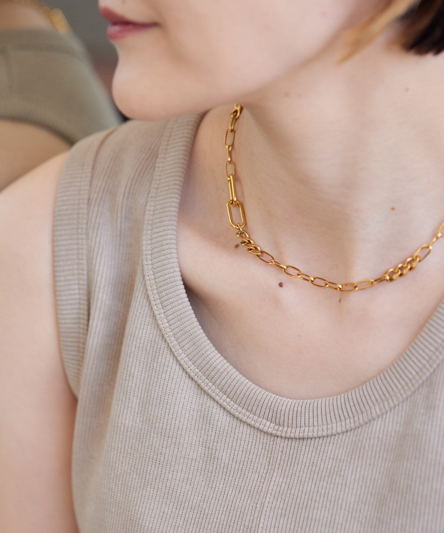 立体感のあるチェーンの表情が、胸元に奥行きを与え、洗練された印象に。