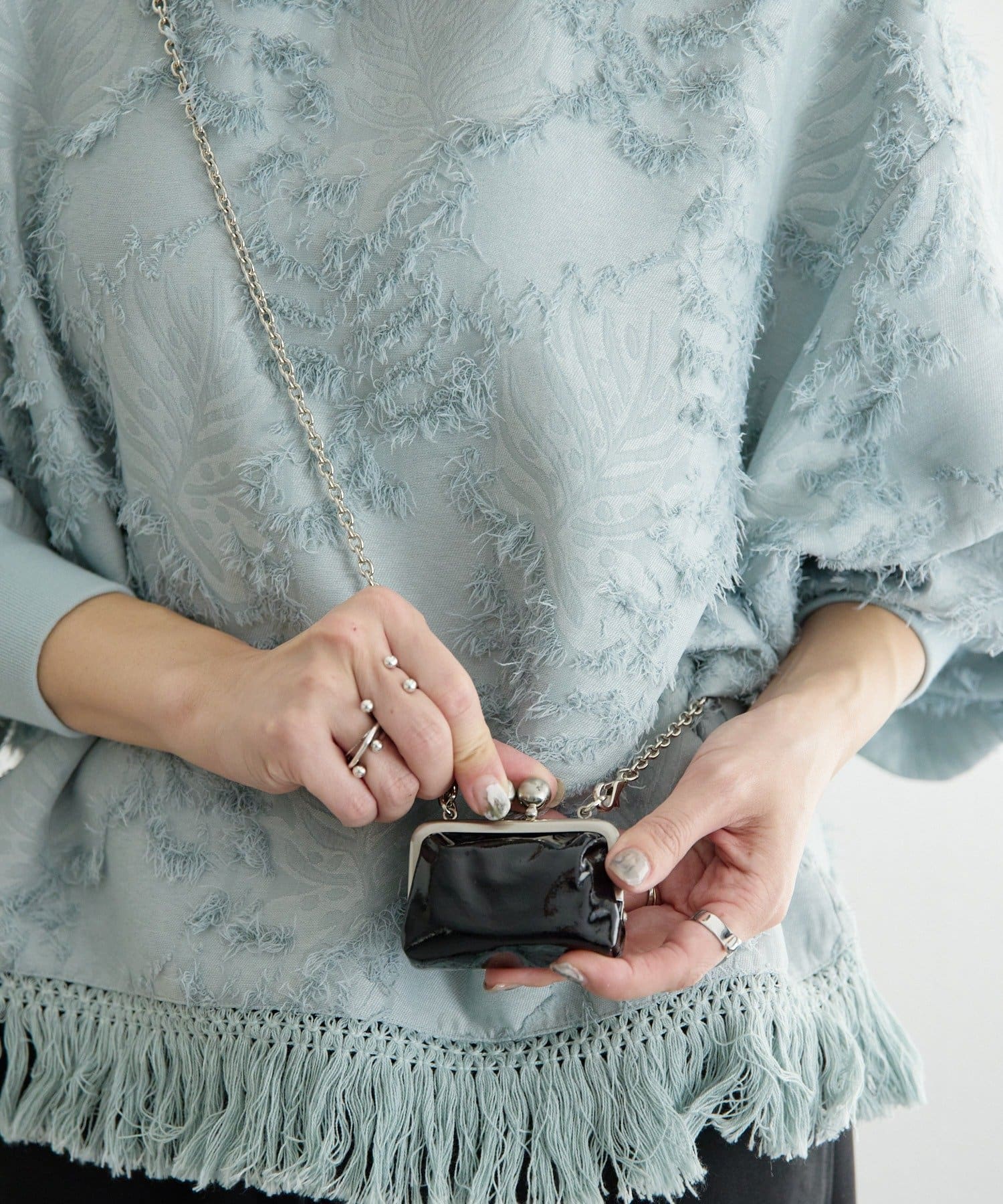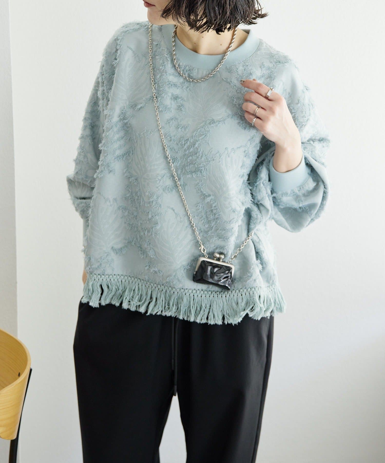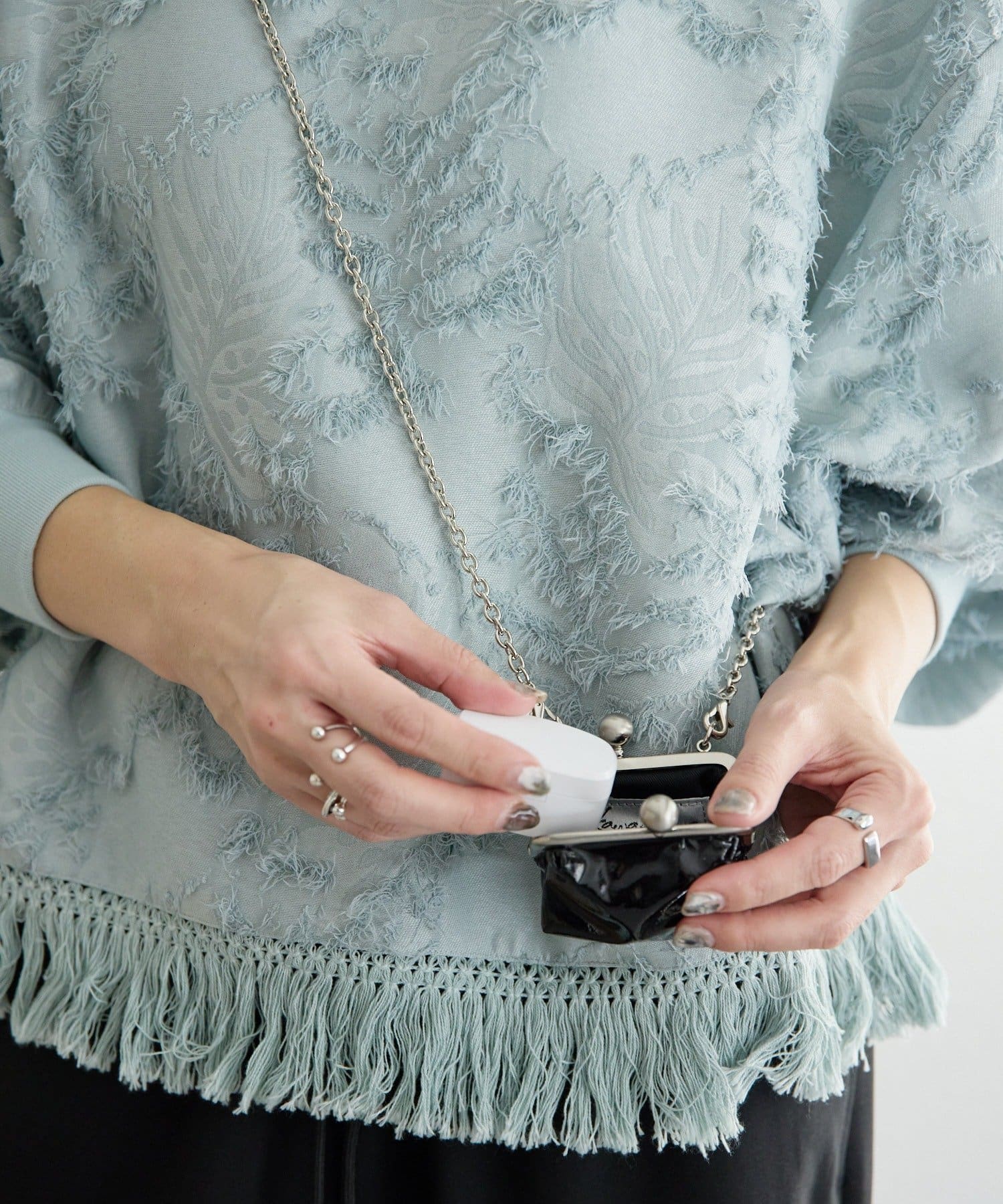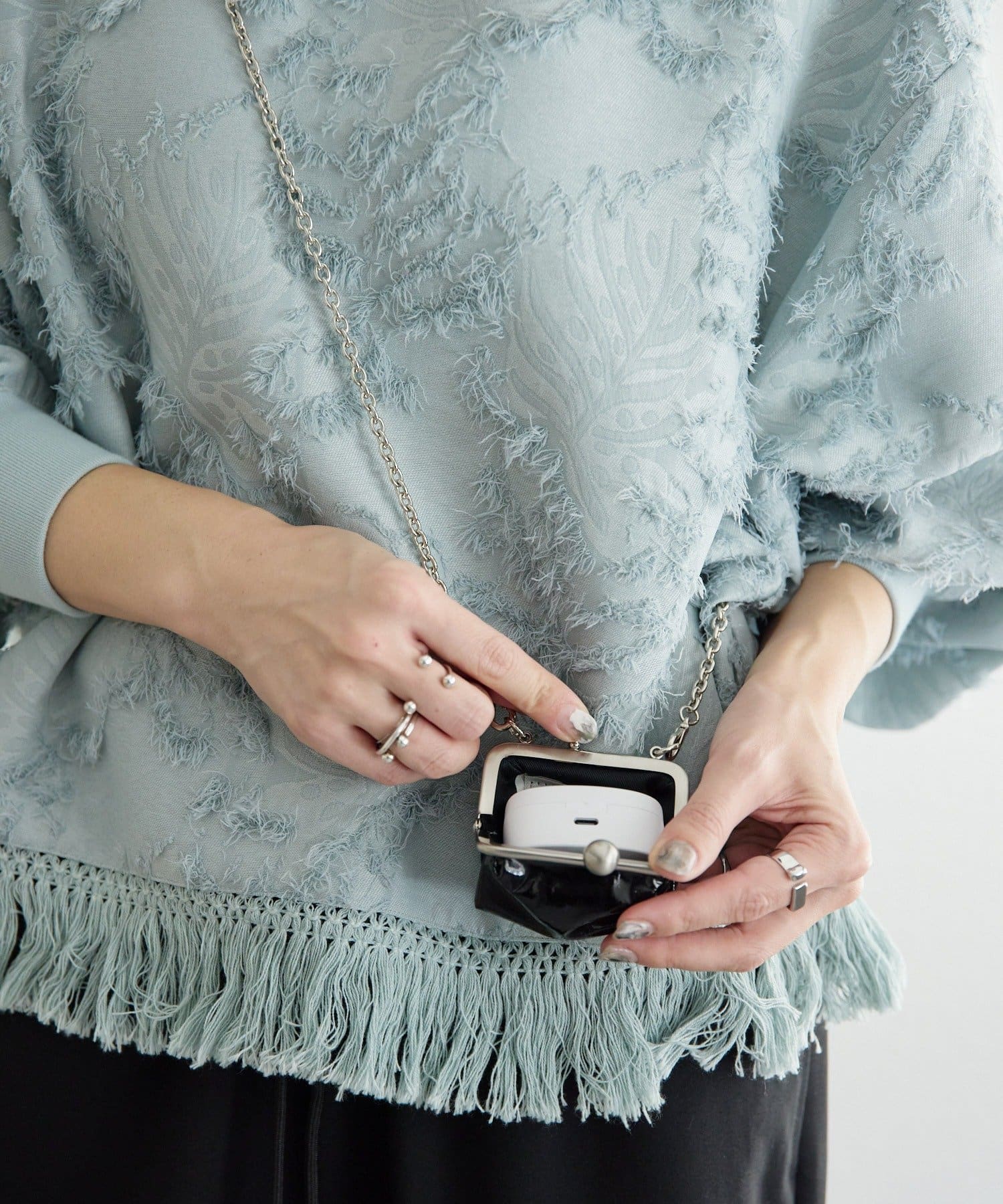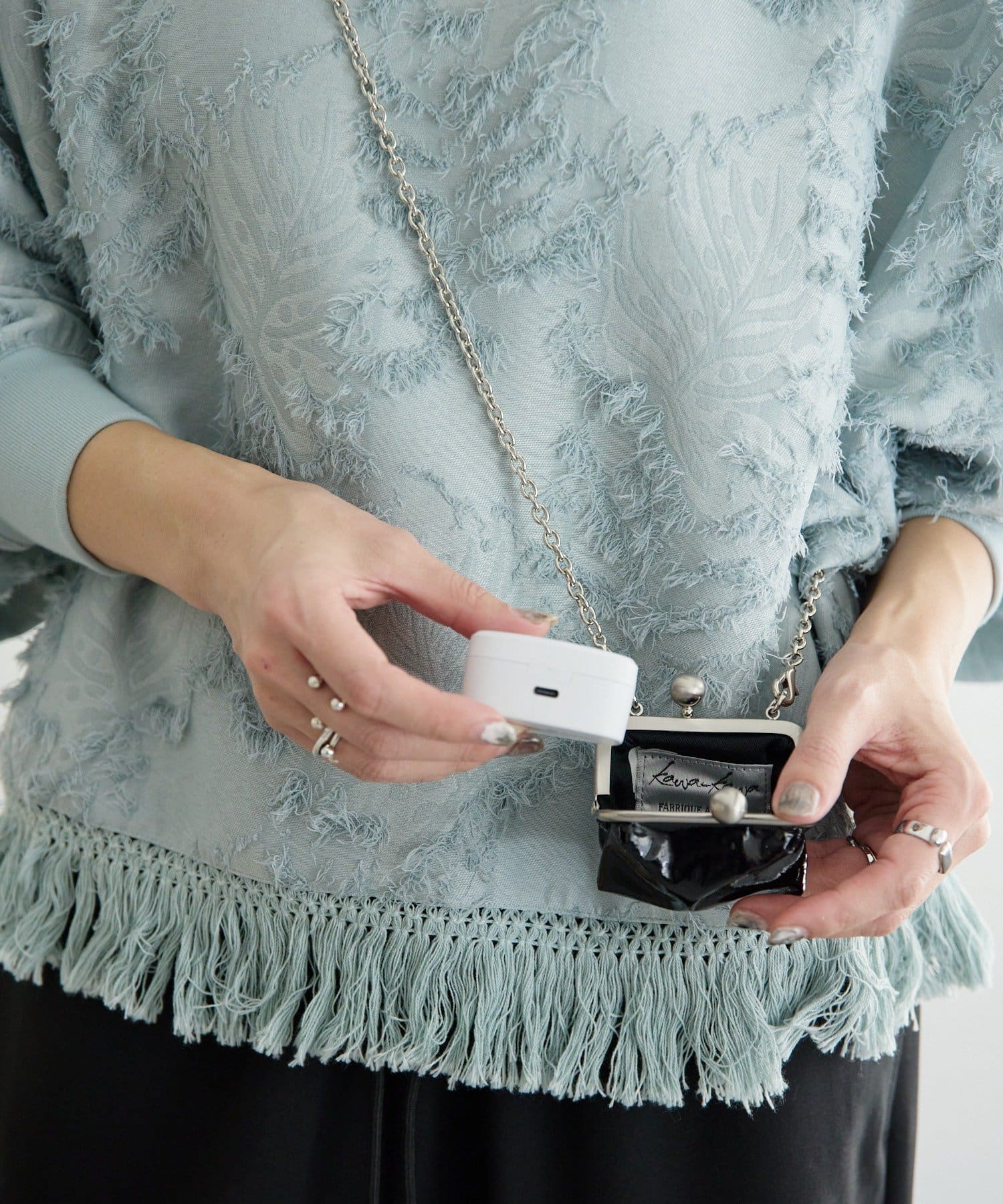 取り外し可能な全長114cmのチェーンを使用しているため、斜め掛けでアクセサリー感覚で着用できます。
