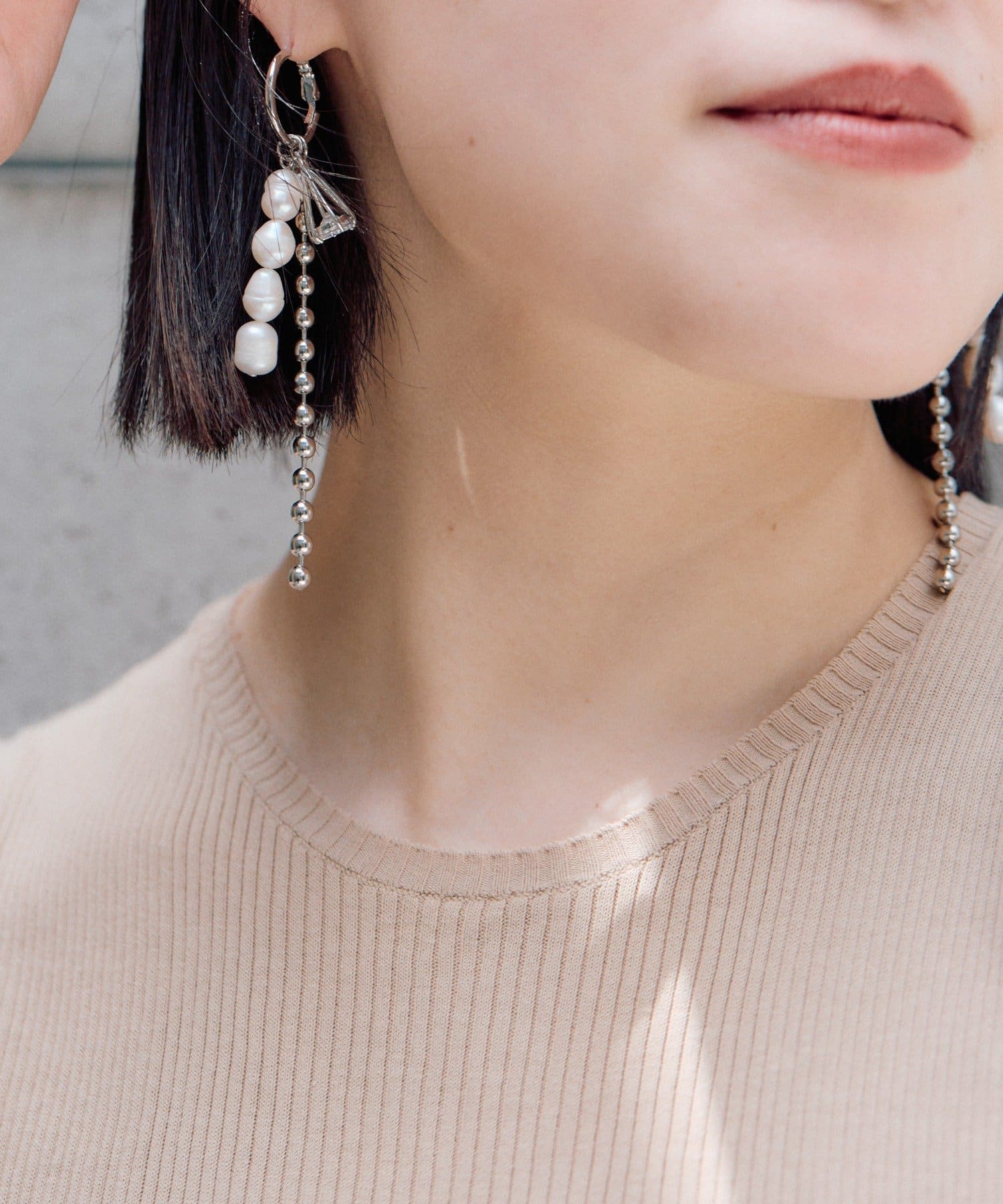 ・淡水パールとクリスタルにボールチェーンという、相反するテイストのパーツが合わさったボリュームピアス