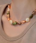 • モスグリーン/シェルをパール系のカラーで塗装したパーツをつなげたネックレス