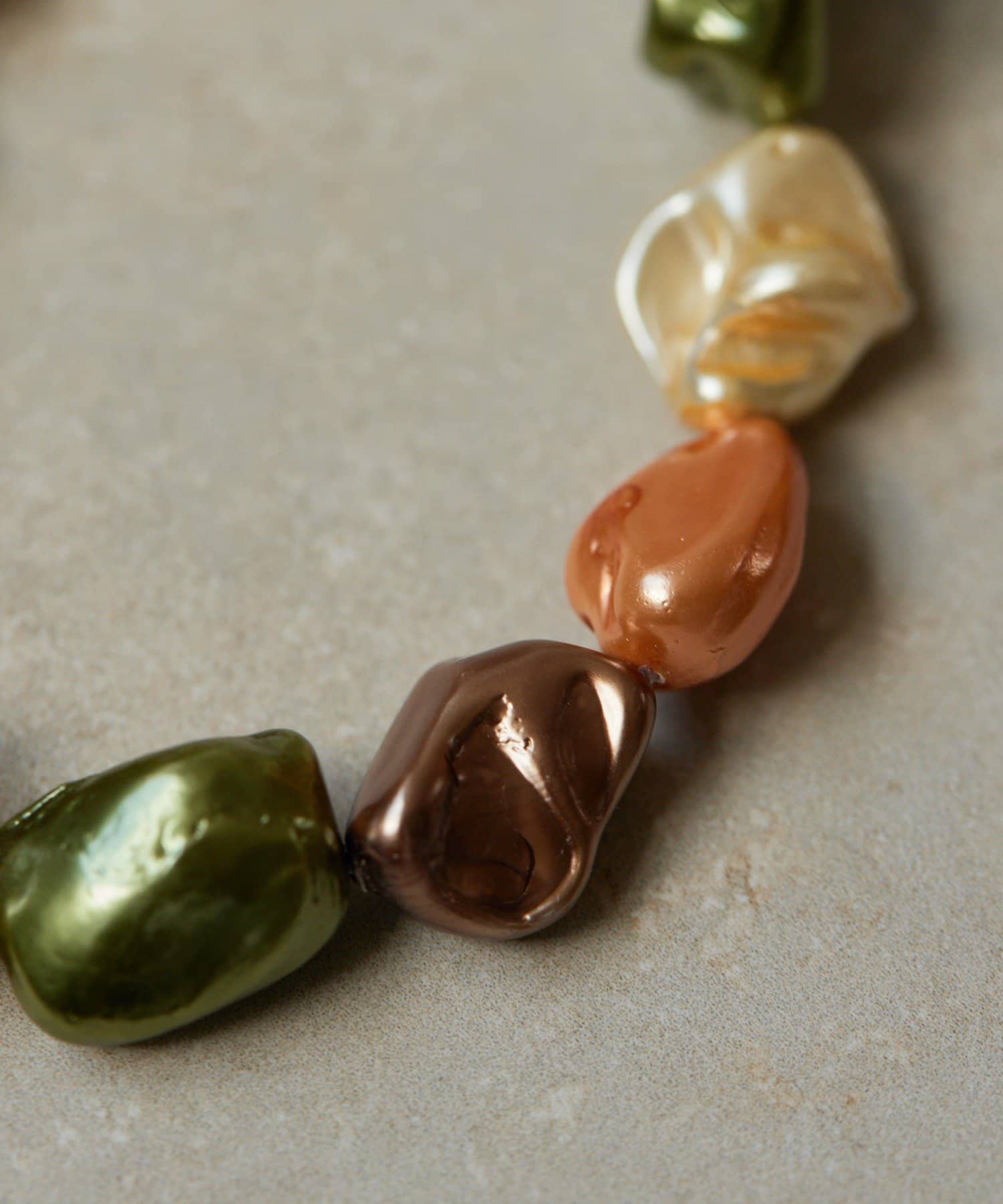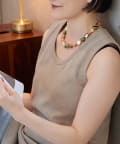 シェルをベースにパールカラーを施したネックレスは、デコルテにリュクスな輝きを添えます。