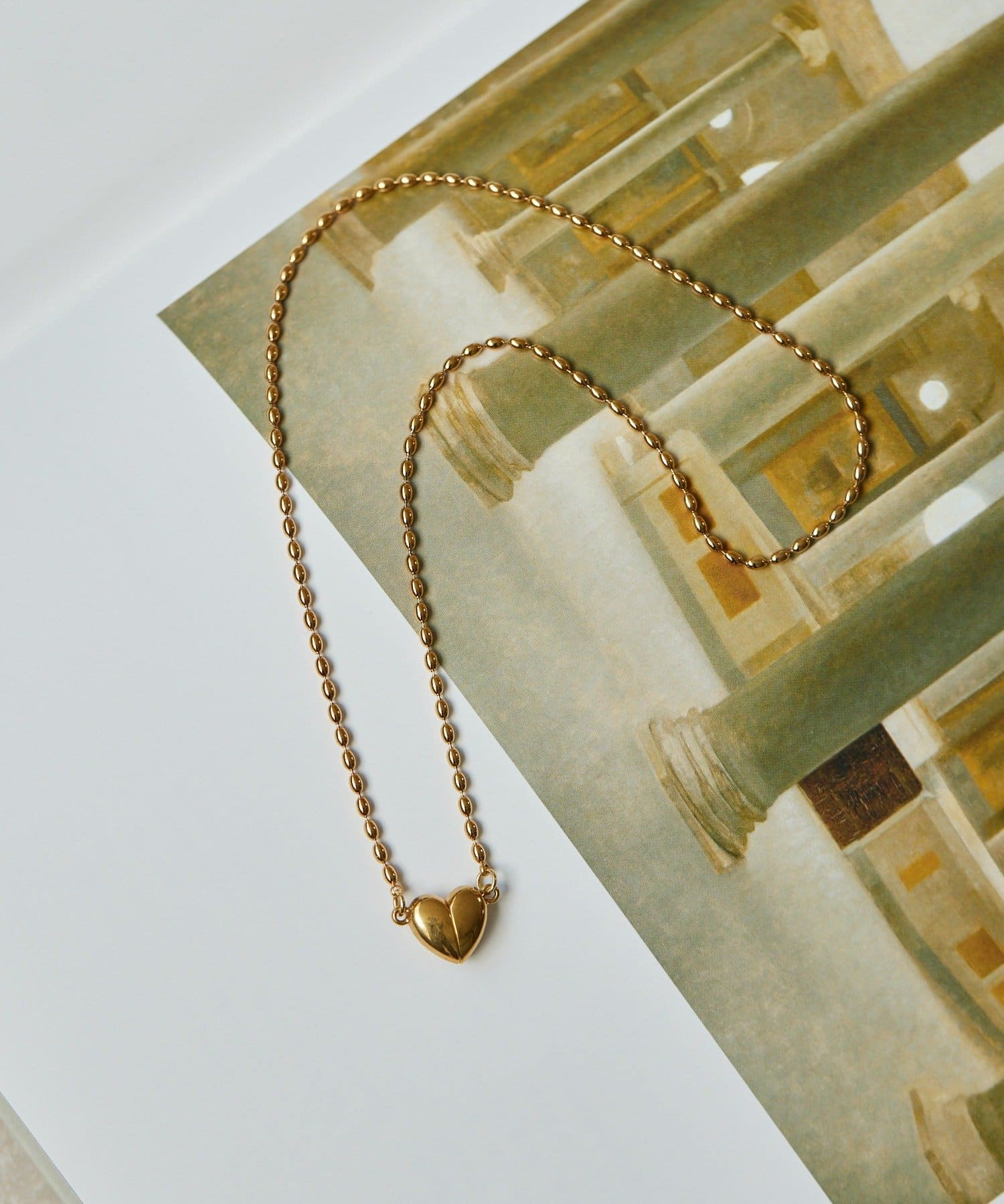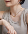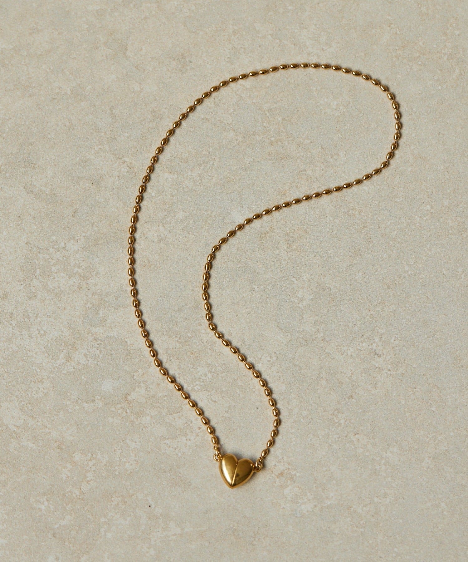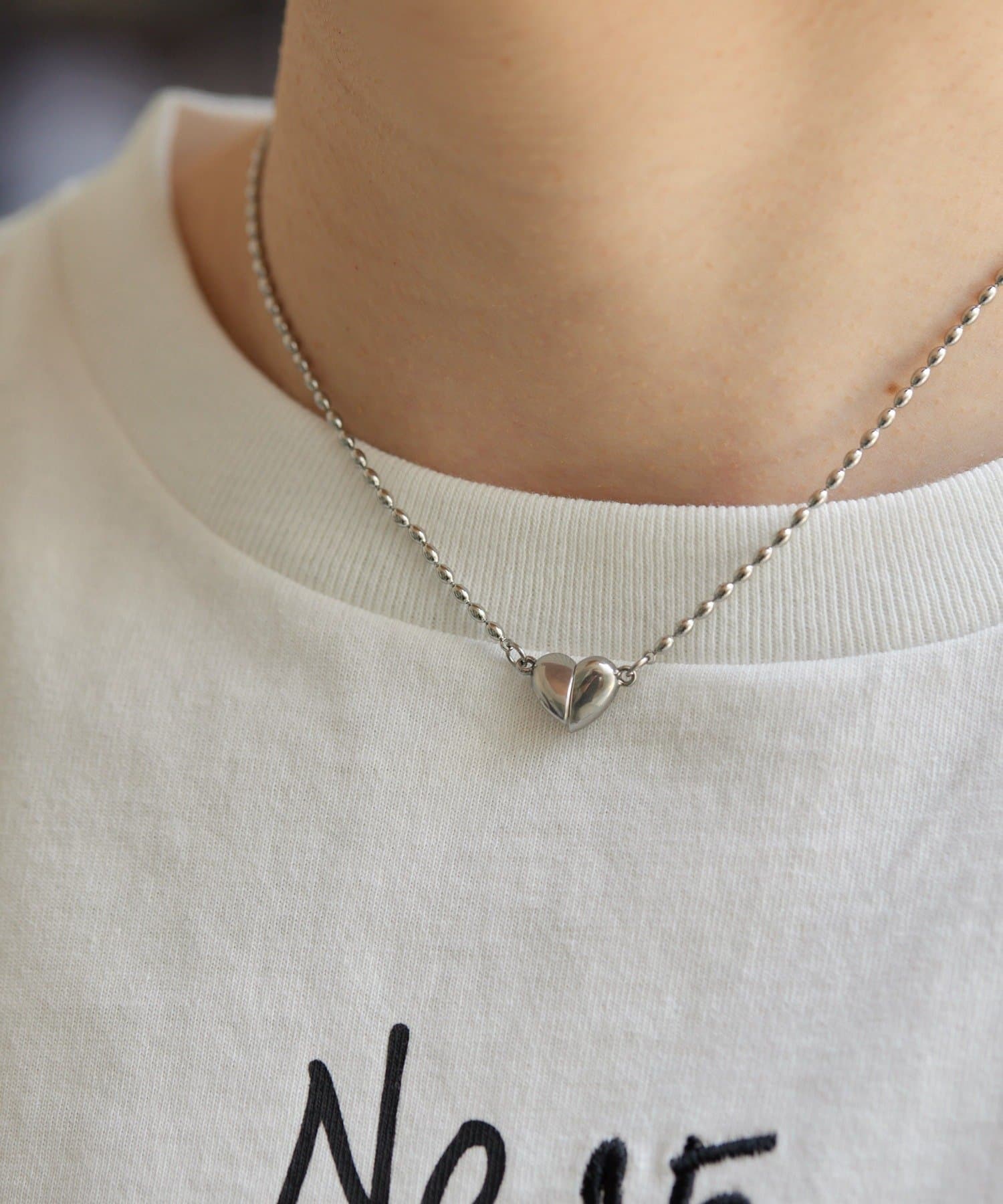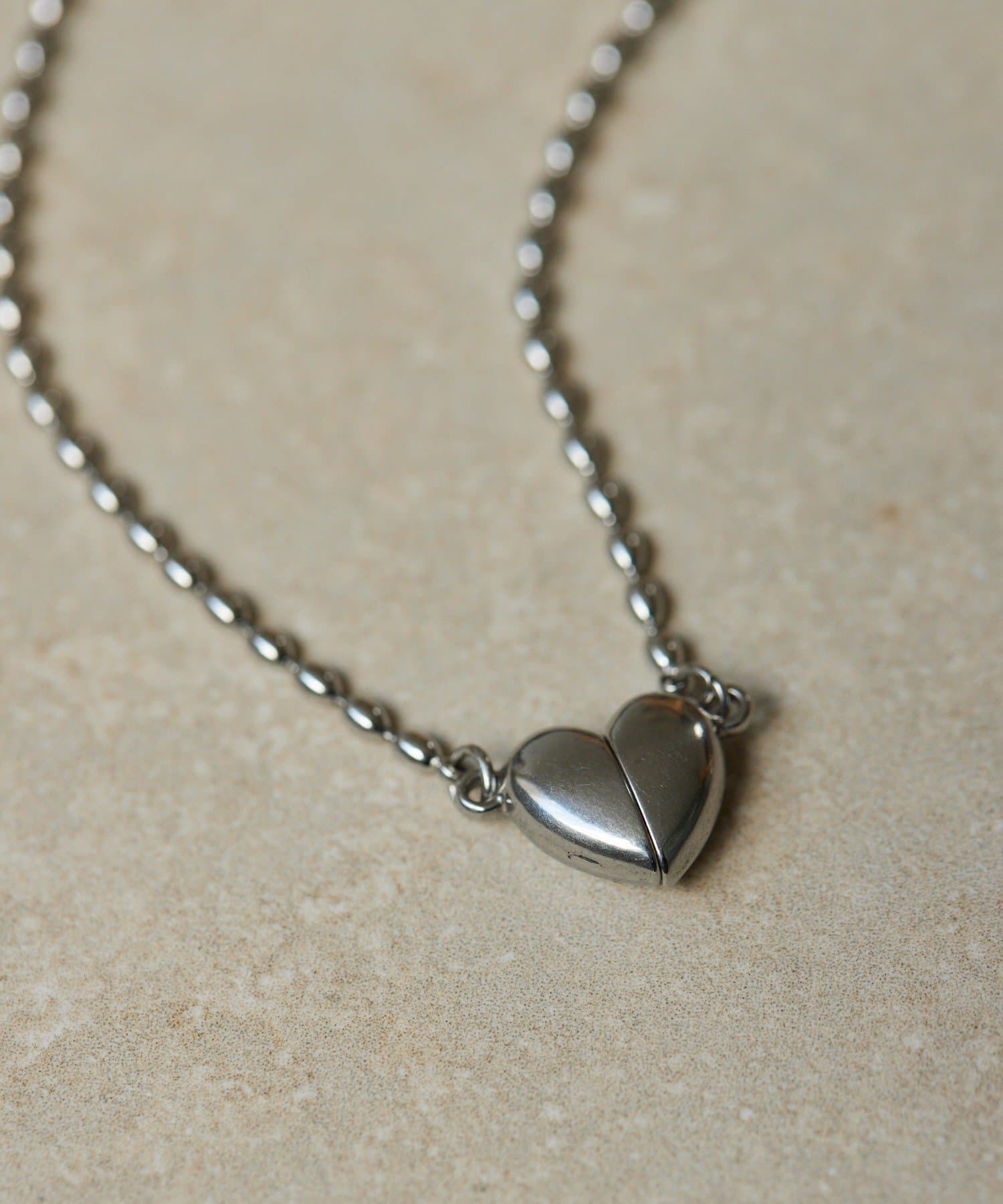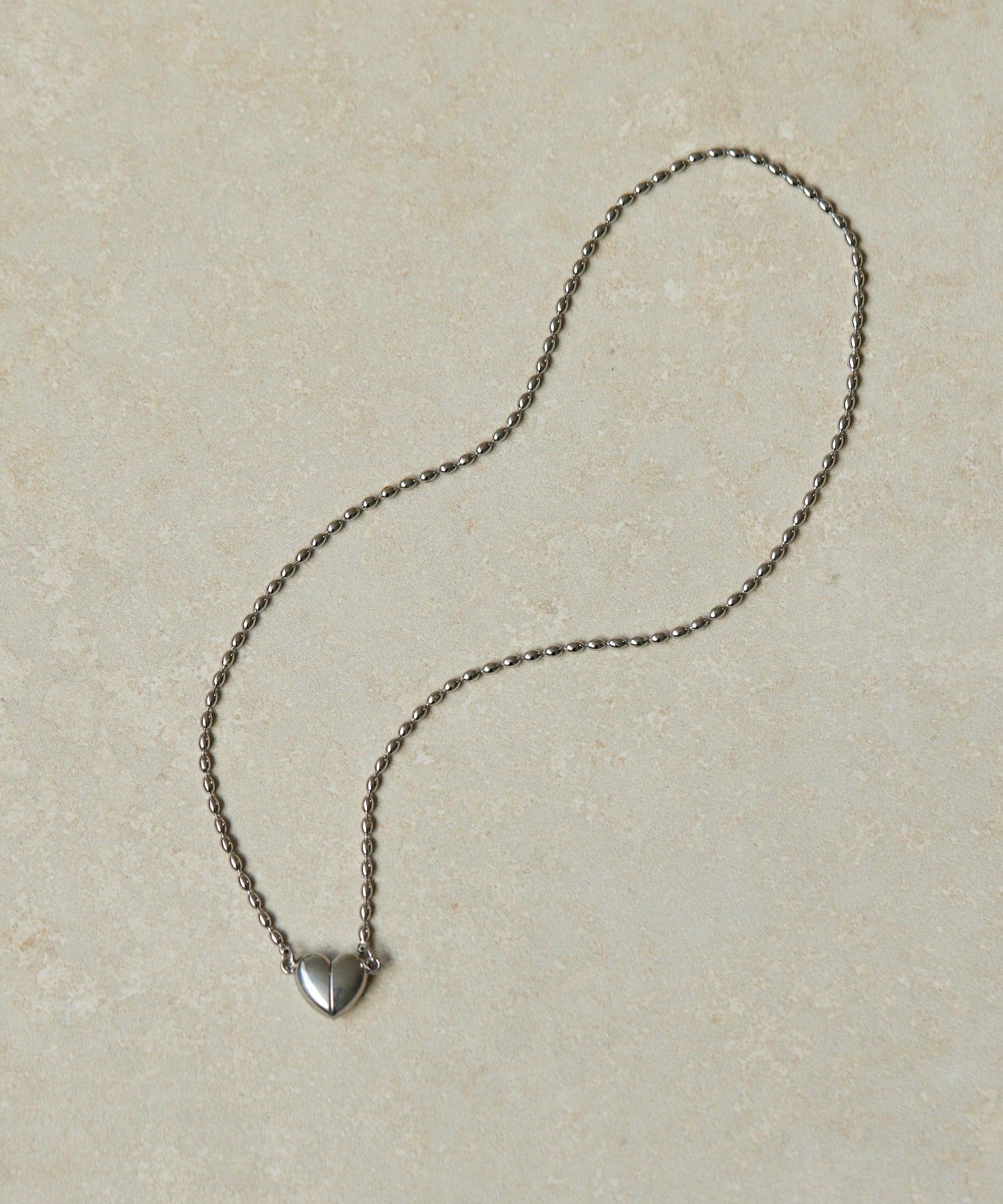 ・なつめ型のボールチェーンを使用したシンプルなネックは、ハート型の留め金具がポイント