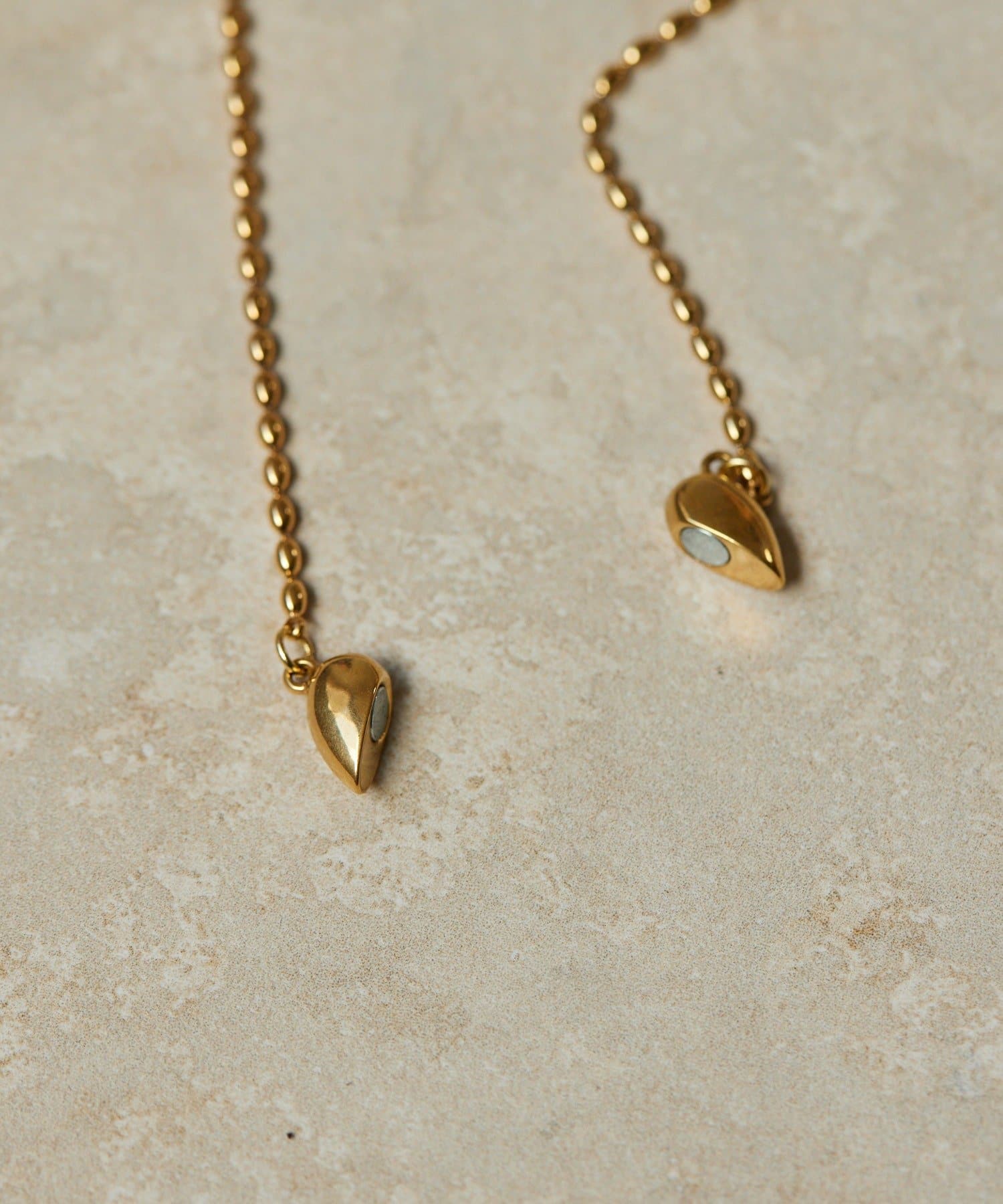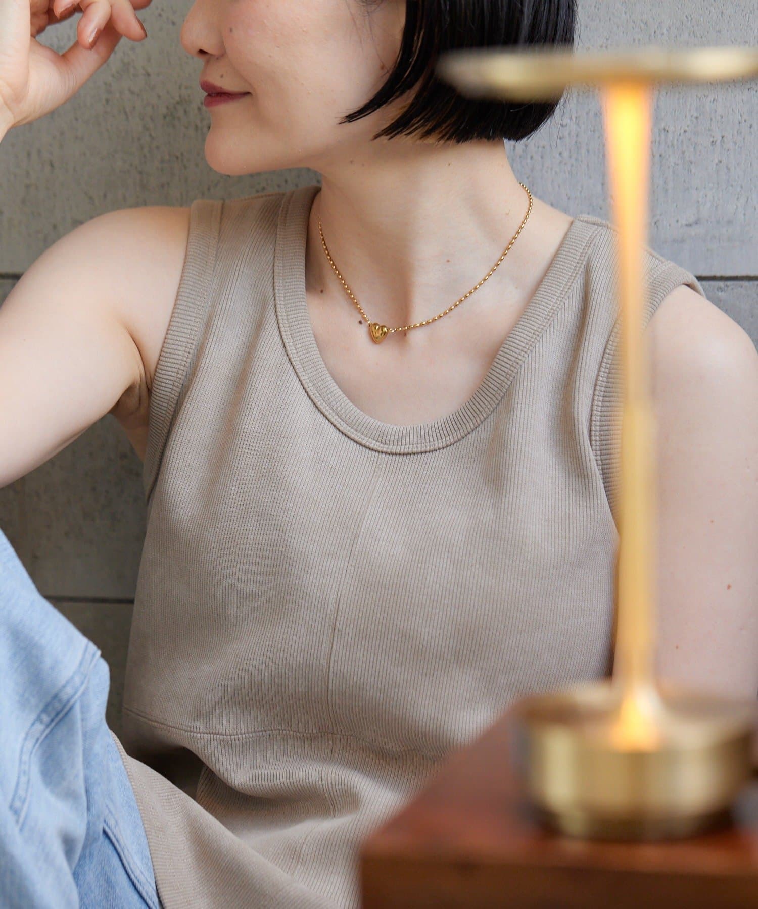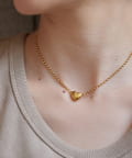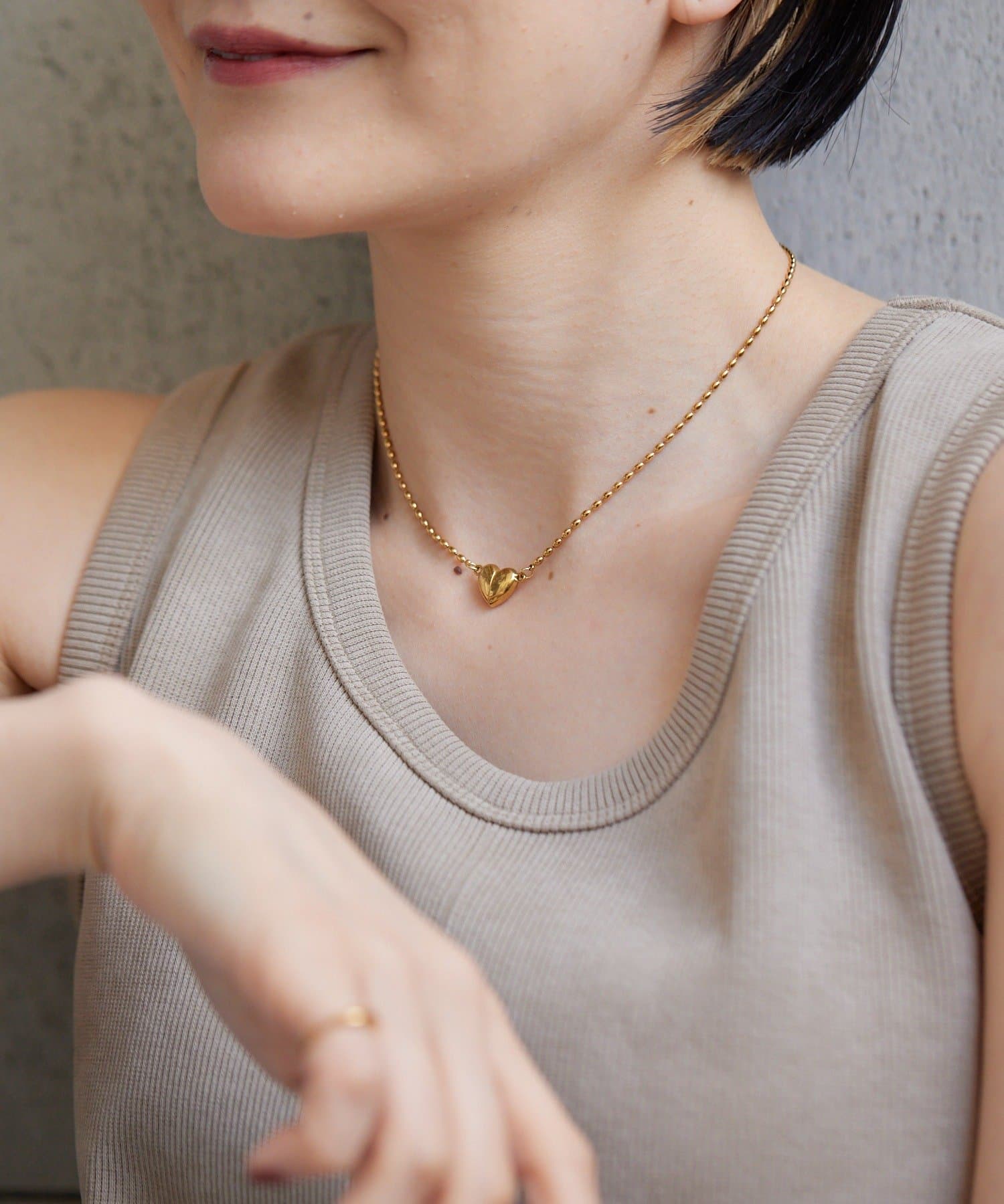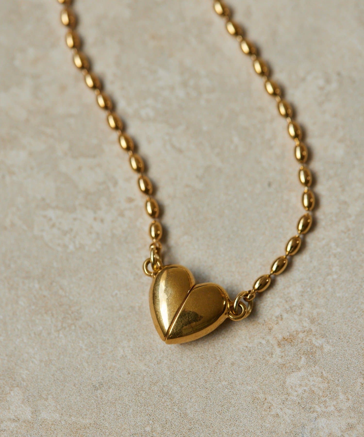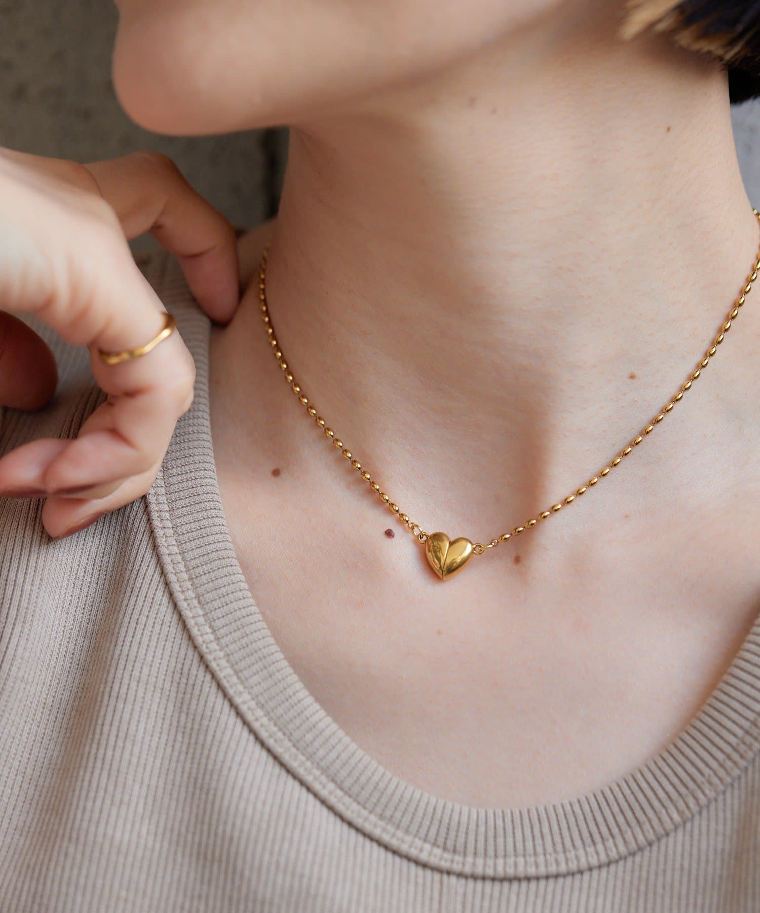 ・なつめ型のボールチェーンを使用したシンプルなネックは、ハート型の留め金具がポイント