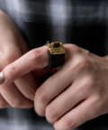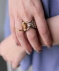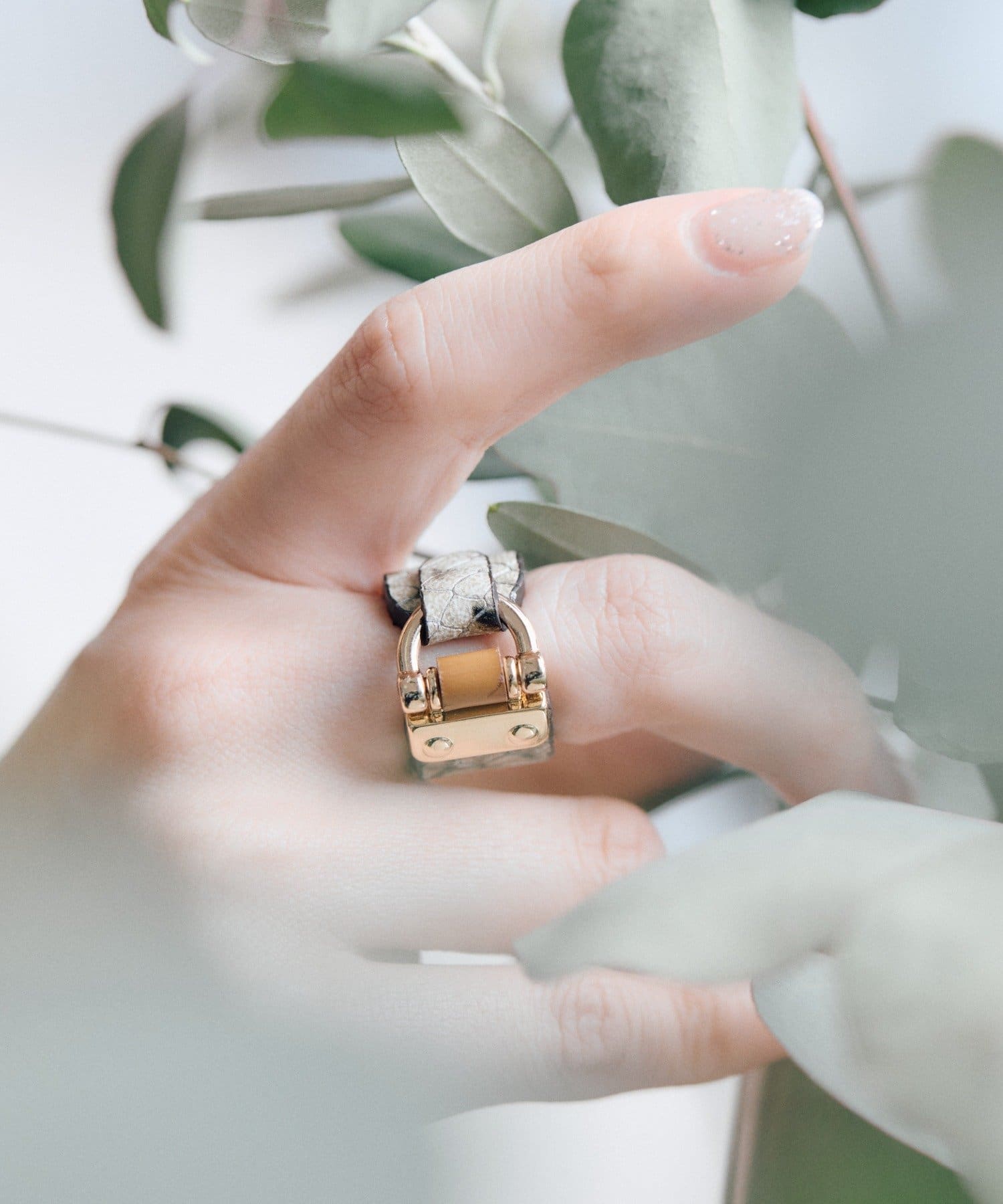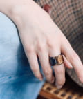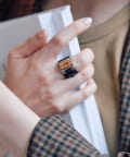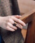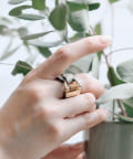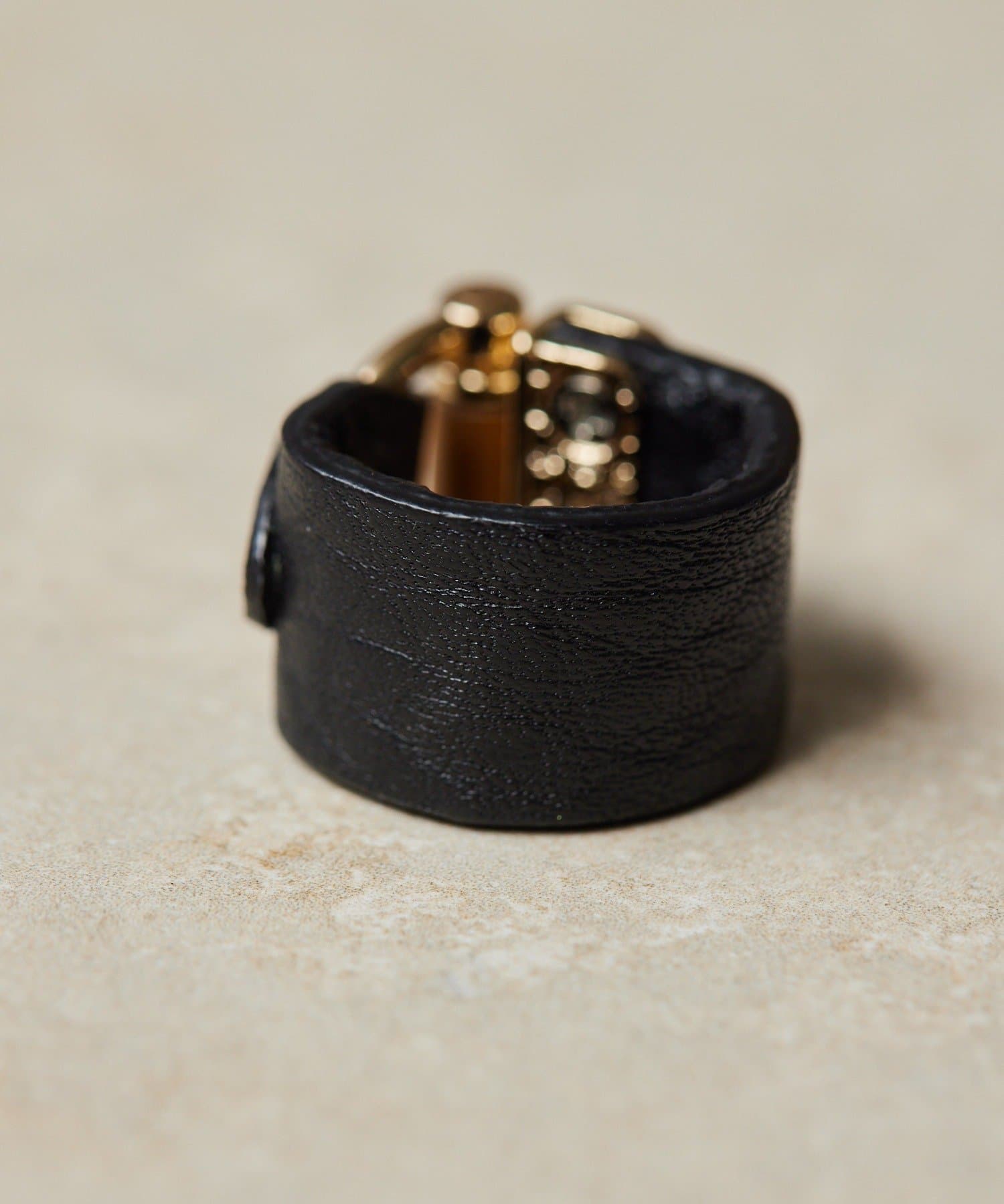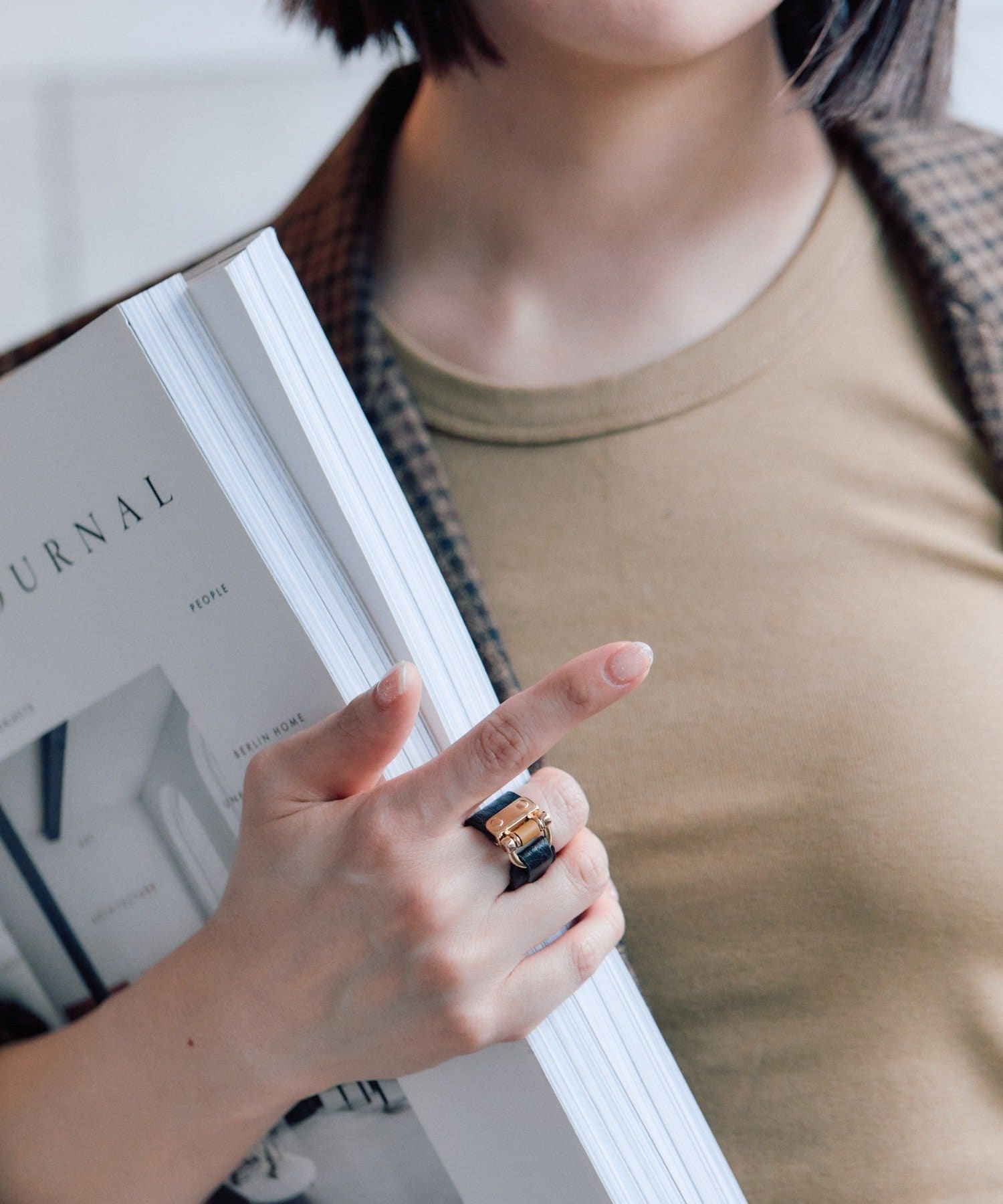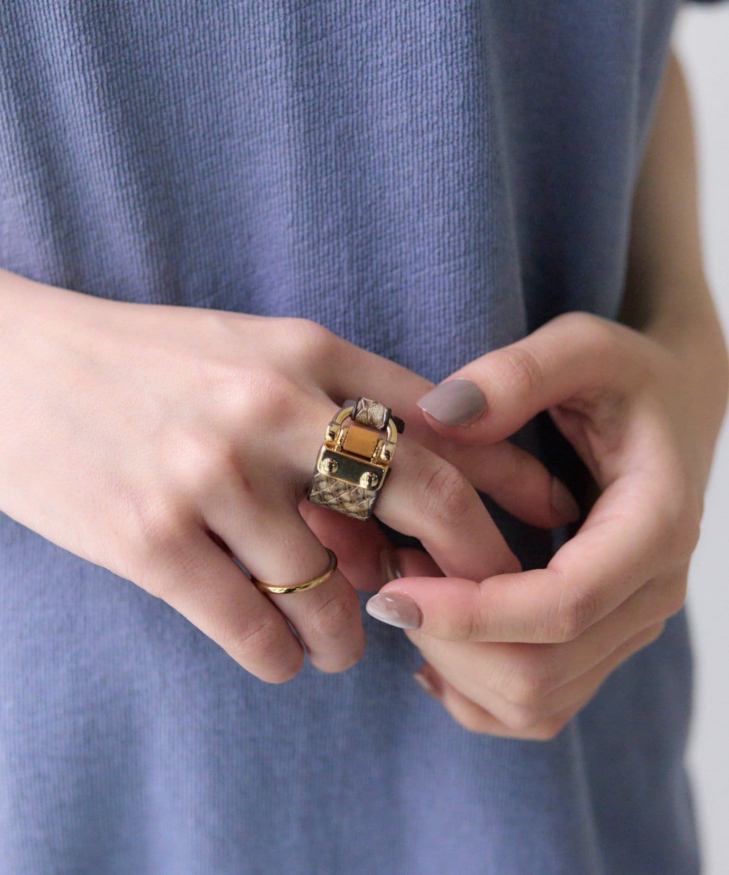 まるで小さなベルトを指に巻いたような、遊び心あふれるリング。